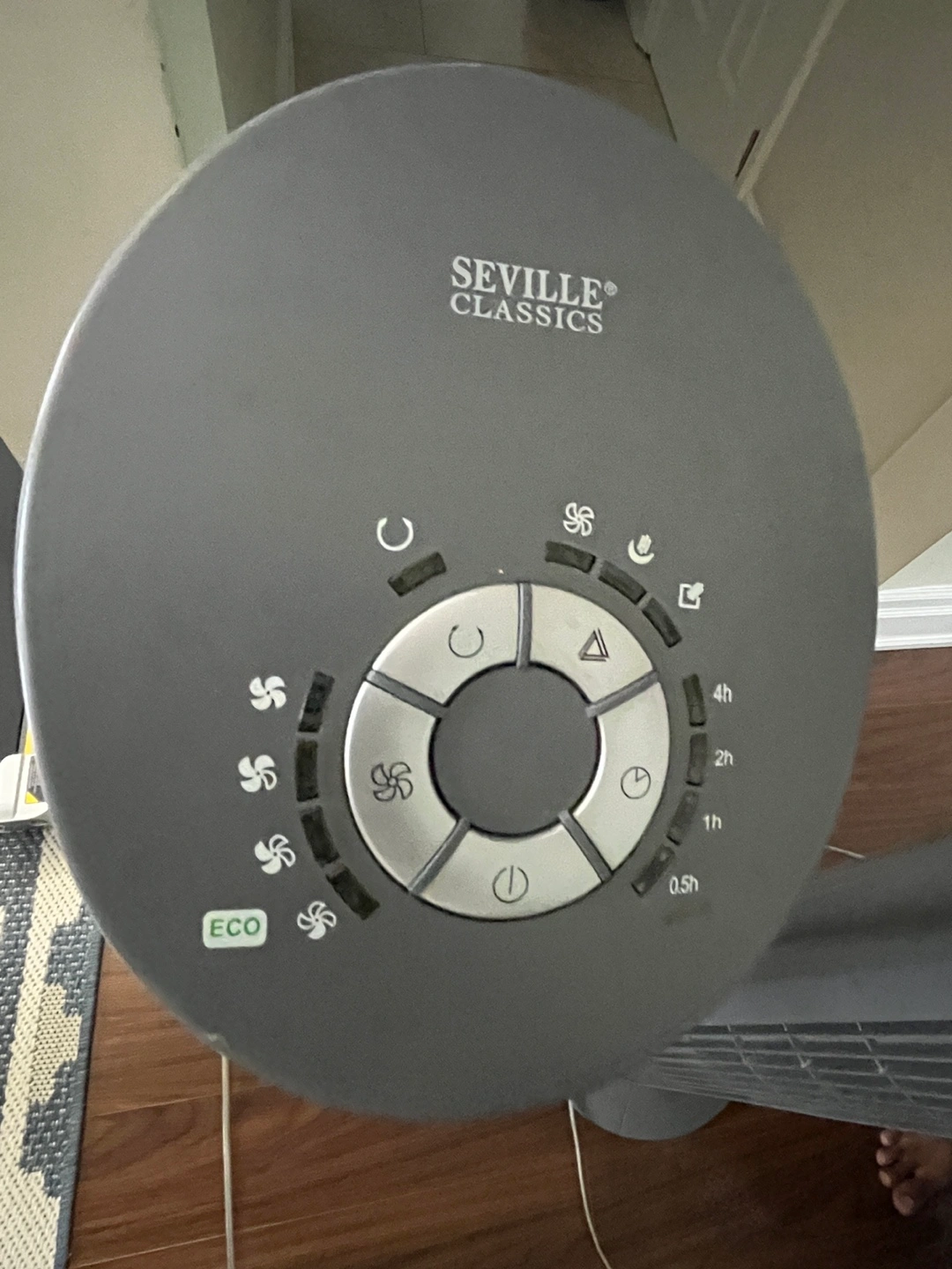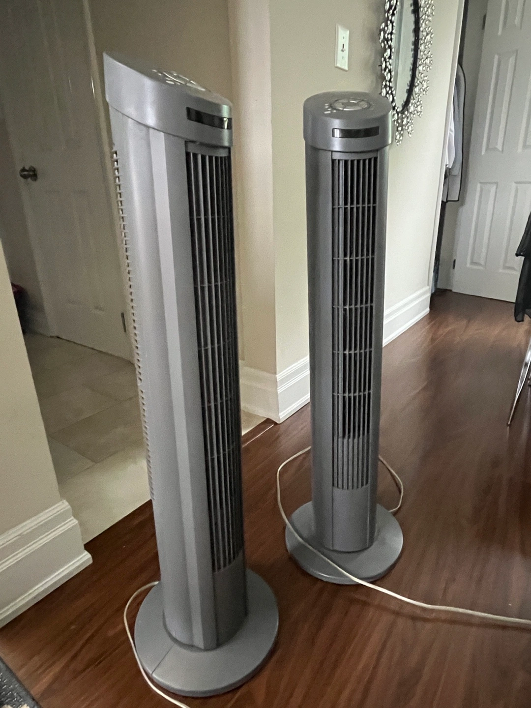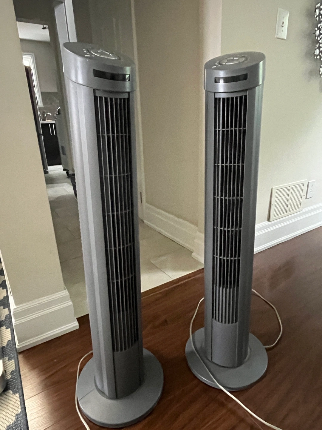 Two grey tower fans. Oscillating function. Multiple speed settings. Timer function. Eco mode. 1 for 20$
