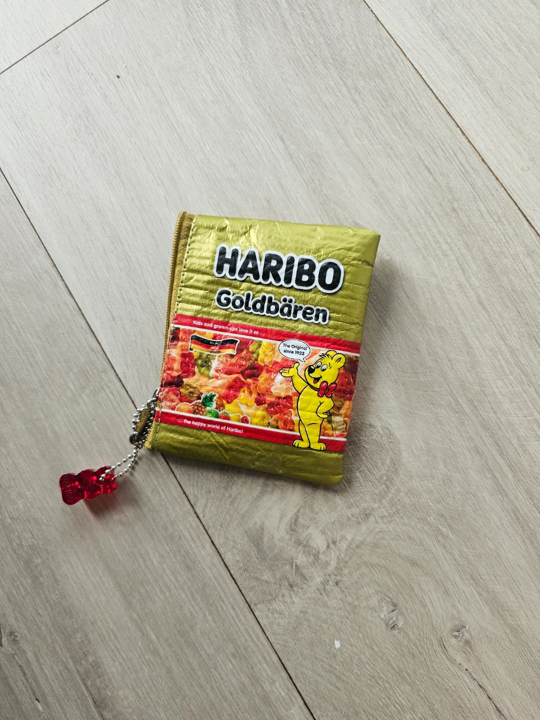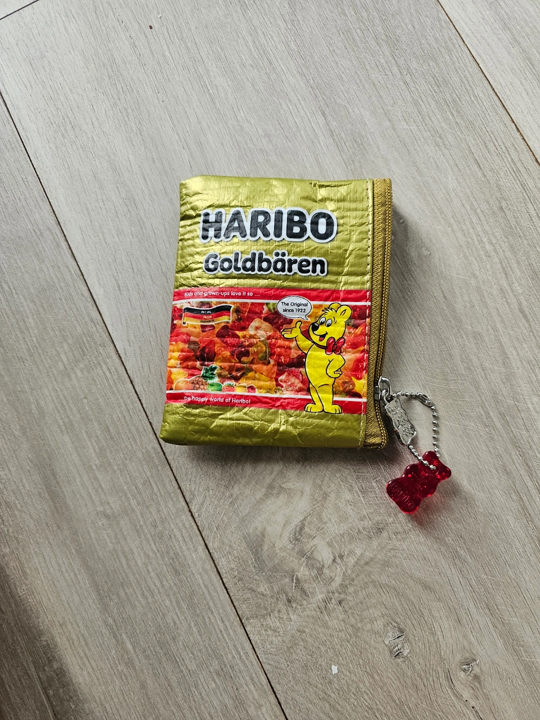 Cute gold pouch featuring HARIBO Goldbären branding. Zipper closure. Small keychain attached. Great for small items. like coin, card or earphone. 8.5x10.5x2cm
