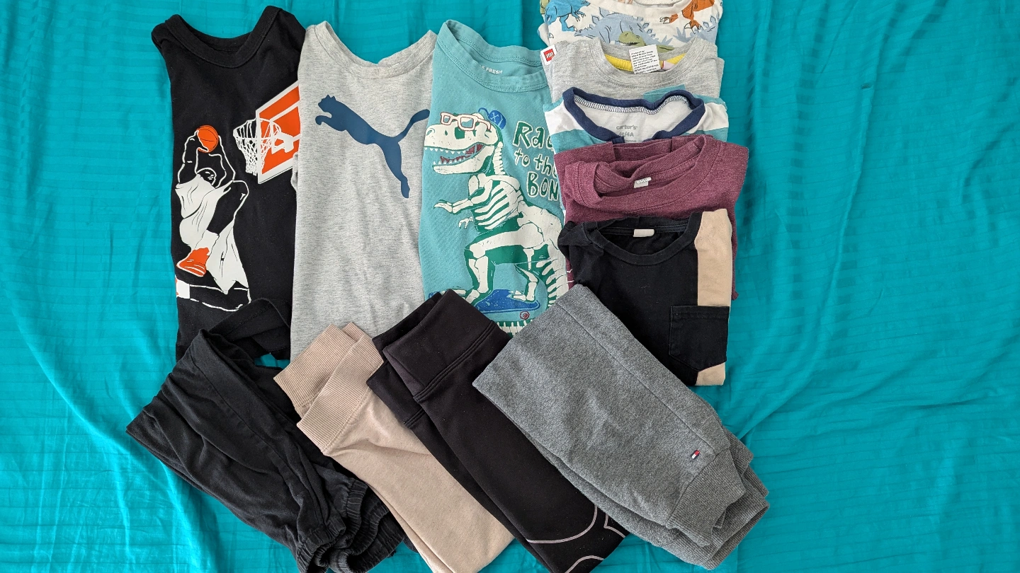Large bundle of boys' clothing. Includes several tops and bottoms. Various colours and styles. Great for everyday wear. 4YO sizes.