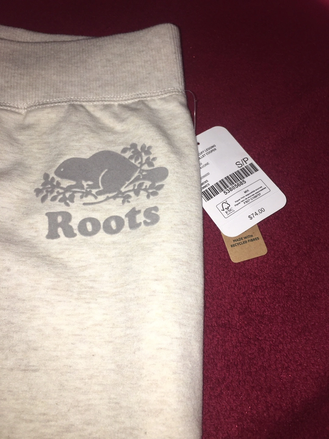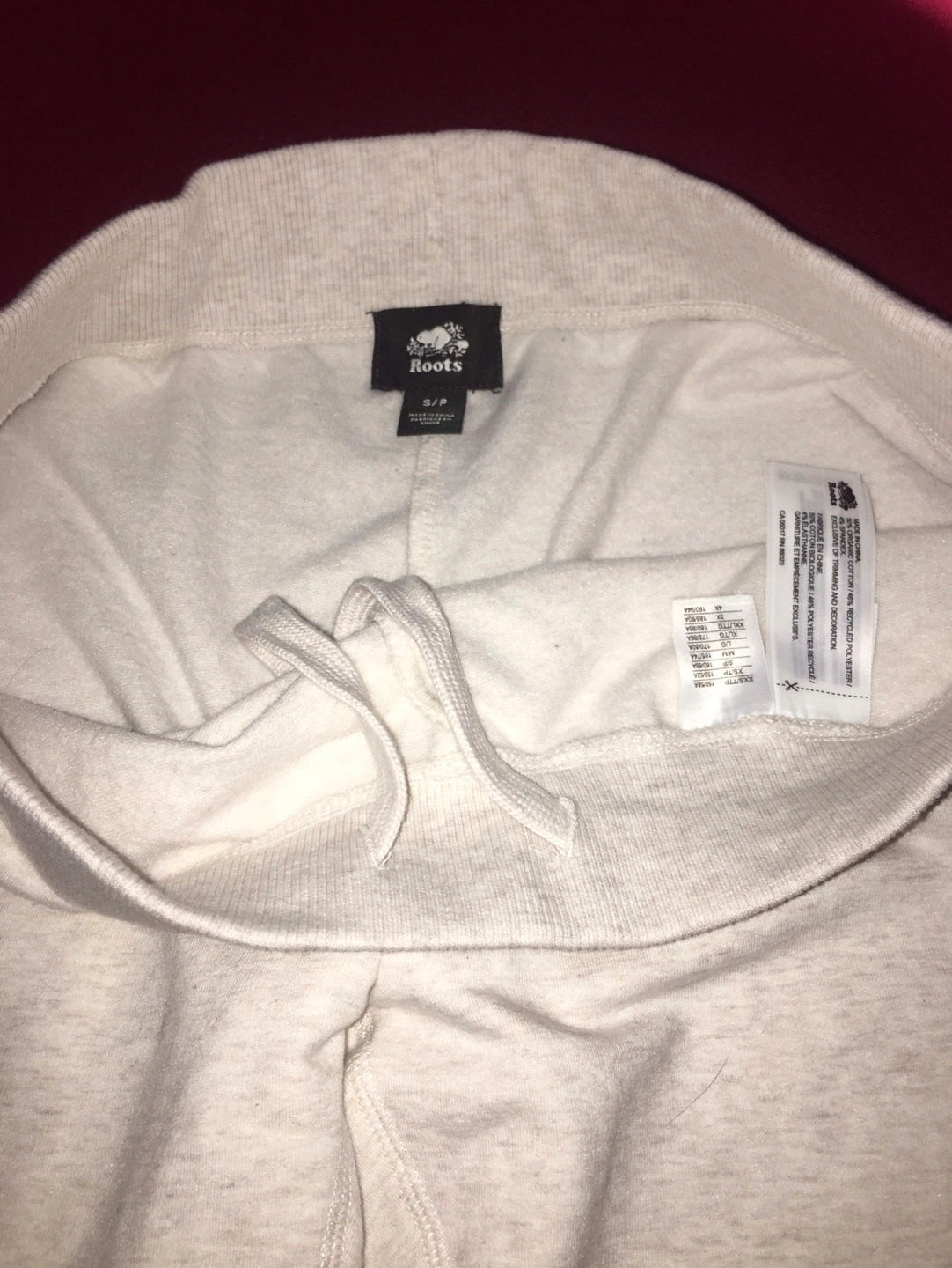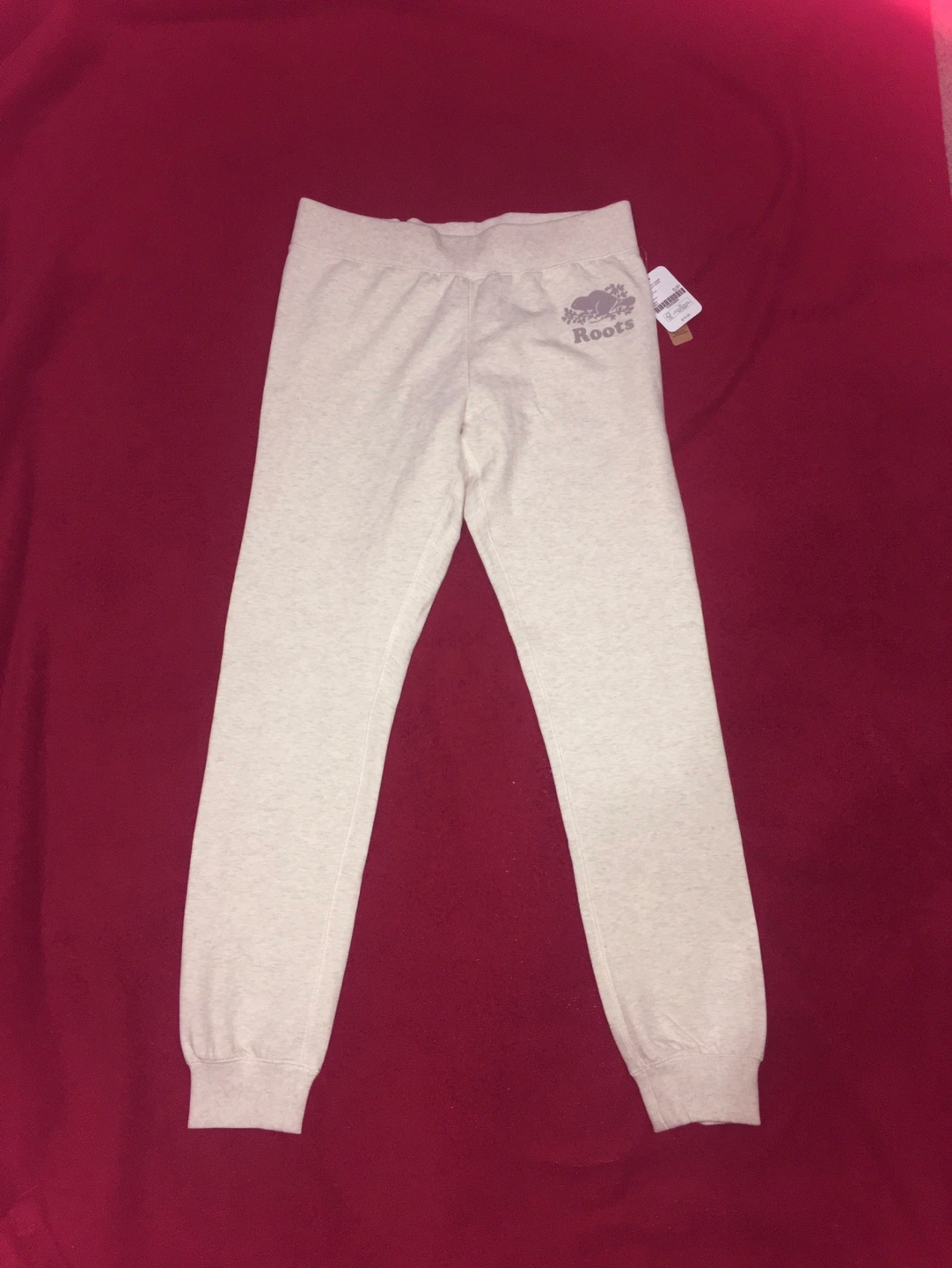 Women's size small Roots joggers. Off-white colour. Made with recycled fibres. New with tags. Pick up at Southgate Mall after 6pm on weekdays, weekends between 5-6pm Cash only