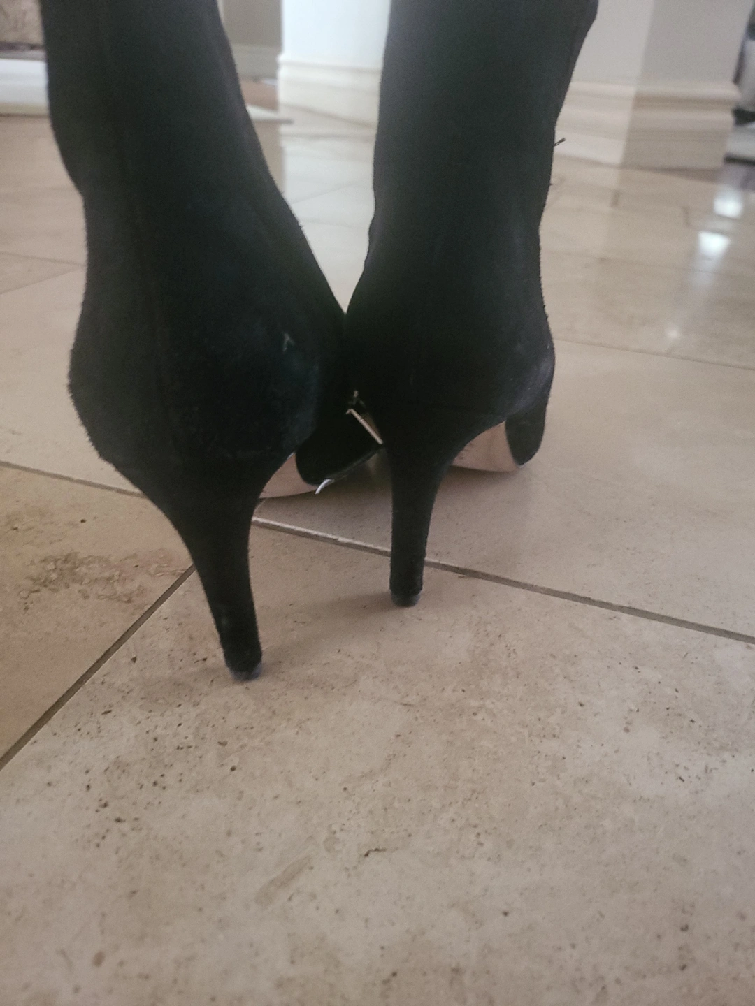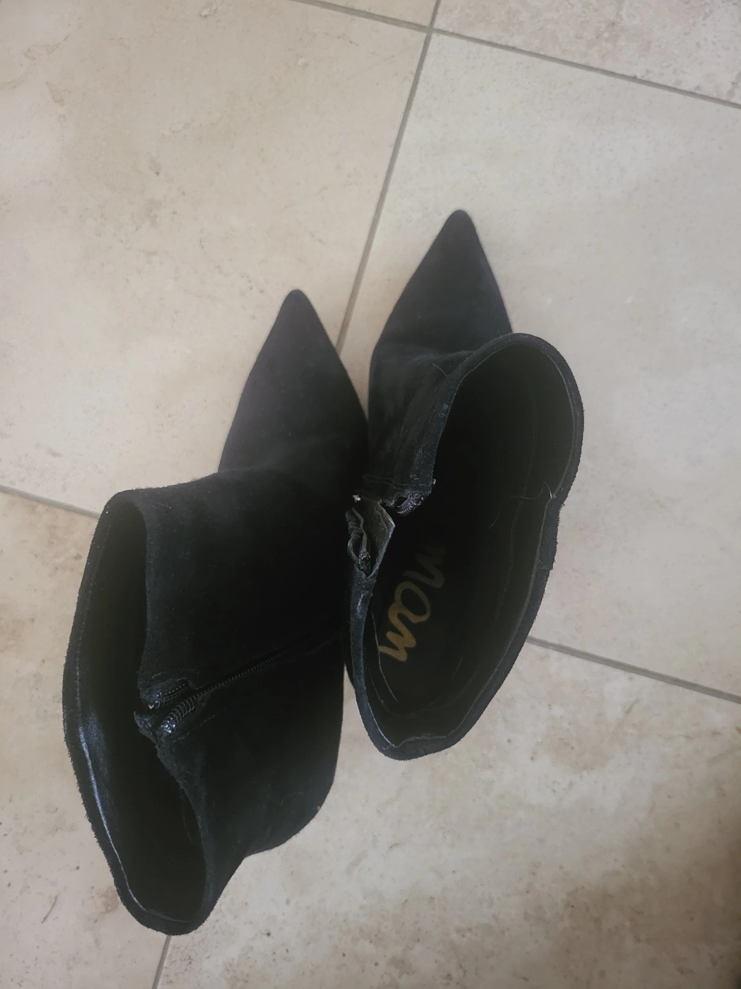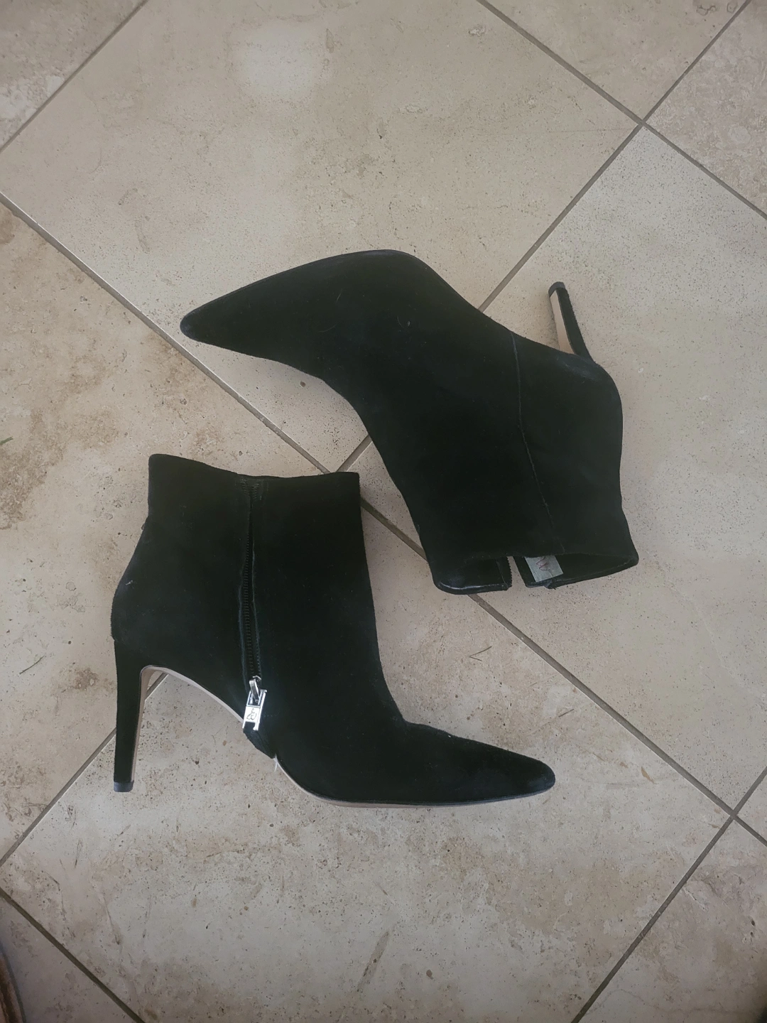 Pair of black suede ankle boots. Pointed toe, stiletto heel, and side zipper. Size 6.5