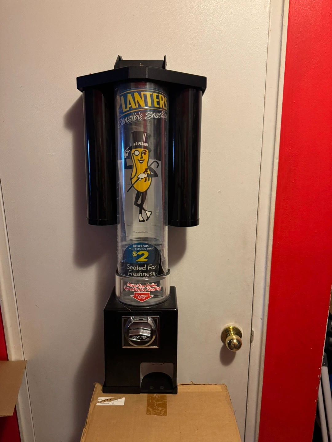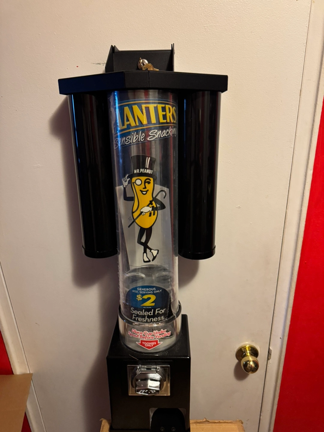 Vintage Planters peanut vending machine. Three Black metal casing. Mr. Peanut branding. Coin-operated. Sealed for freshness.