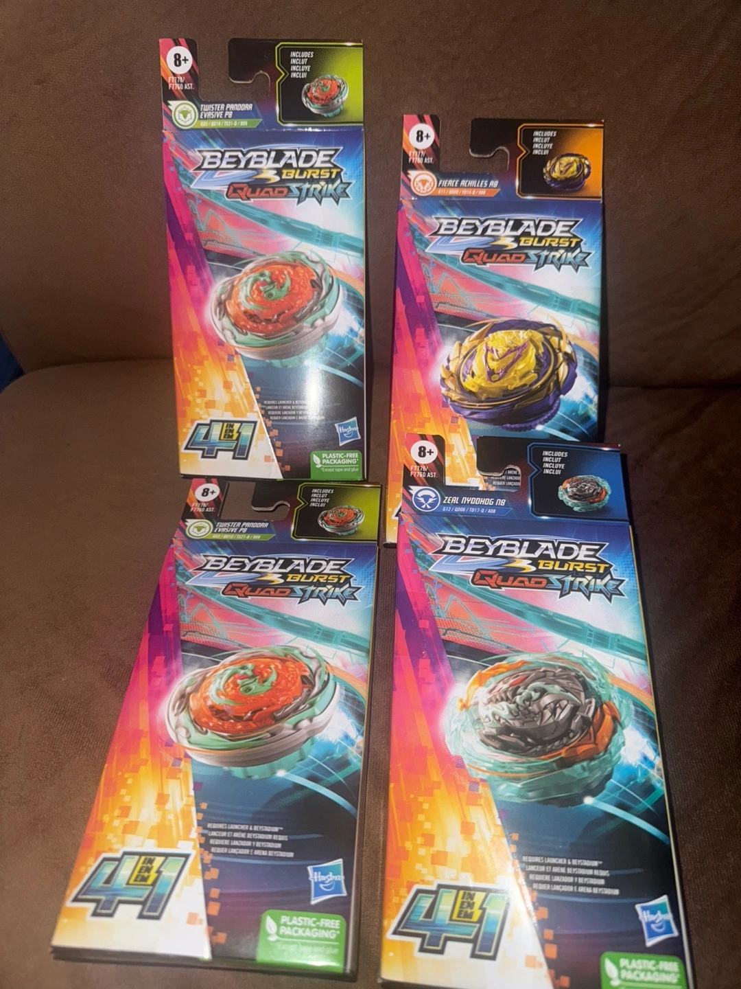 Four sealed Beyblade Burst QuadStrike tops. Includes launchers and beystadium. Plastic-free packaging. Ages 8+
