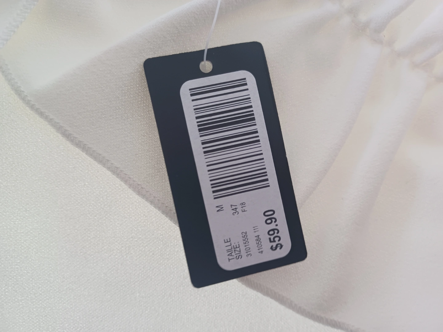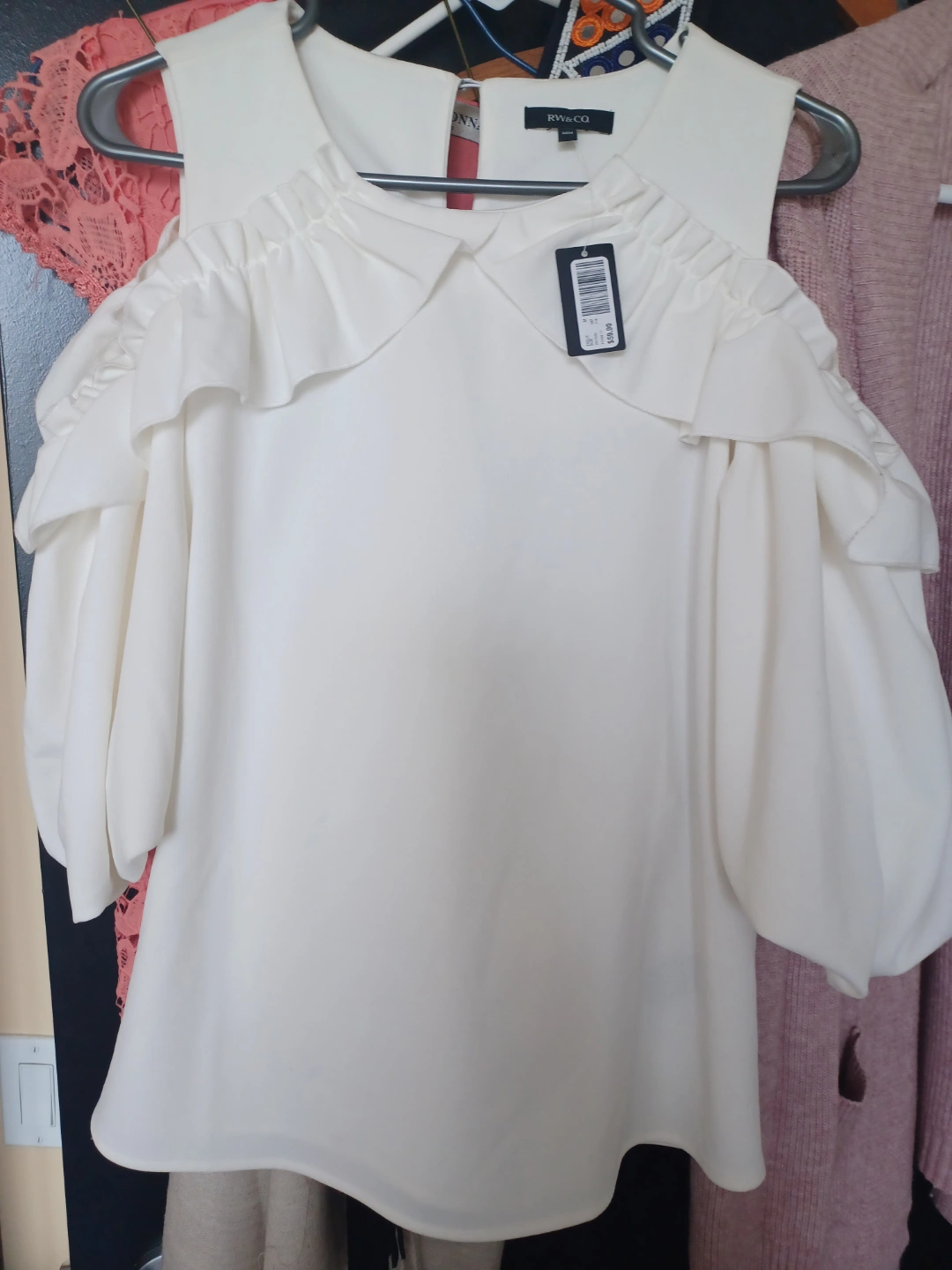 off white coloured cold shoulder off-the-shoulder blouse. Features ruffles and balloon sleeves. Size medium. New with tags. RW and co originally $60, selling for $20 yonge and Sheppard pick up