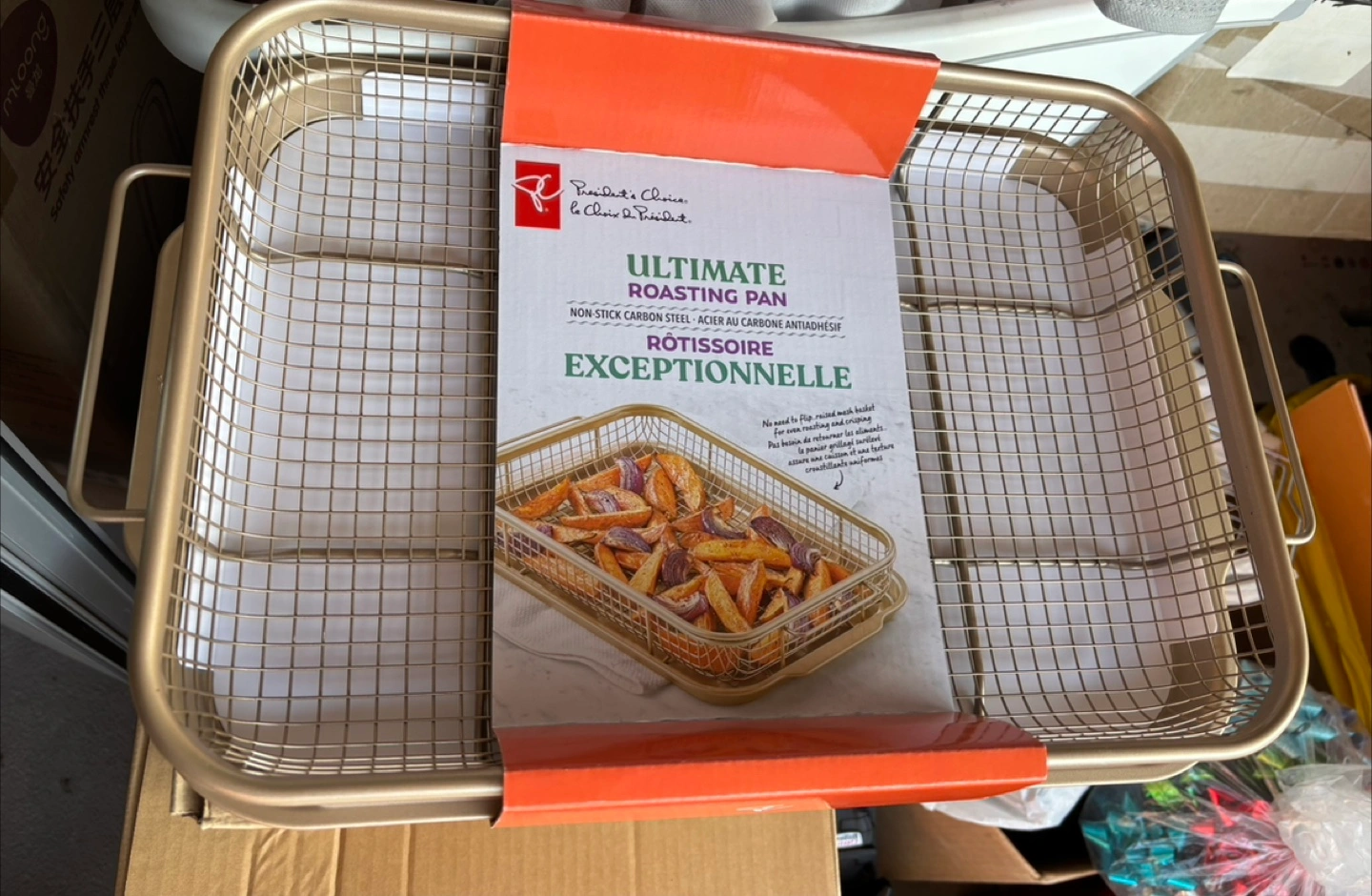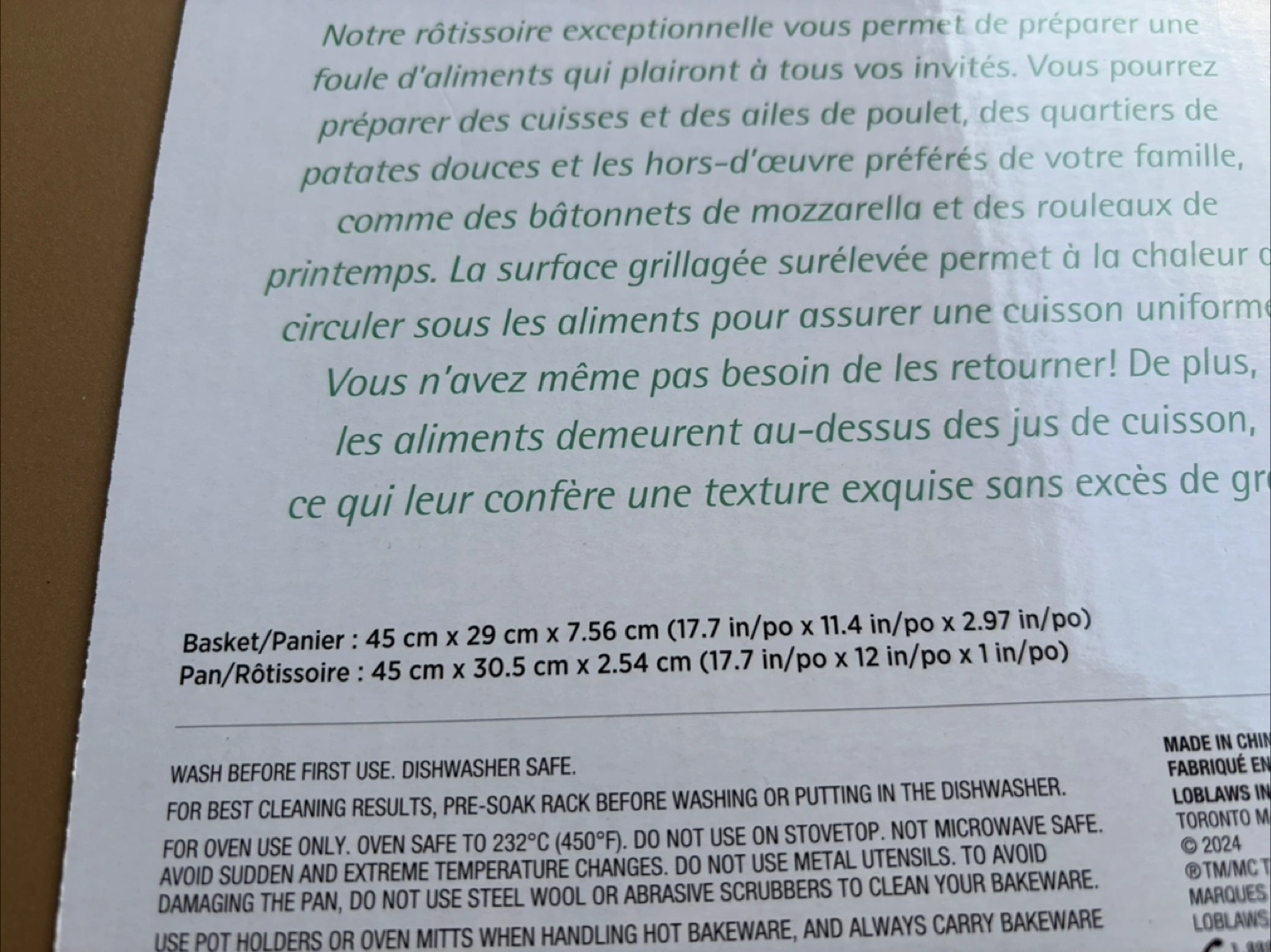 Non-stick carbon steel roasting pan. Includes basket and pan. Dishwasher safe. Great for roasting vegetables, chicken, and more. Size: 45 cm x 29 cm x 7.56 cm. Pick it up near Richmond Centre