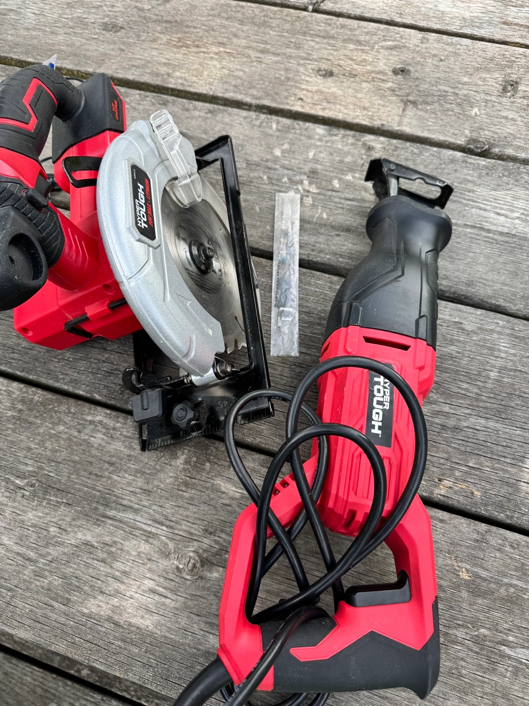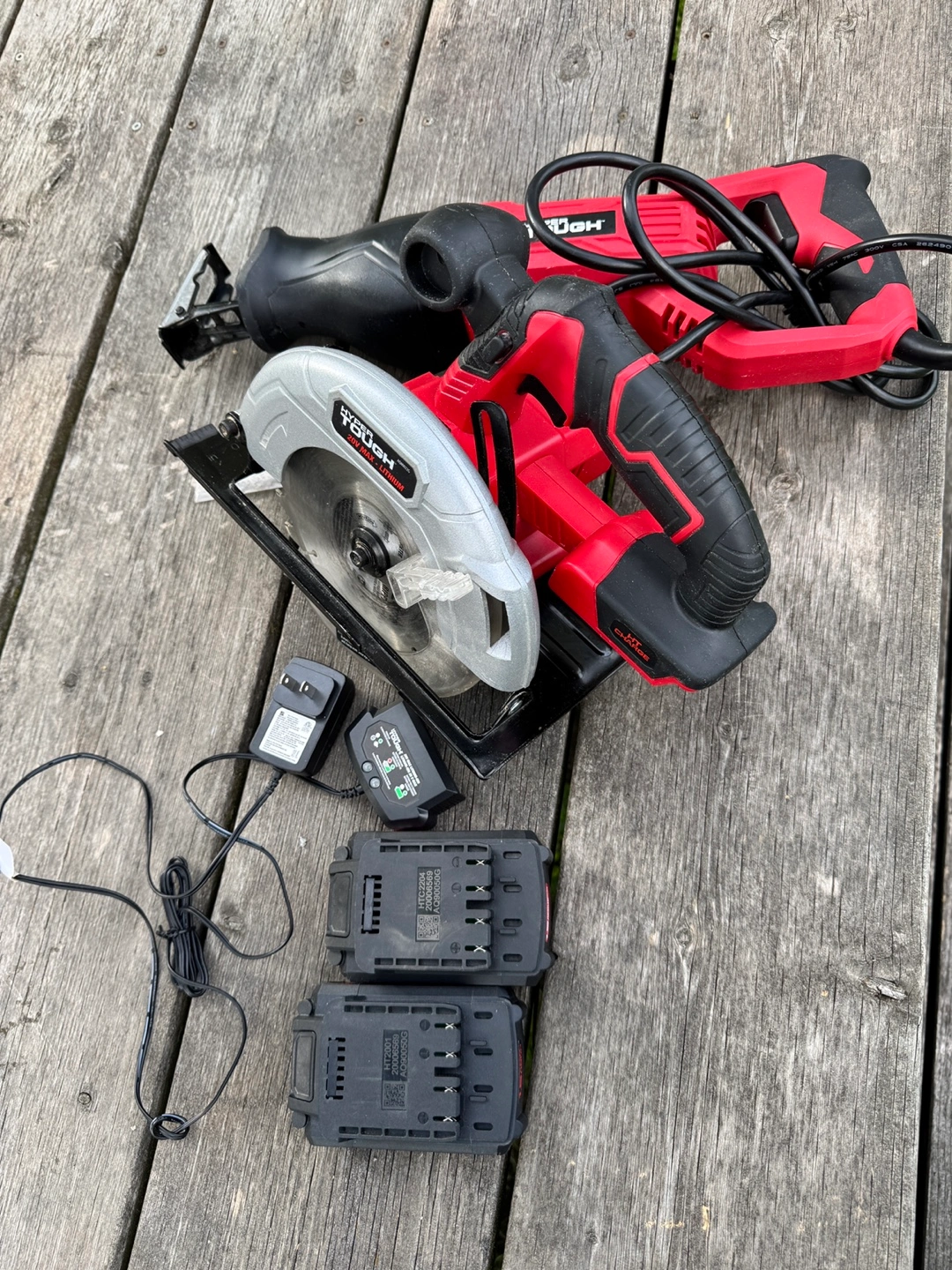 EUC 6 1/2” circle saw, reciprocal saw, impact drill and drill. My husband bought it to complete the kids playhouse. No longer needed. Saw is cordless and will come with 2 batteries/charger and the reciprocal saw is corded. The drills are cordless too. So total of 4 batteries and 2 chargers will be included. See pictures for reference. Pick up in Bradford. * Cordless circular saw: 6-1/2 inch (165mm), 20V Max * Compact reciprocating saw: 120V ~ 60 Hz, 6.5A Given the saws and drills are used, I'm pricing them at $140, a fair price for tools that still have a lot of life left.