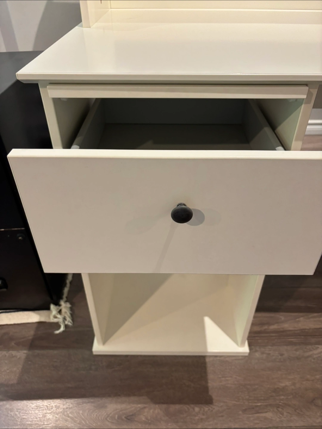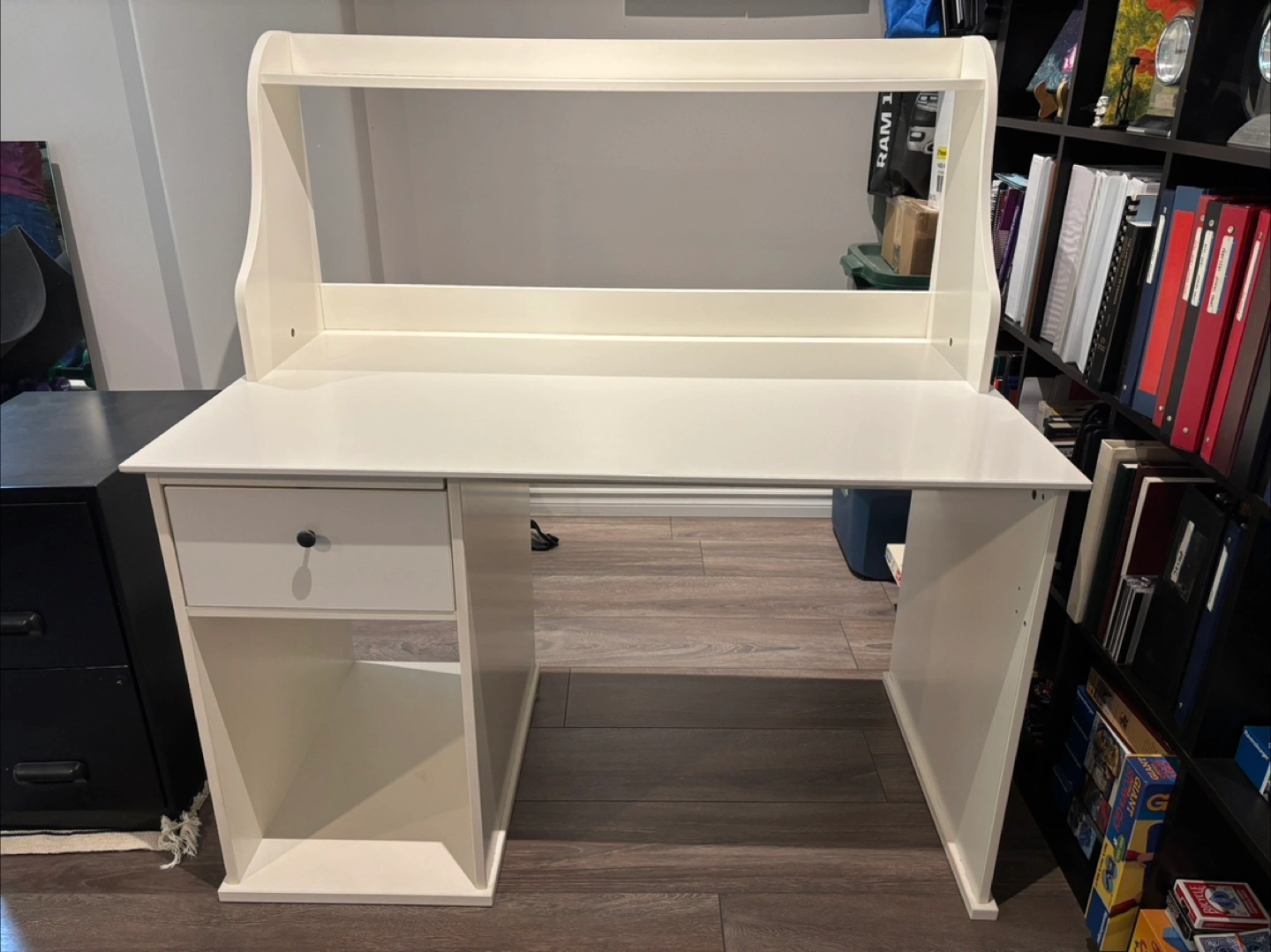 White computer desk. Great condition. Perfect for home office or student. Has a shelf for books and accessories, one drawer and a slide out tray for extra workspace. An open cupboard space in the bottom for extra storage.