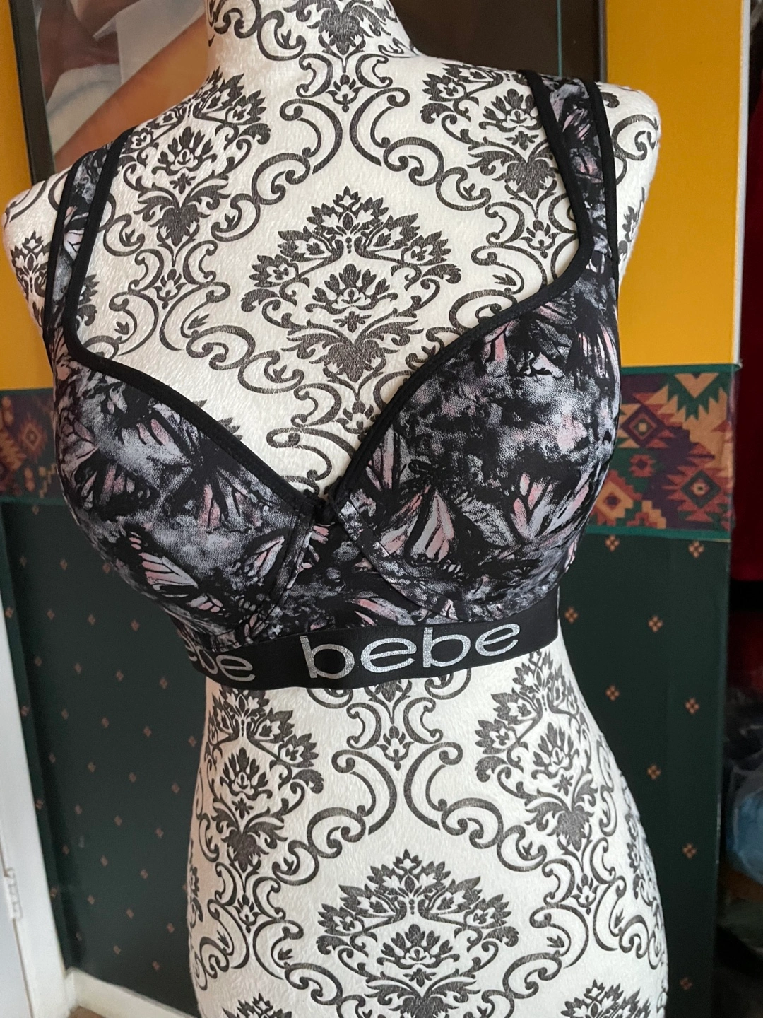 🍁🇨🇦Black and pink butterfly print sports bra. Size 1X. 85% polyester, 5% spandex. Made in China. Pick up Victoria park ave nth Lawrence Ave