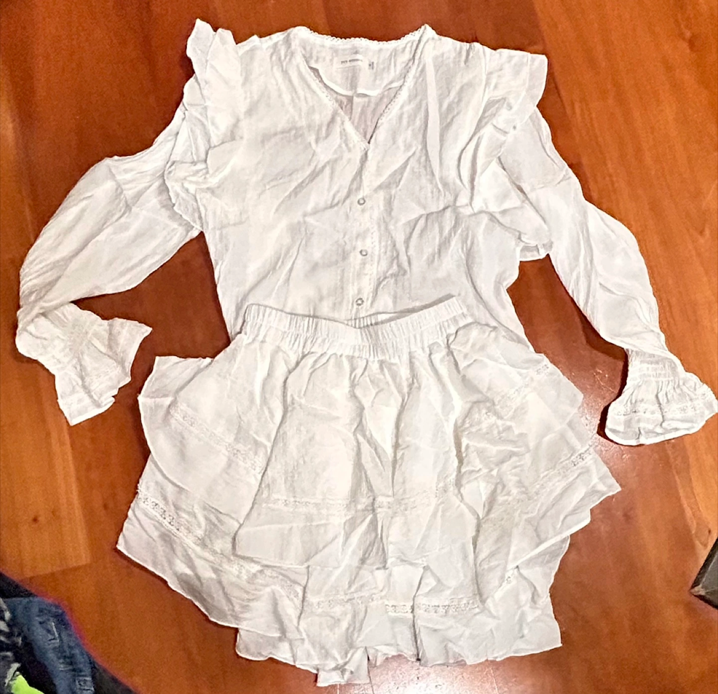 Women's white eyelet set. Long sleeve blouse with ruffle detail and button front. Layered ruffle skirt. Size xl