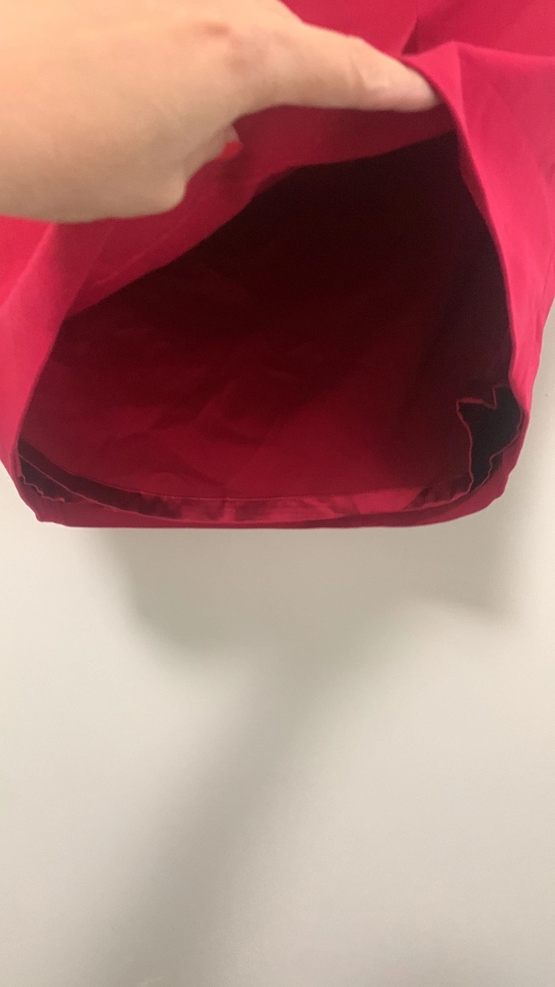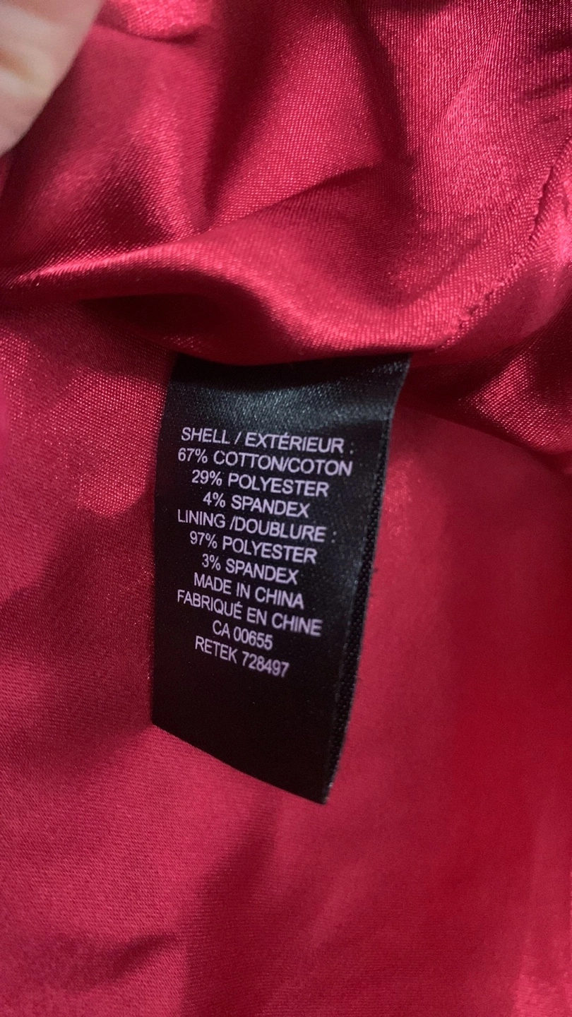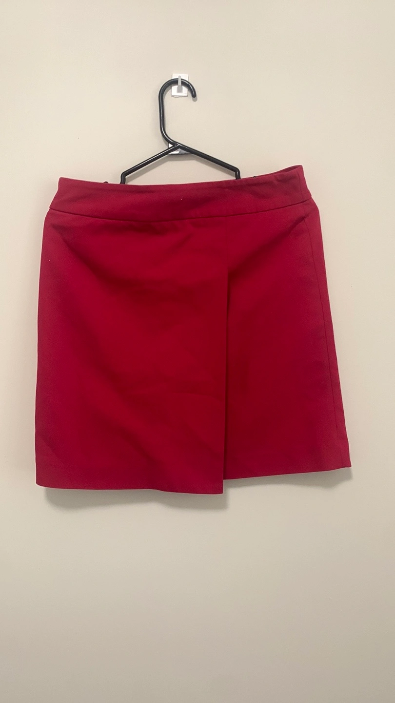 Red mini skirt. Asymmetrical design. Fabric content: 67% cotton, 29% polyester, 4% spandex. Lining: 97% polyester, 3% spandex. Made in China. Waistline 15”