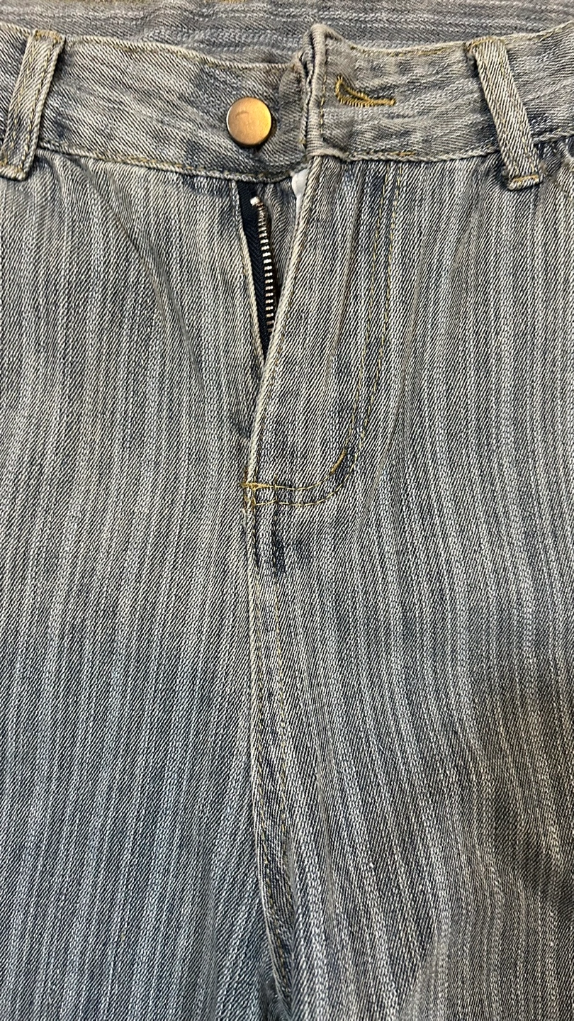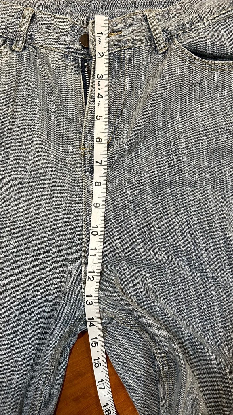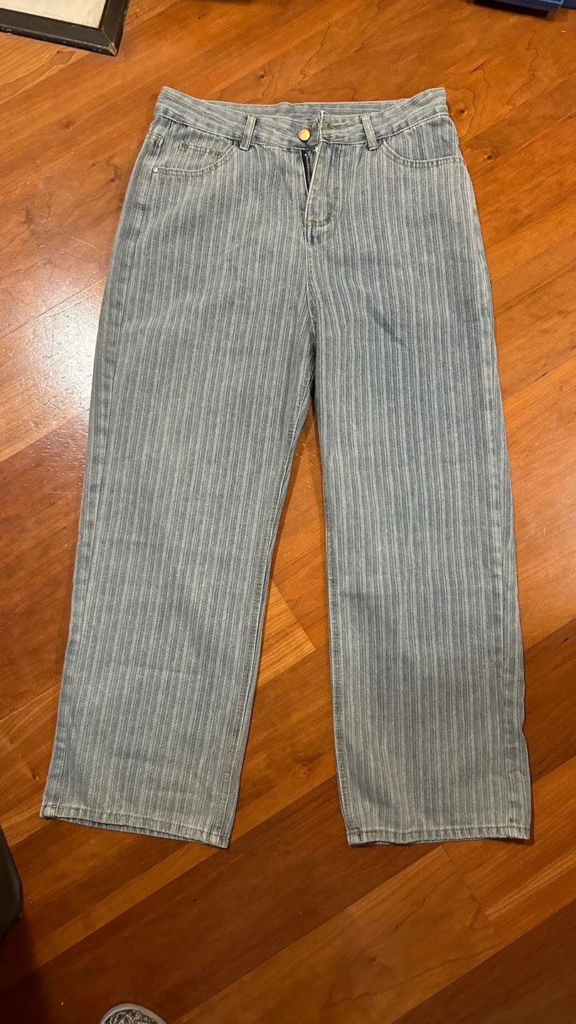 Light wash denim jeans. Size 2XL. Straight leg. Button and zipper closure. Vertical pinstripe pattern.