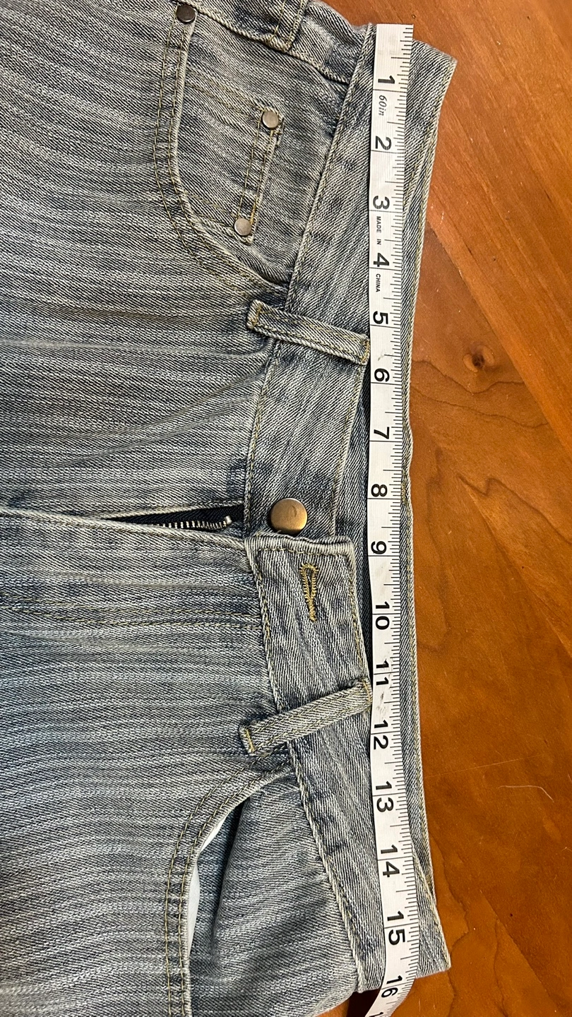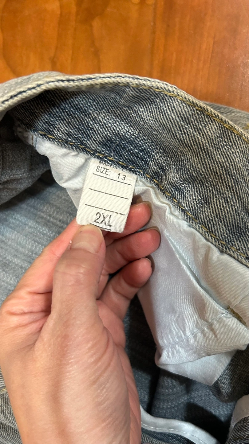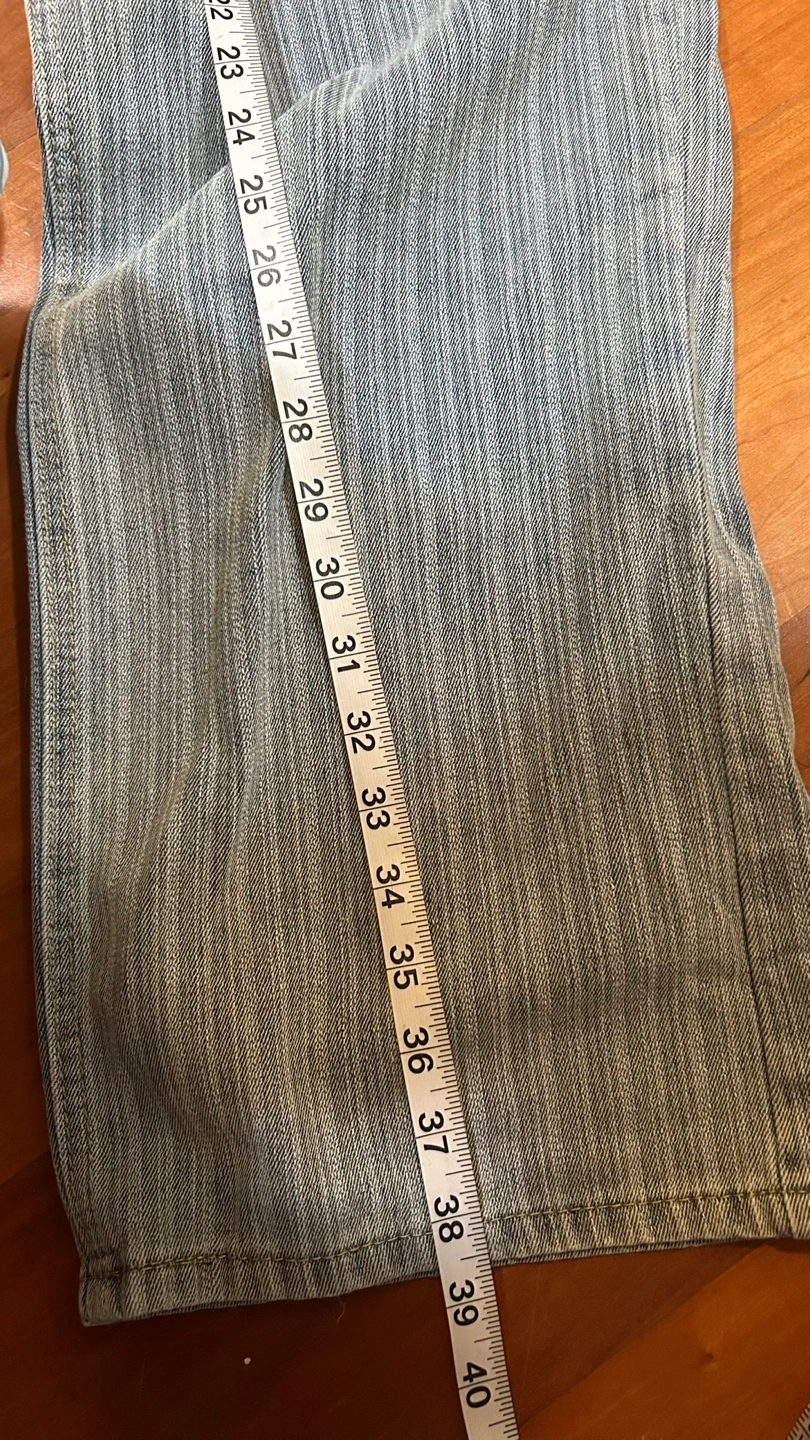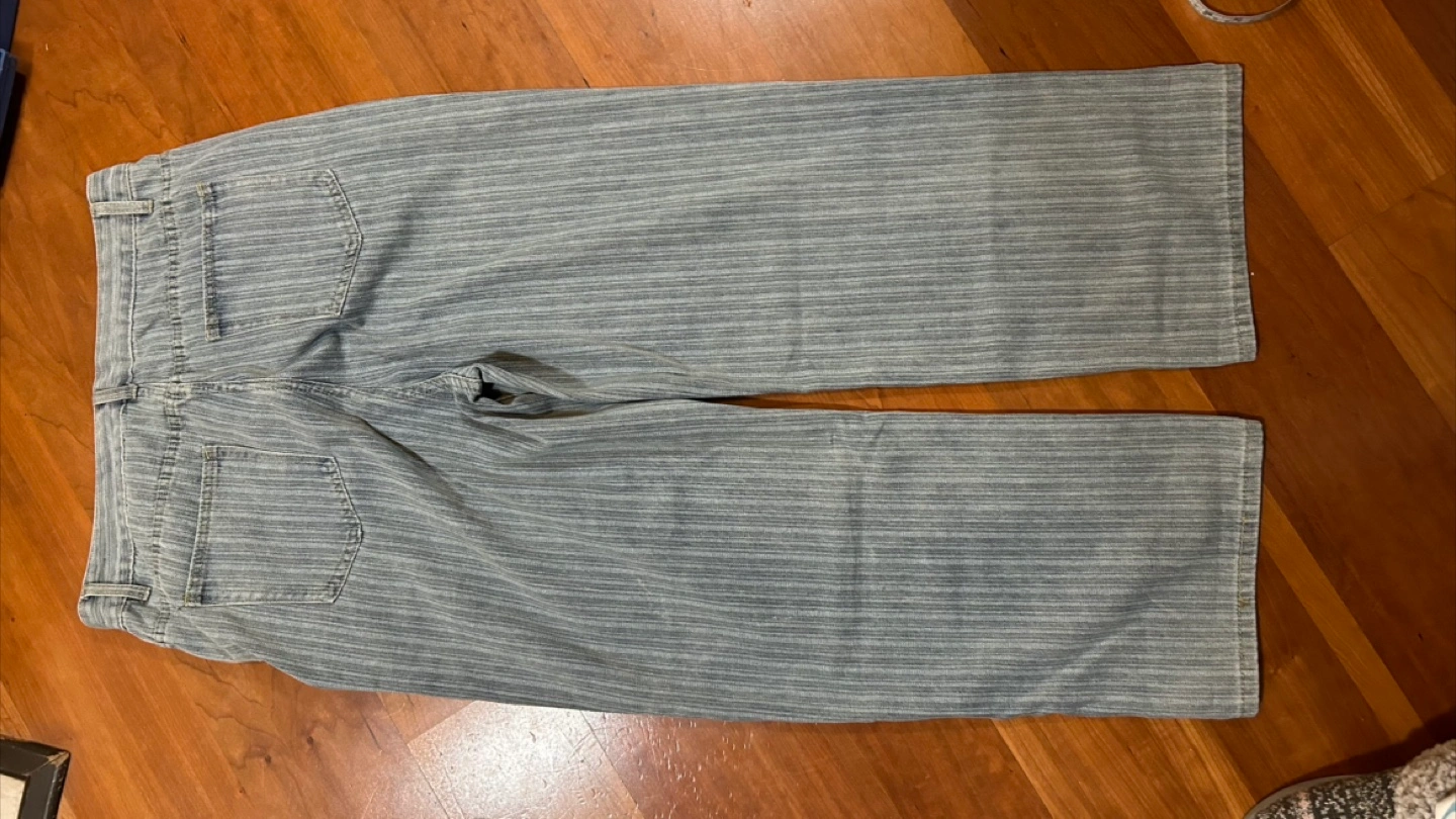 Light wash denim jeans. Size 2XL. Straight leg. Button and zipper closure. Vertical pinstripe pattern.
