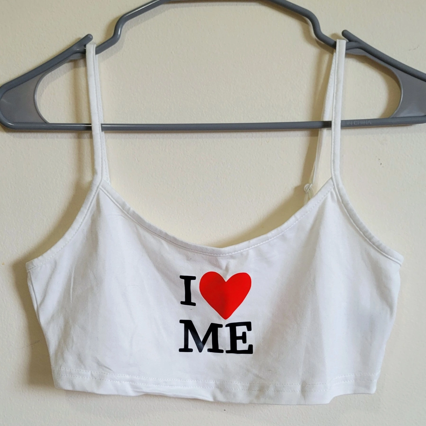 White crop top with thin straps. Features "I ♥ ME" graphic. Size small. ************************************************* **PICK UP ONLY** Cash or etransfer only upon you seeing the product in person first. No money is expected beforehand.