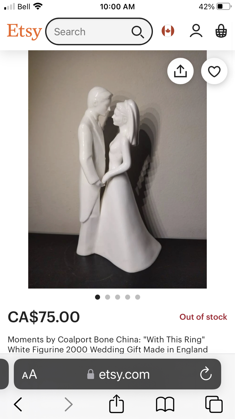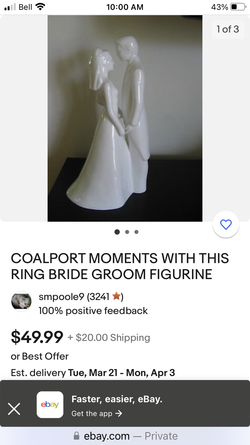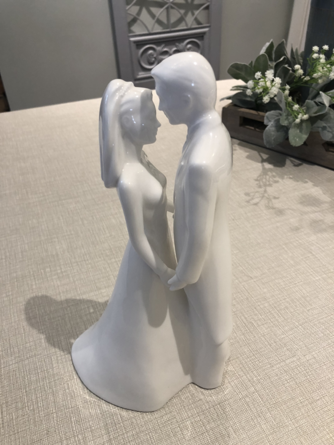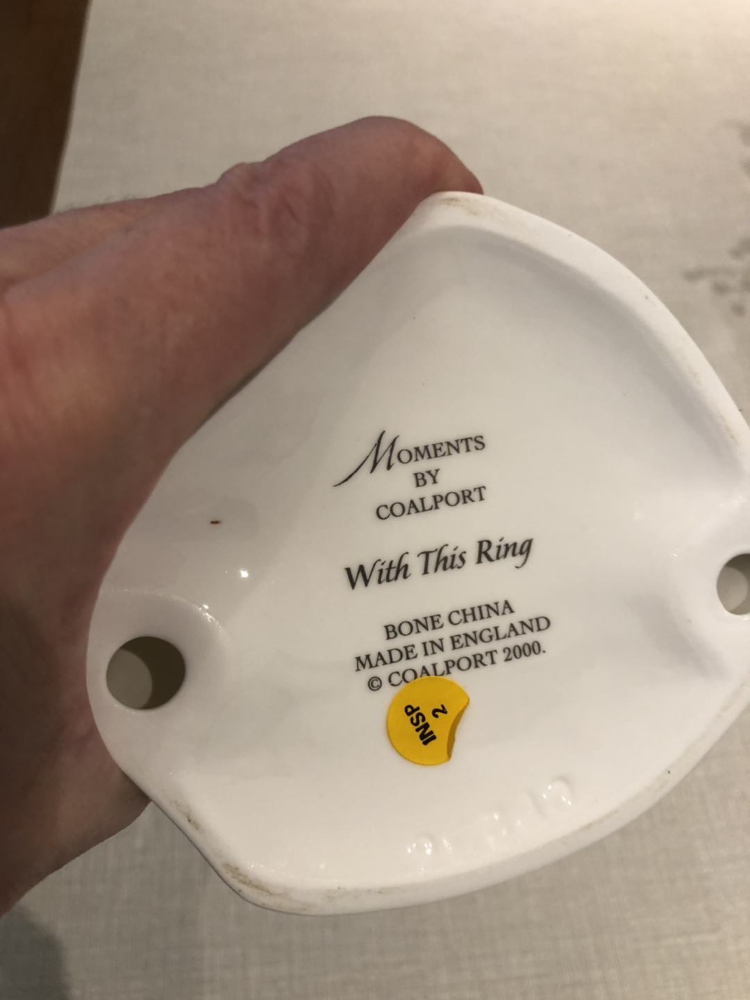 Moments by Coalfort collectables “With This Ring”. Bone China made in England. Year 2000. To my surprise it’s selling for 50-75USD on eBay and Etsy. If this is your side hustle, pick this up and resell it. No chips or damage. 9 and 5/8 inches tall.