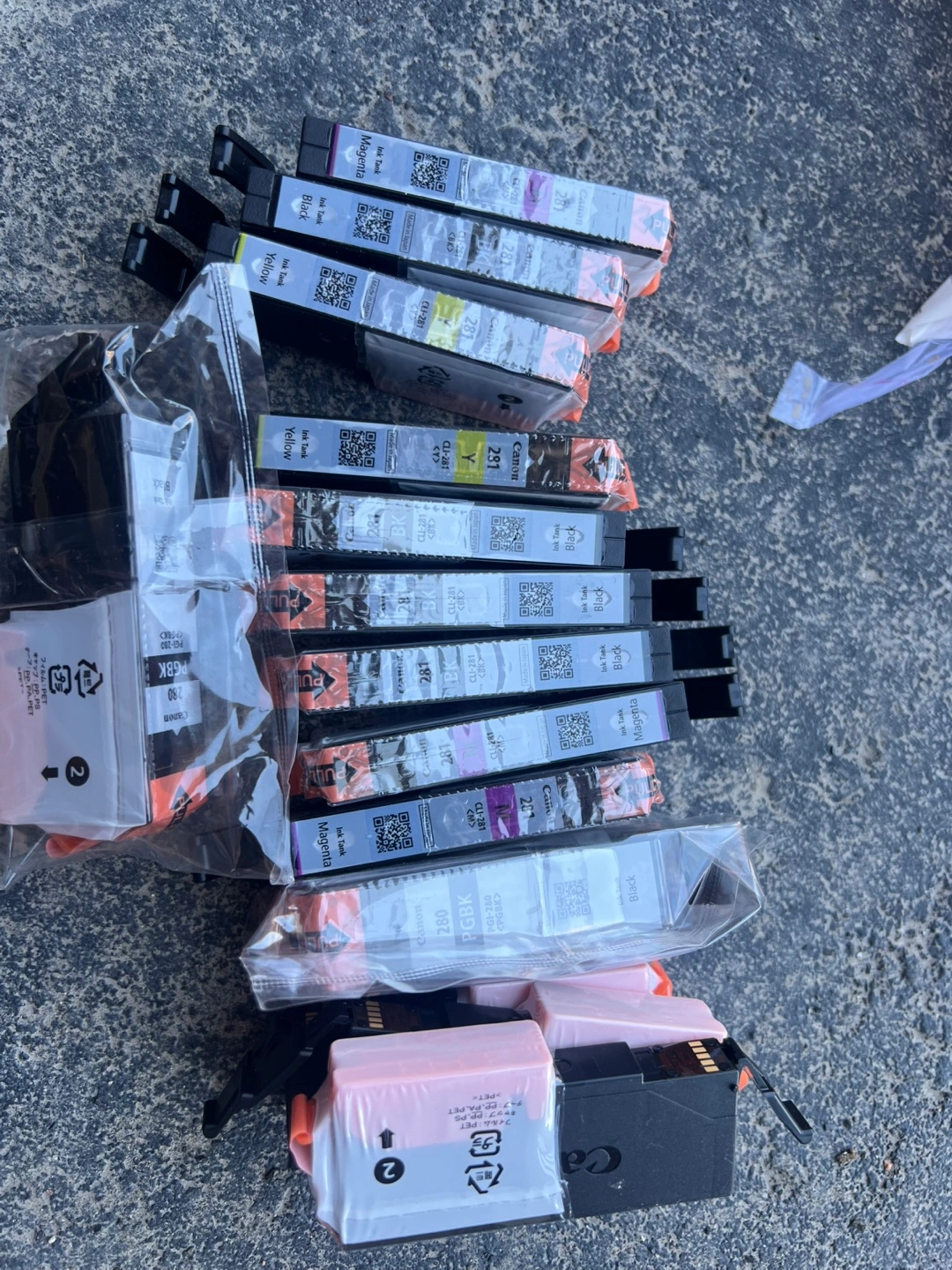 Multiple Canon ink cartridges. Assorted colours, including black, magenta, and yellow. Some appear new, others used. Sold as a bundle. 15 pcs in a bundle
