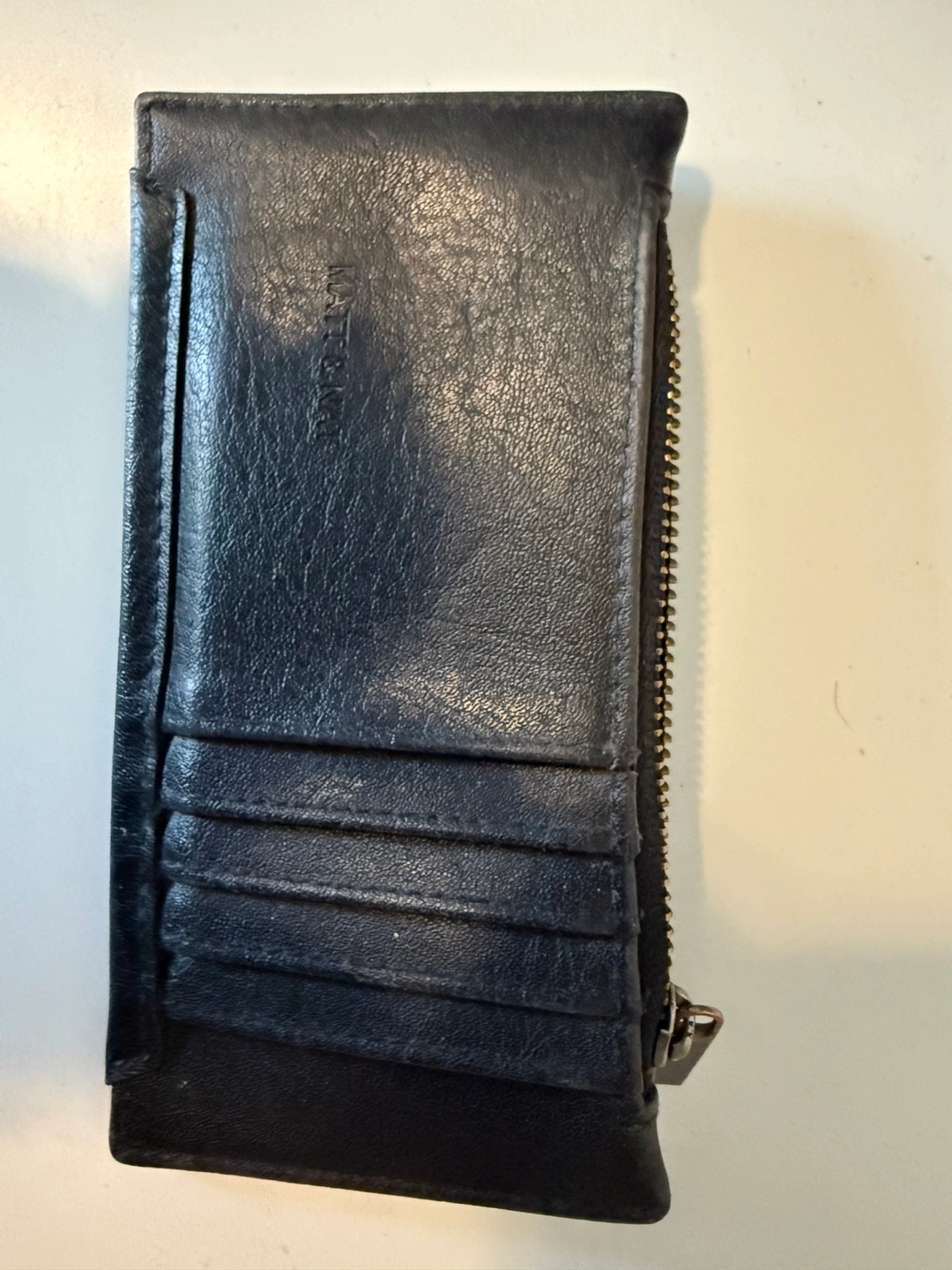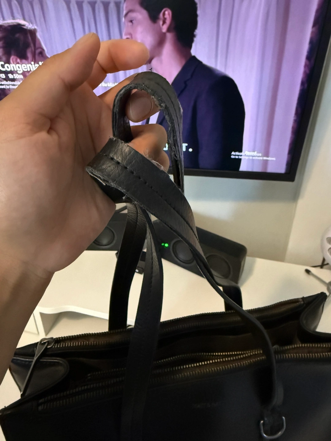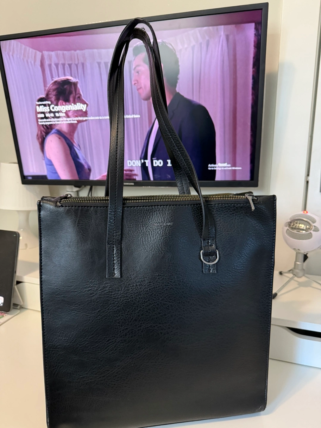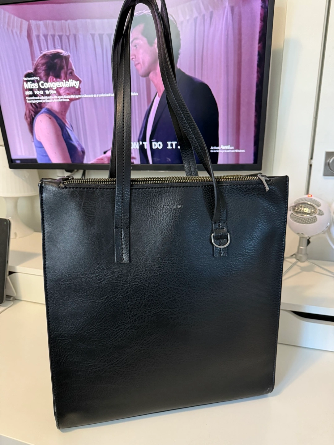 Black vegan leather tote bag. Top zip closure. Two long shoulder straps. Minor wear on the straps. Interior pockets. Excellent condition otherwise. I’ll give the card holder for free.