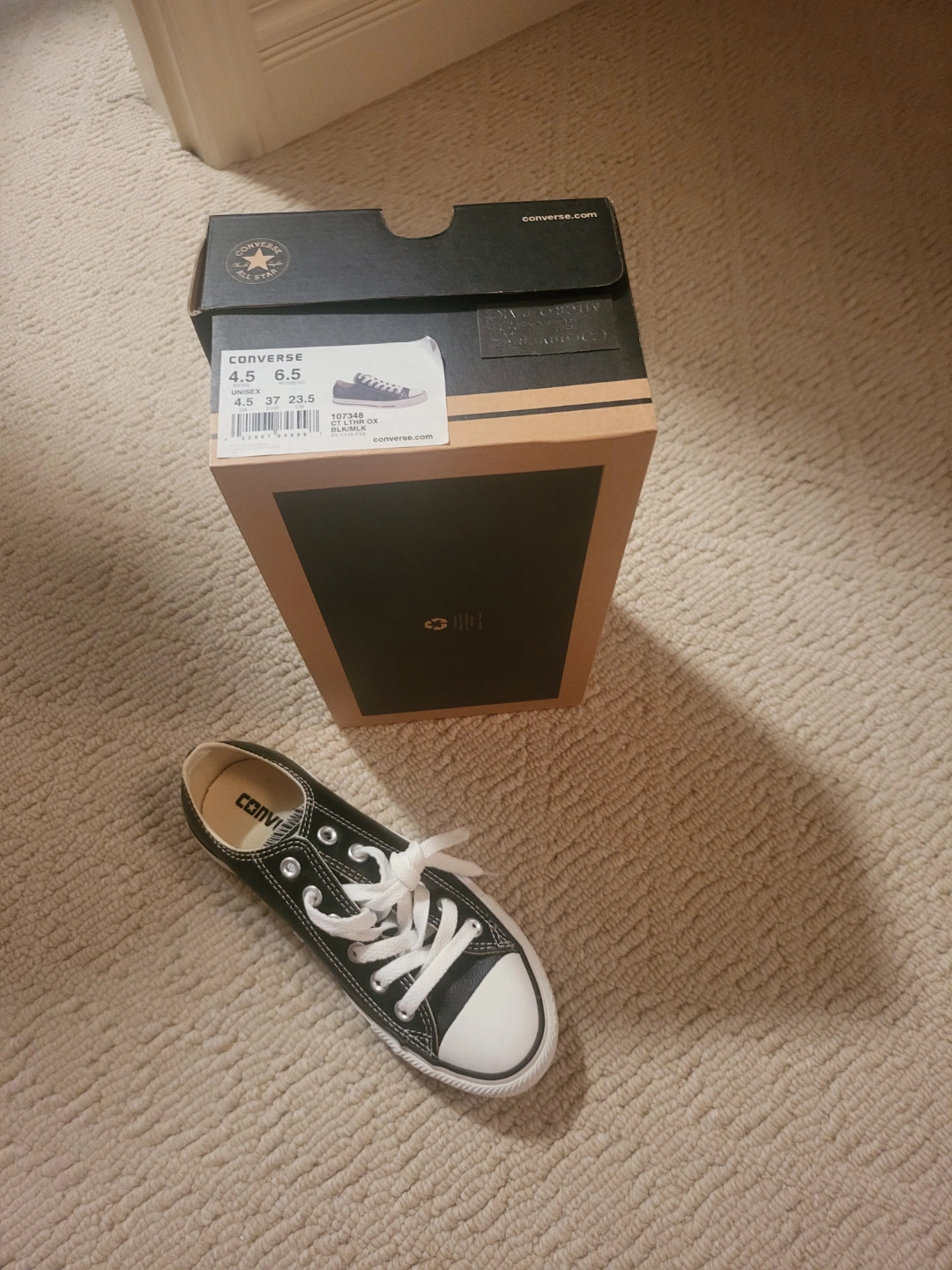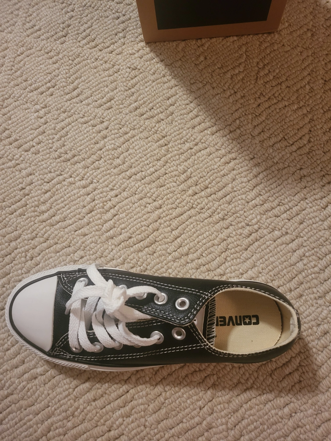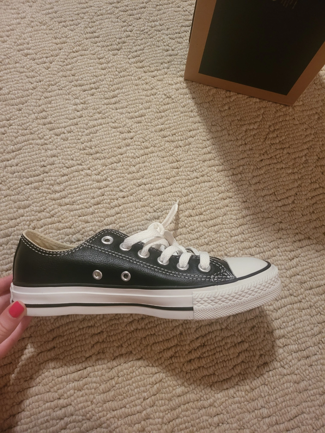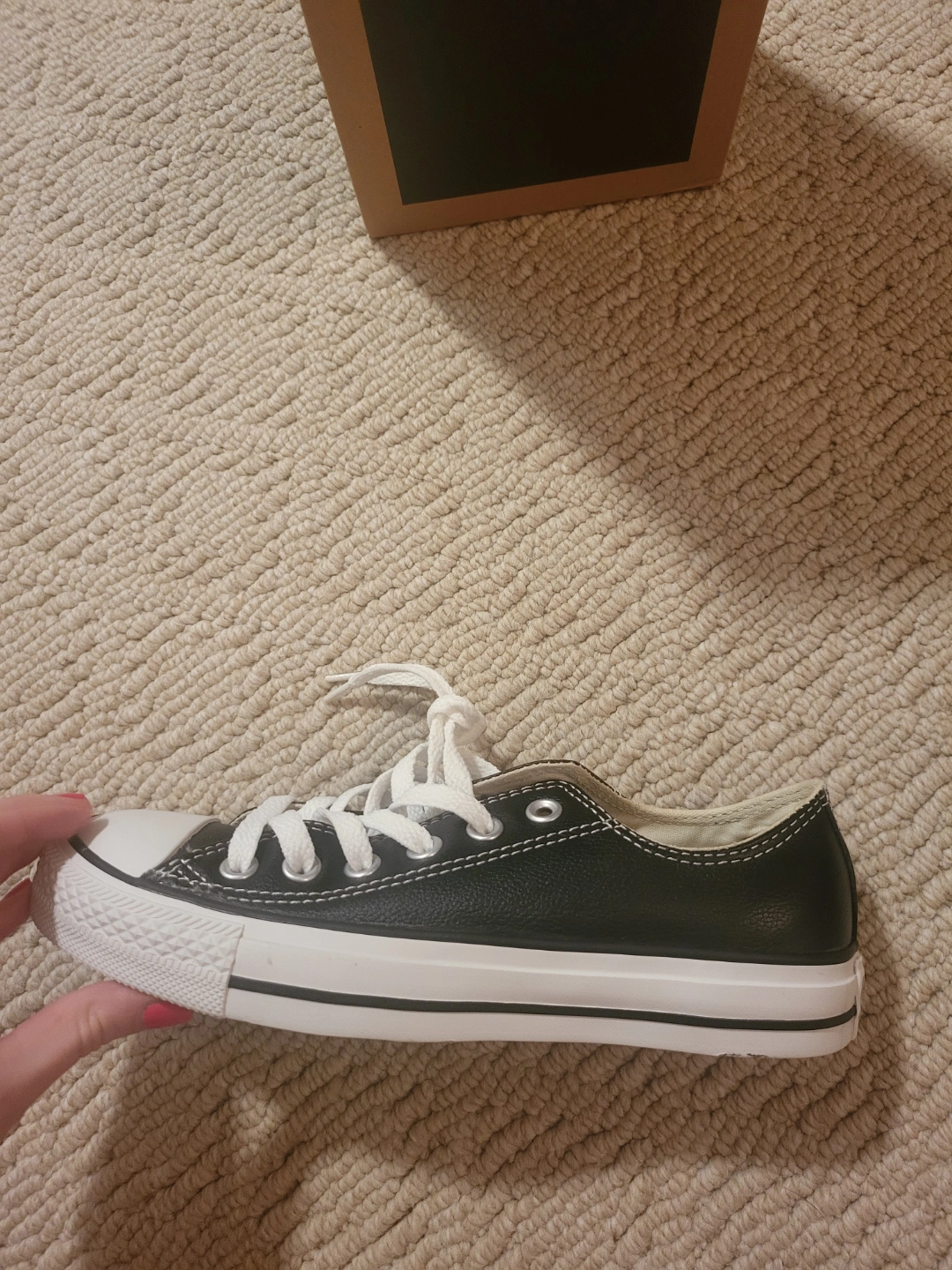 Black leather low top Converse sneakers. Women's size 6.5. Classic style. Comes in original box. never worn