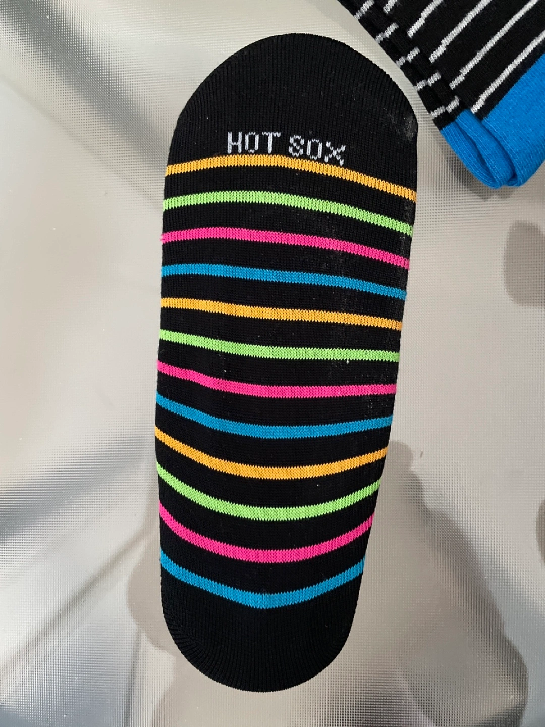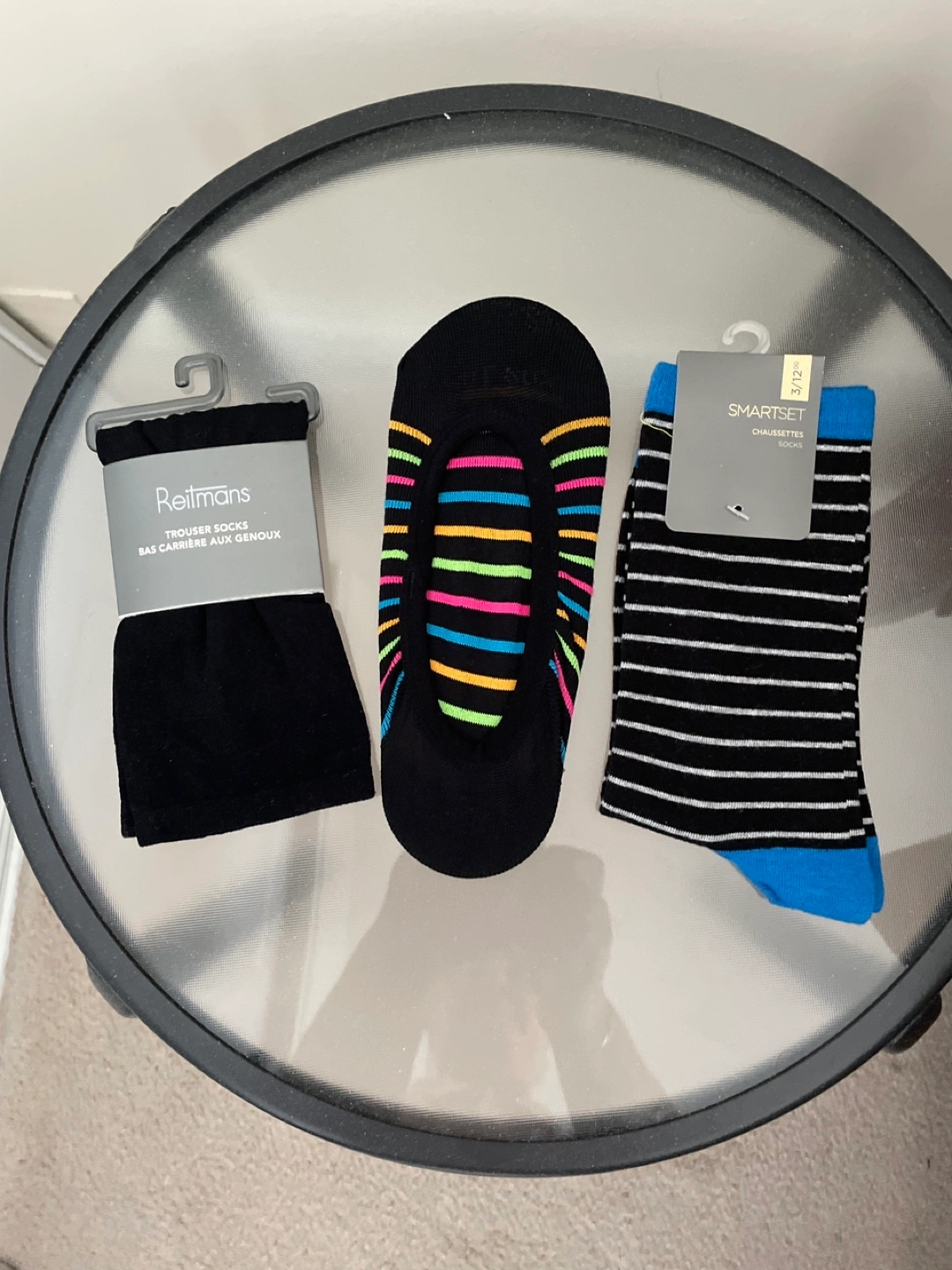 Three pairs of women's socks. One pair knee-high black socks from Reitmans. One pair black no-show socks with rainbow stripes. One pair black and white striped ankle socks with a blue cuff. One size fits most. Machine washable.All for $5