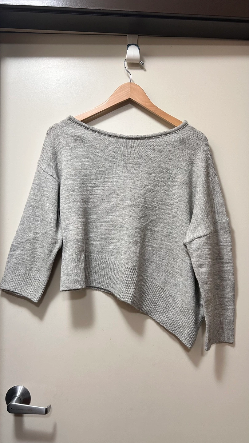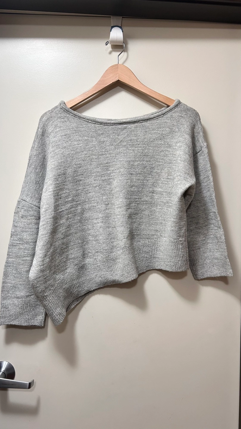 Lightweight grey cropped sweater. Three-quarter sleeves. Asymmetrical hemline. Relaxed fit.