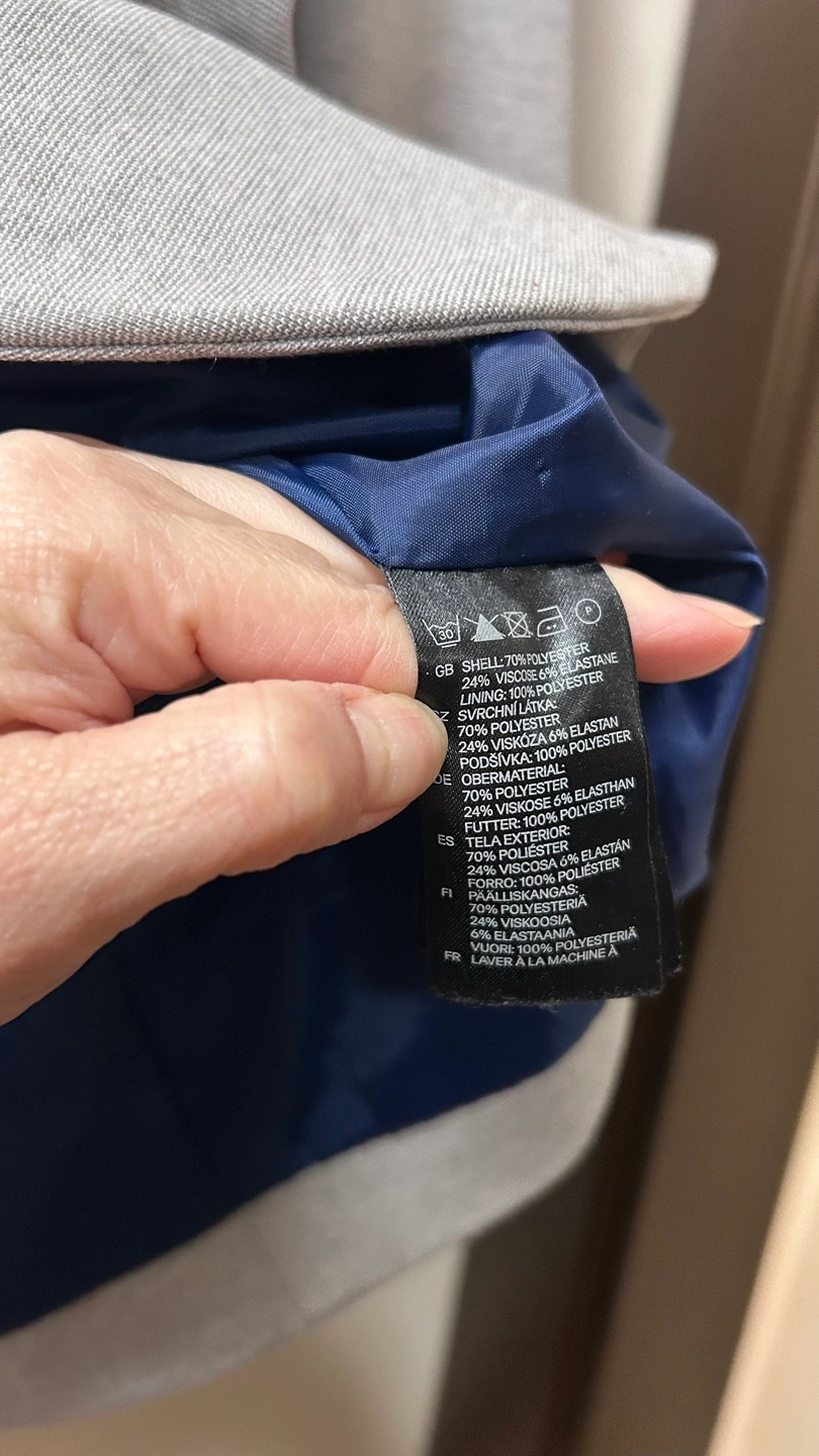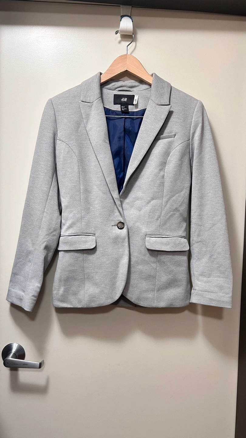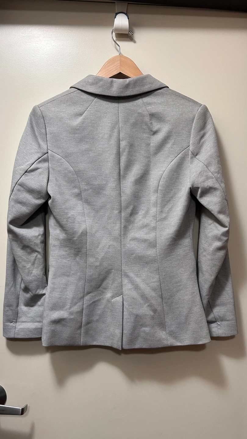 Women's grey blazer. Size 8. Made in China. 70% Viscose, 24% Polyester, 6% Elastane. Single button closure. Long sleeves.