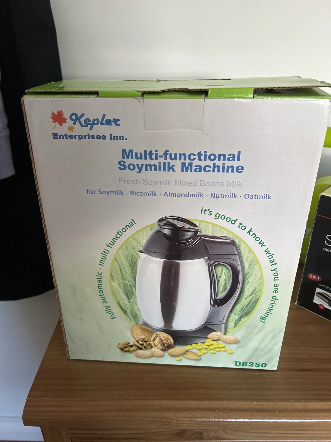 New in box. Makes soymilk, rice milk, almond milk, nut milk, and oat milk. Fully automatic and multi-functional.