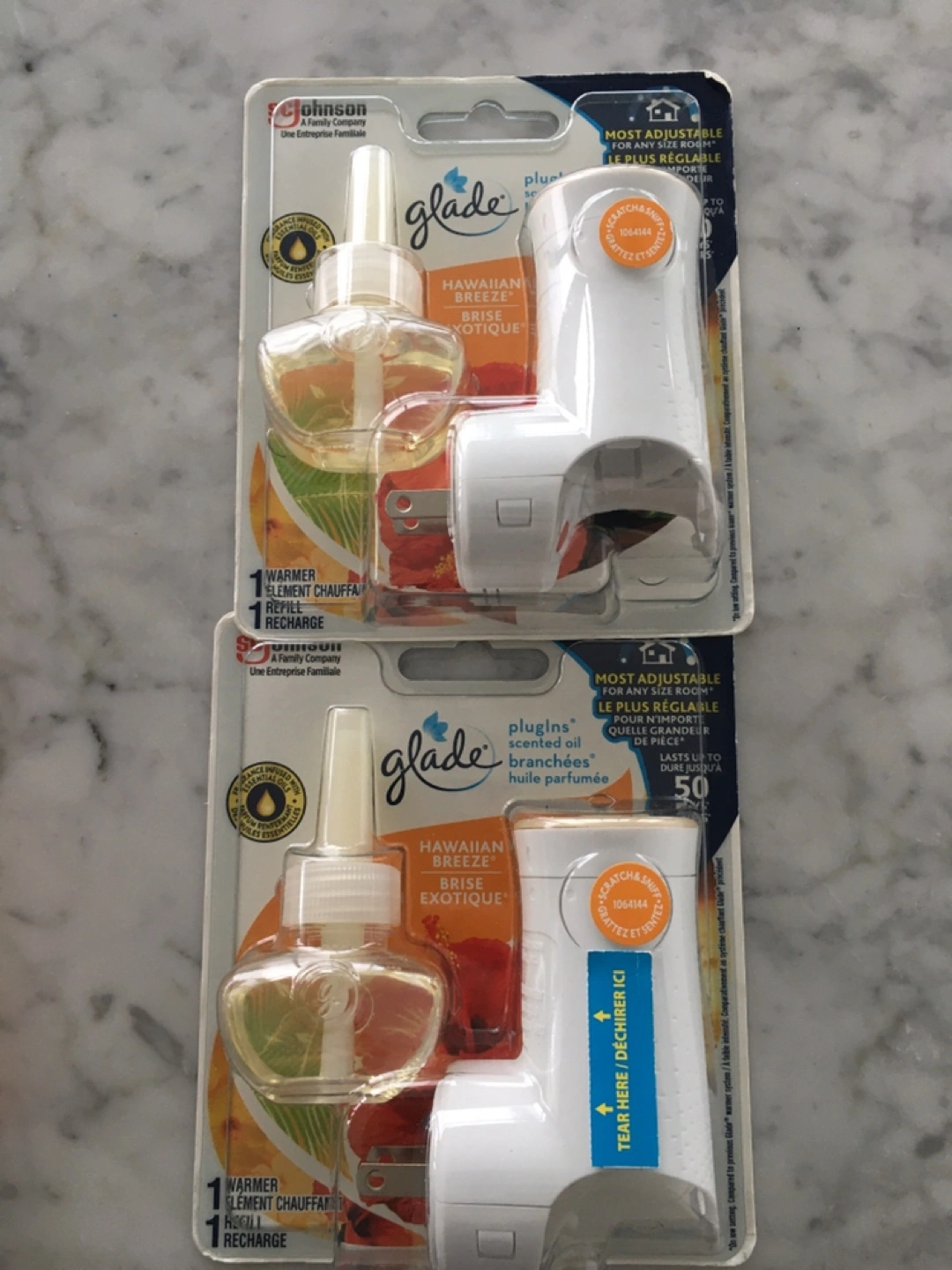 Two Glade plug-in oil warmers. Hawaiian Breeze scent. Includes refills. Most adjustable for any size room.