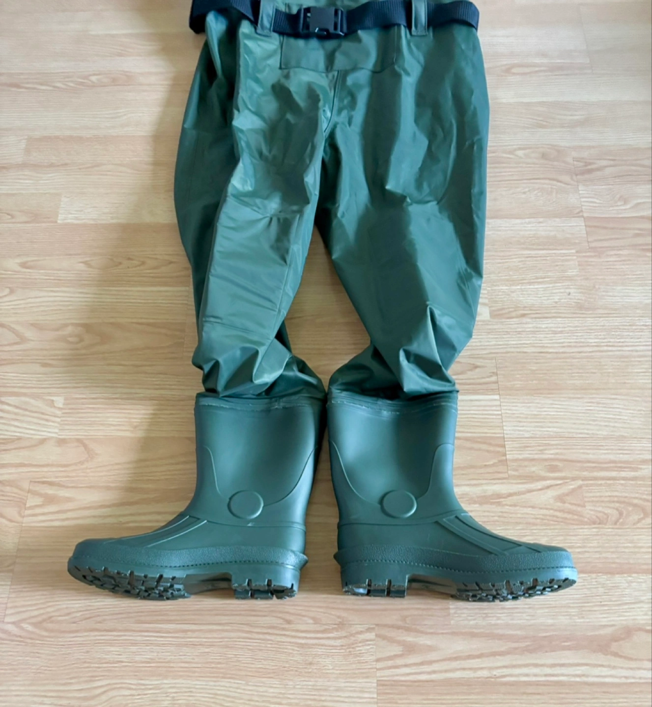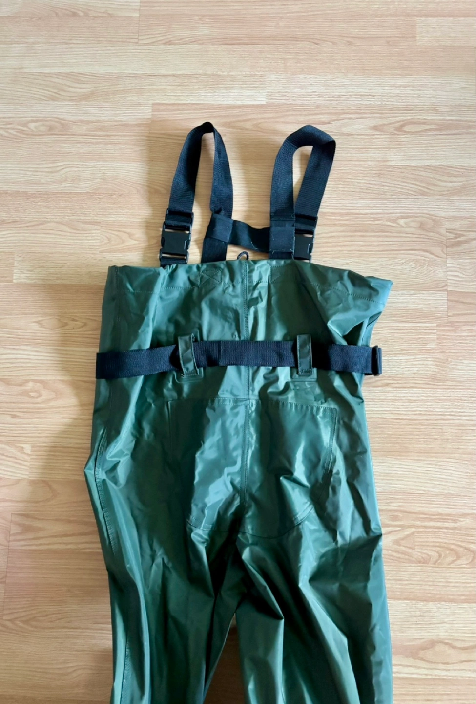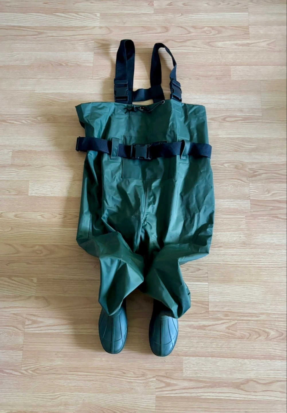 Durable green chest waders with attached boots. Adjustable straps and belt. Front pocket. Great for fishing and heavy rain events. Unisex Men’s 10/Women’s 12 Only used once or twice. In excellent condition.