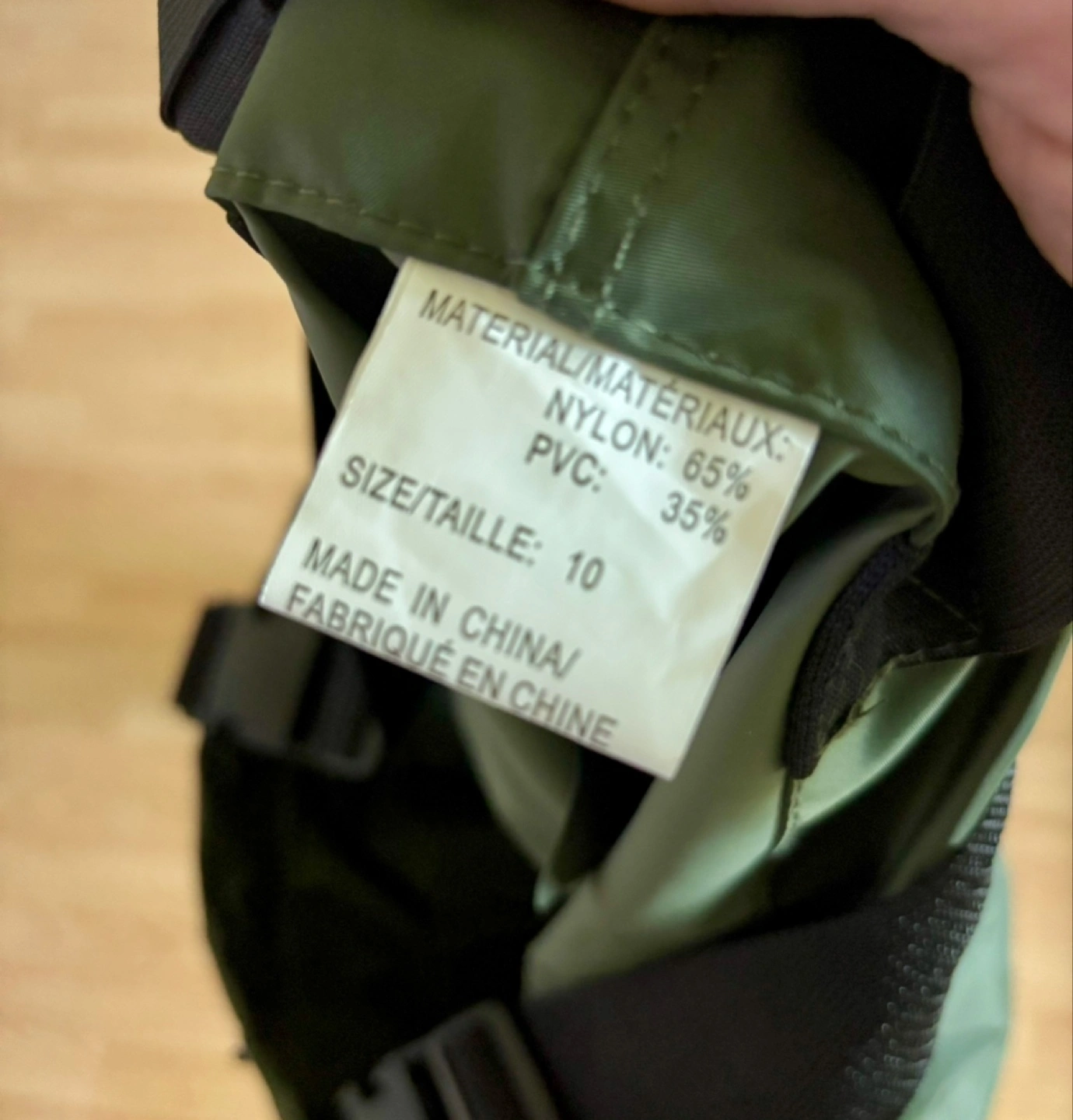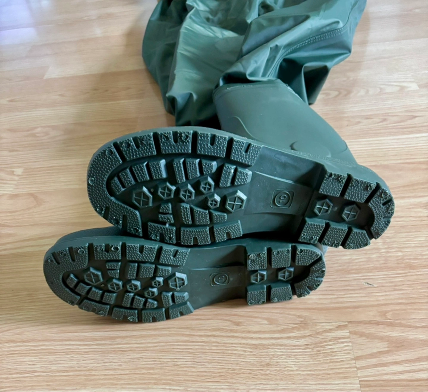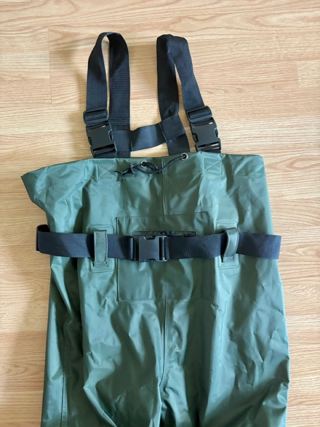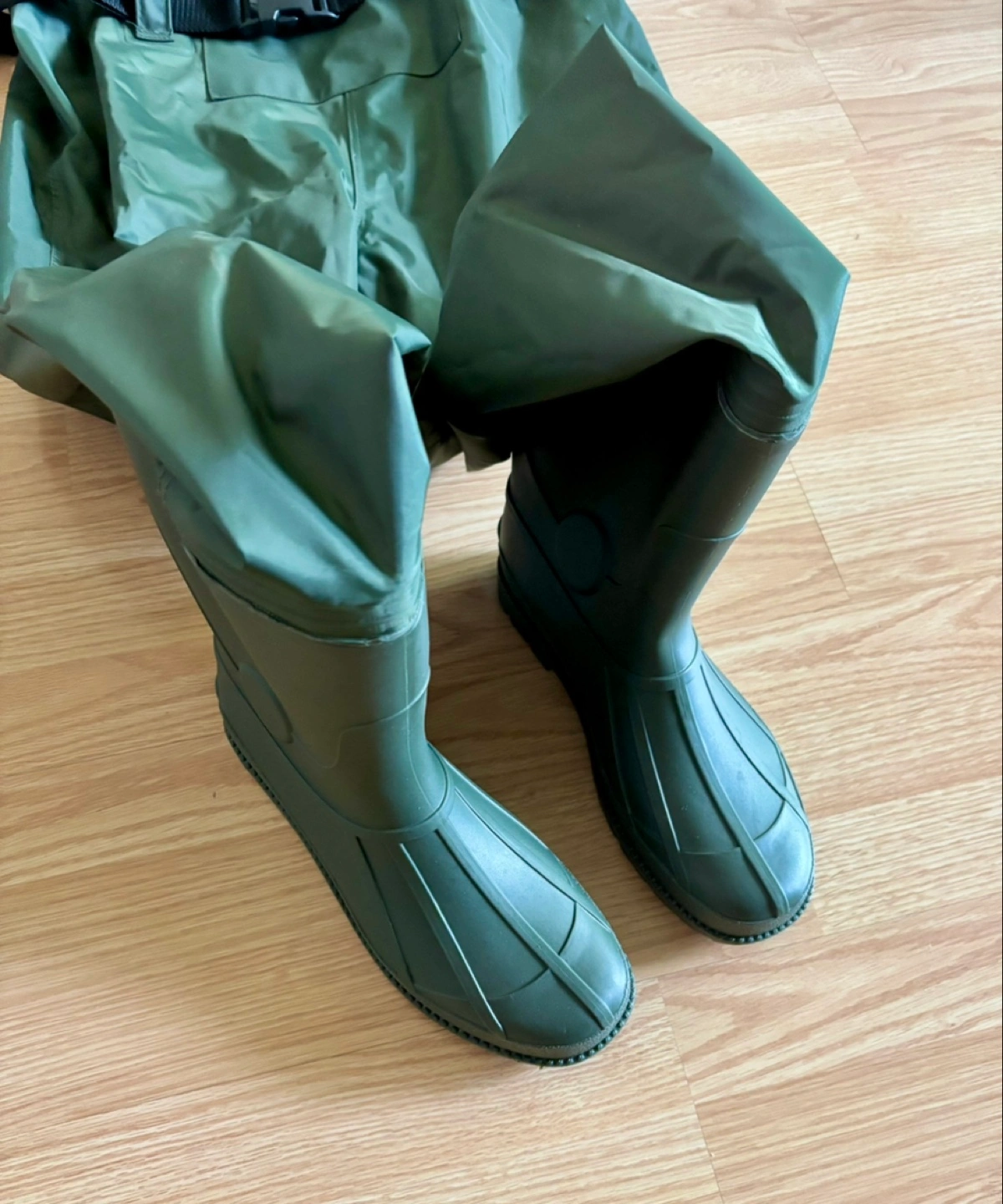 Durable green chest waders with attached boots. Adjustable straps and belt. Front pocket. Great for fishing and heavy rain events. Unisex Men’s 10/Women’s 12 Only used once or twice. In excellent condition.