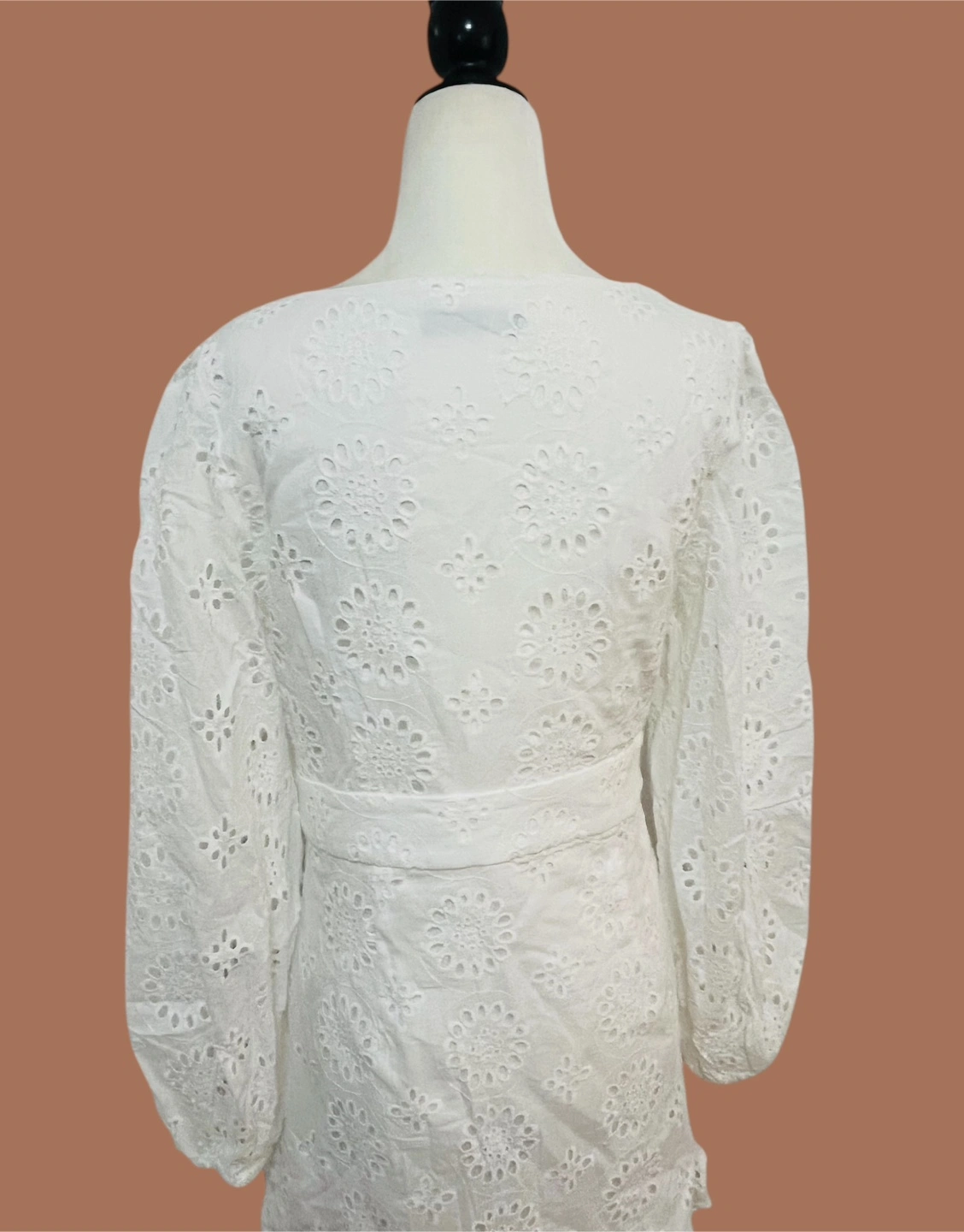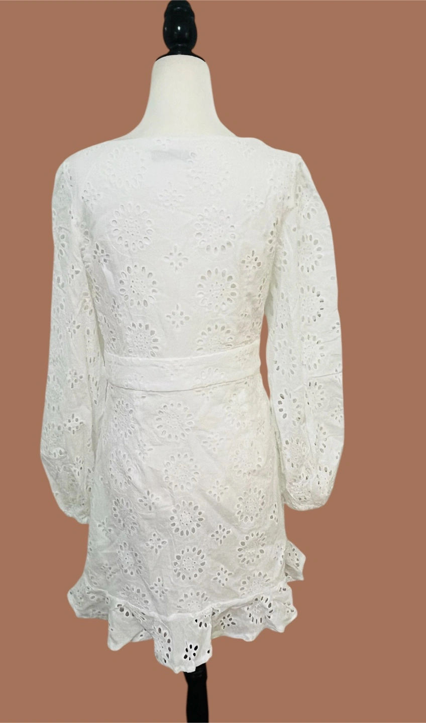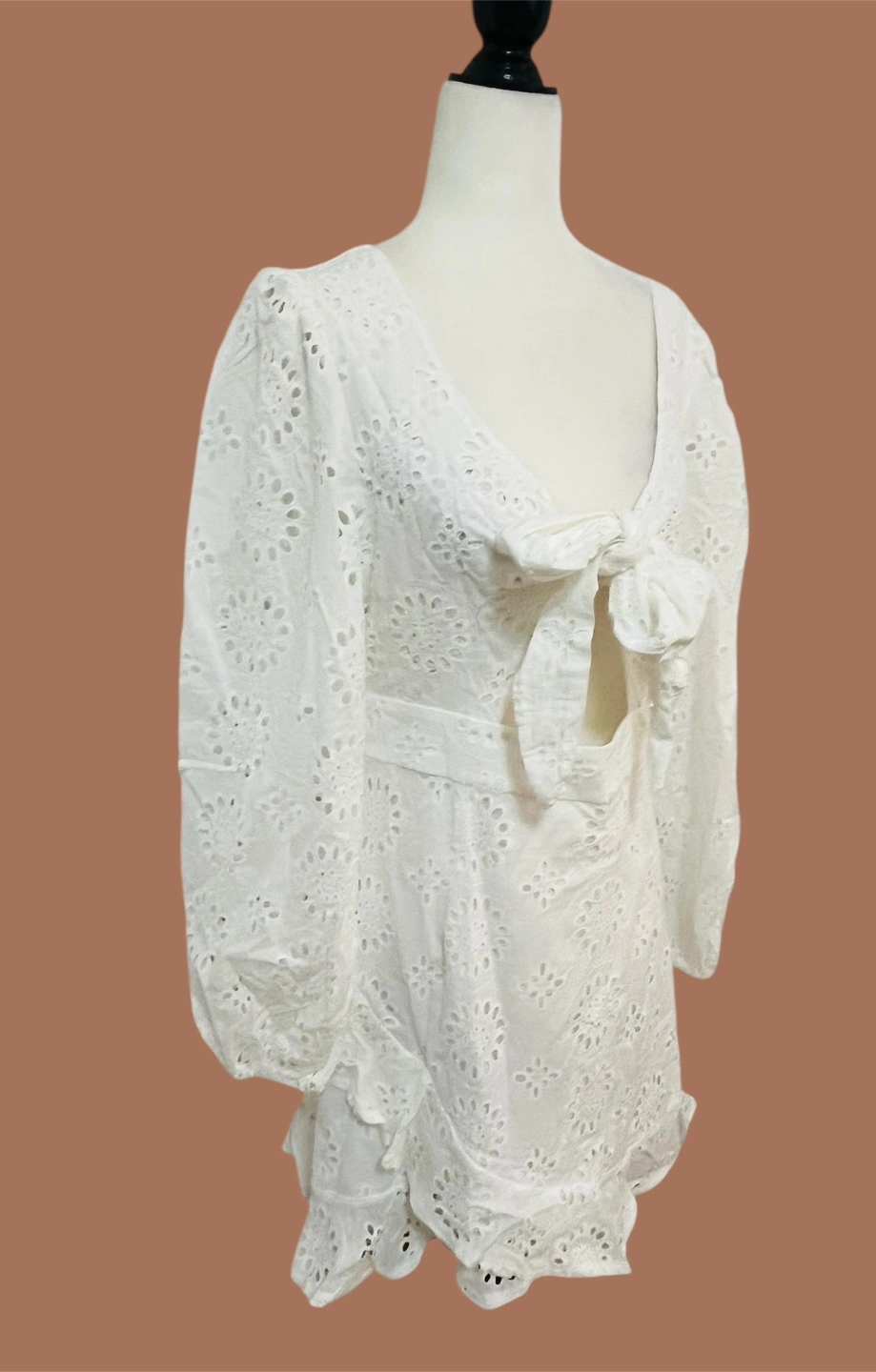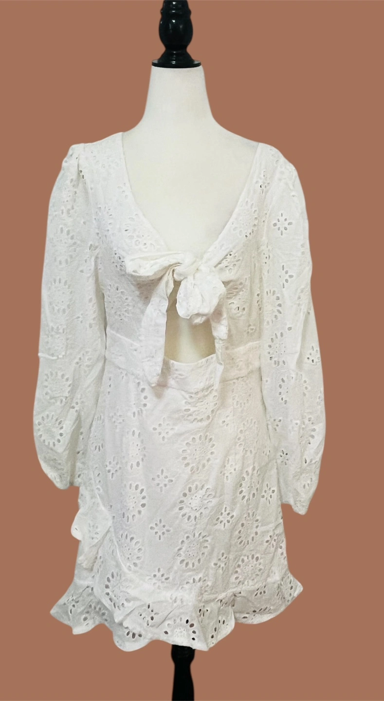 A vision of summer elegance, this white eyelet dress is a breath of fresh air. The intricate floral eyelet design adds a touch of romance, while the tie-front detail creates a flattering silhouette with a hint of playful allure. Long sleeves offer coverage and sophistication, balanced by the flirty ruffle hem that adds movement and charm. The lightweight fabric ensures comfort, making it perfect for warm weather occasions. Picture yourself twirling at a garden party, enjoying a sunset dinner on the beach, or attending a chic daytime event in this effortlessly stylish dress. Style: Sundress, A-Line Dress Length: Mini Color: White Department: Women Pattern: Floral Occasion: Casual, Party/Cocktail, Travel Sleeve Length: Long Sleeve Material: 100% Cotton, Cotton Neckline: V-Neck Fabric Type: Lace Character: Boho Chic, Summer Girl Season: Spring, Summer Sleeve Type: Balloon Sleeve Closure: Tie Like New PU Ottawa & Strasburg, Kitchener Keywords: Shein dress, white dress, eyelet dress, tie front dress, long sleeve dress, ruffle hem dress, summer dress, casual dress, boho dress, beach dress, party dress, floral dress, lace dress, size L dress
