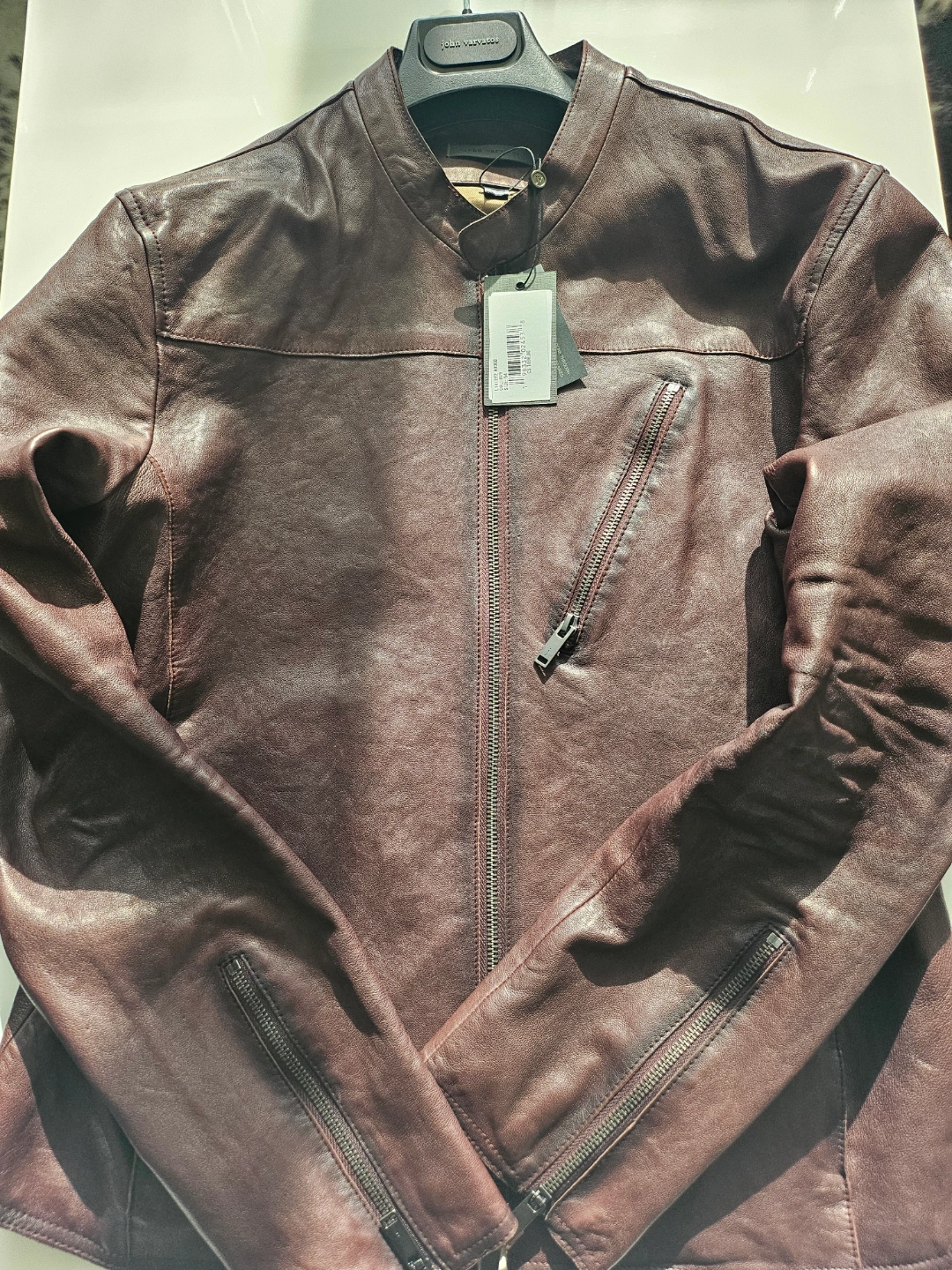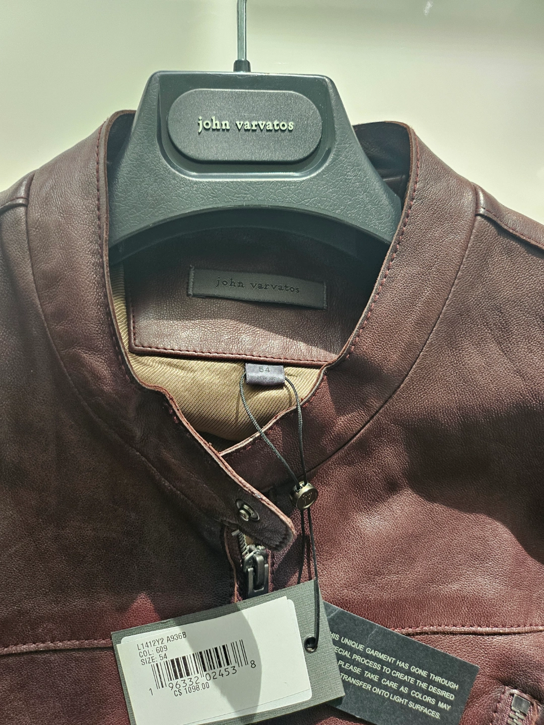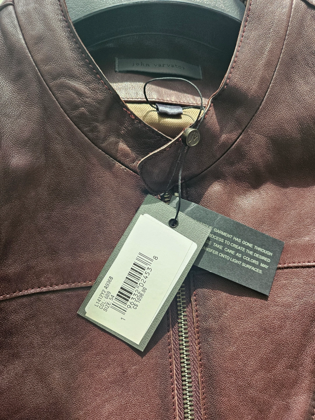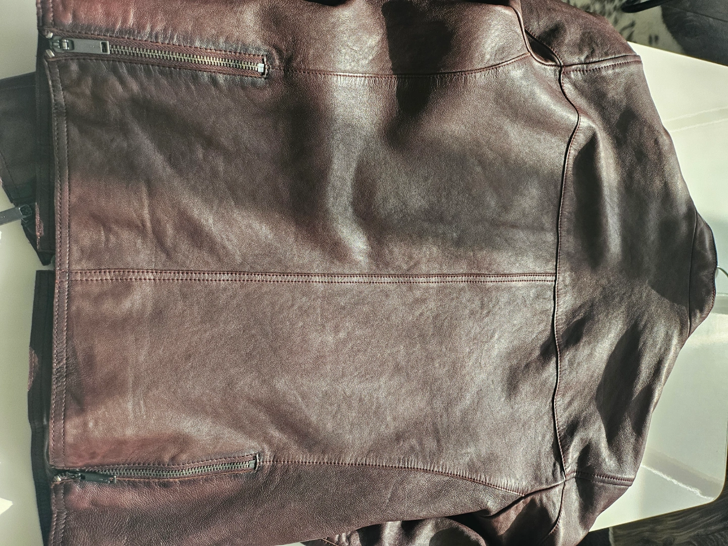 Men's burgundy leather jacket, never worn. Zipper closure. Multiple pockets. Excellent condition. Size: M *im a large and its fitted.