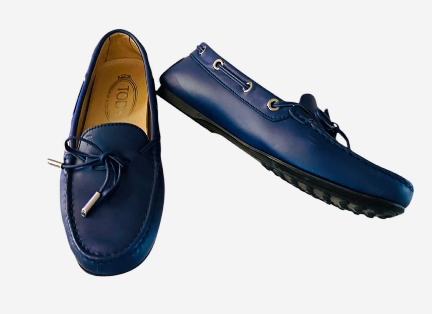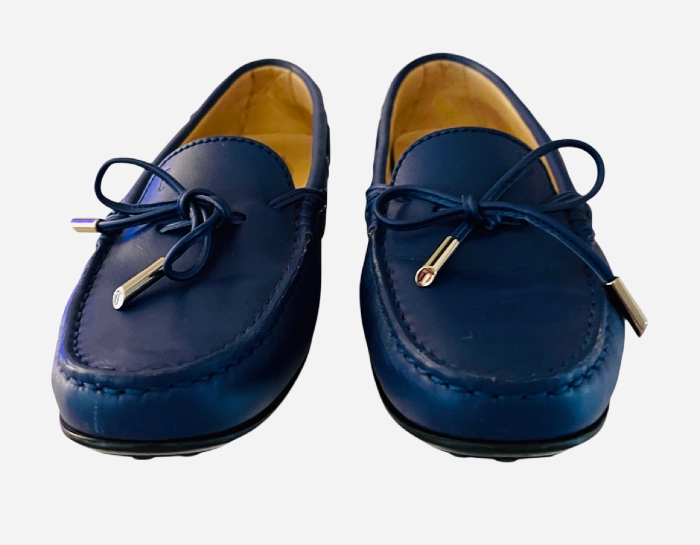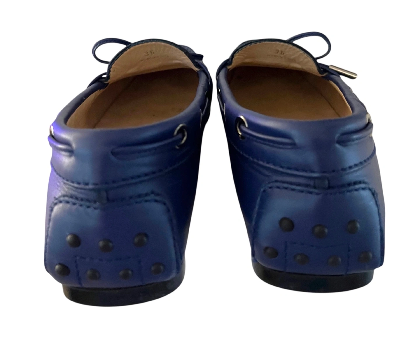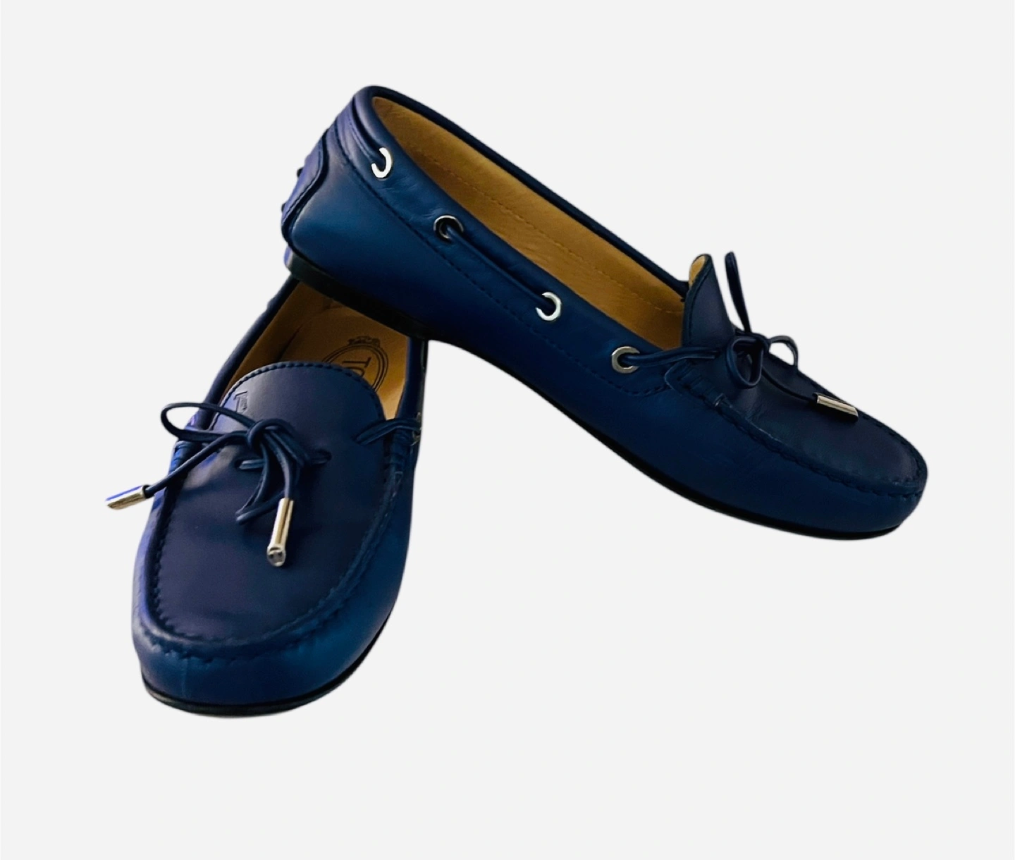 Italian craftsmanship meets effortless style in these stunning driving moccasins. Imagine slipping your feet into the supple leather, the rich blue hue adding a touch of sophistication to any ensemble. The iconic design, complete with delicate tie detailing and silver-tone accents, exudes understated luxury. The meticulously crafted sole provides exceptional comfort and grip, making them perfect for navigating city streets or relaxing on a coastal getaway. These Tod's loafers are the perfect choice for a casual brunch, a weekend road trip, or adding a touch of elegance to your everyday errands. Style: Moccasin Color: Blue Department: Women Upper Material: Leather Features: Comfort, Cushioned, Driving Shoes, Slip On, Lightweight Occasion: Casual, Travel Lining Material: Leather Insole Material: Leather EU Shoe Size: 36 Model: Gommino Driving Moccasins Type: Flat Like New Length of sole 10" Width of sole at ball of foot 3" $500 original price Keywords: Tod's, driving moccasins, boat shoes, leather loafers, Italian shoes, blue shoes, women's shoes, designer shoes, casual shoes, comfortable shoes, size 36, driving shoes women, moccasins, slip on shoes