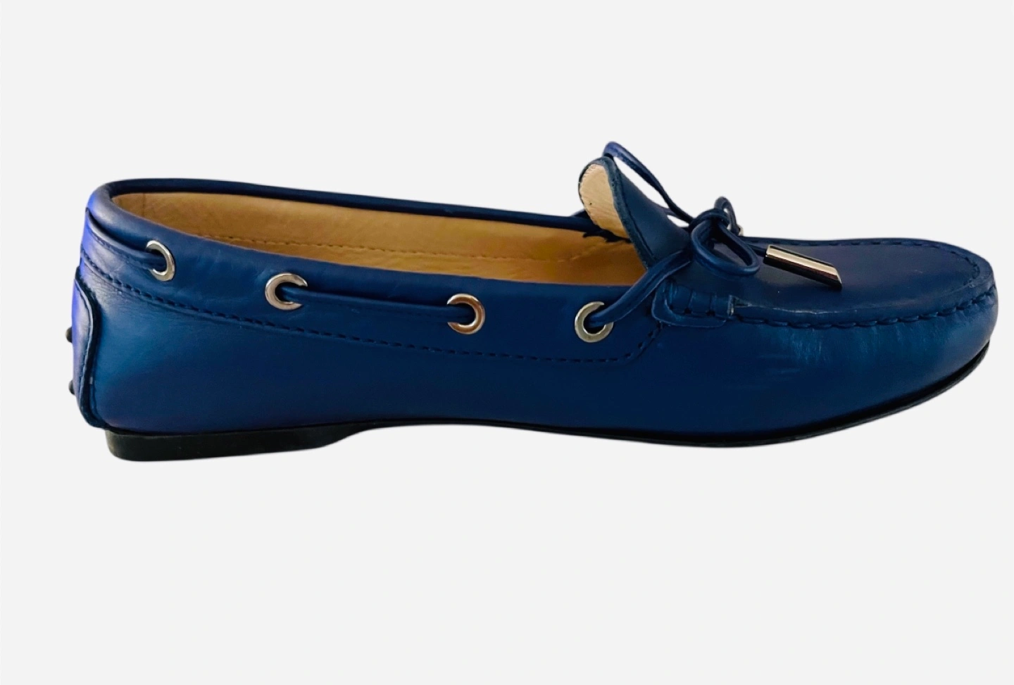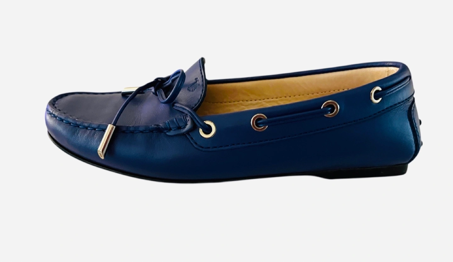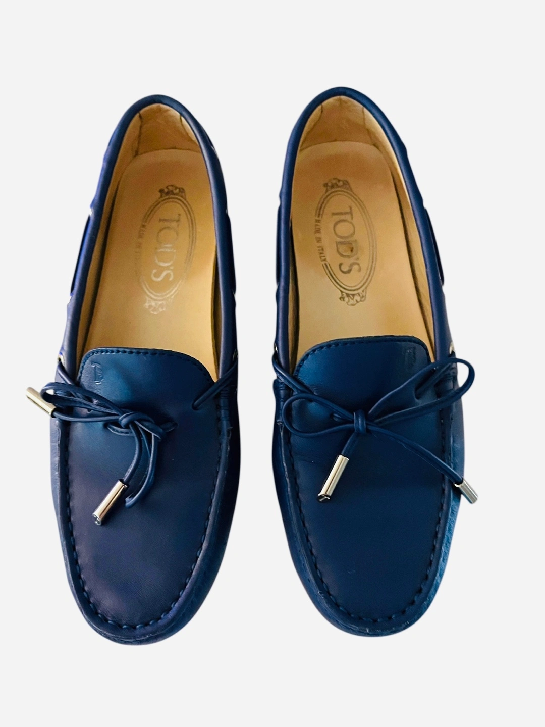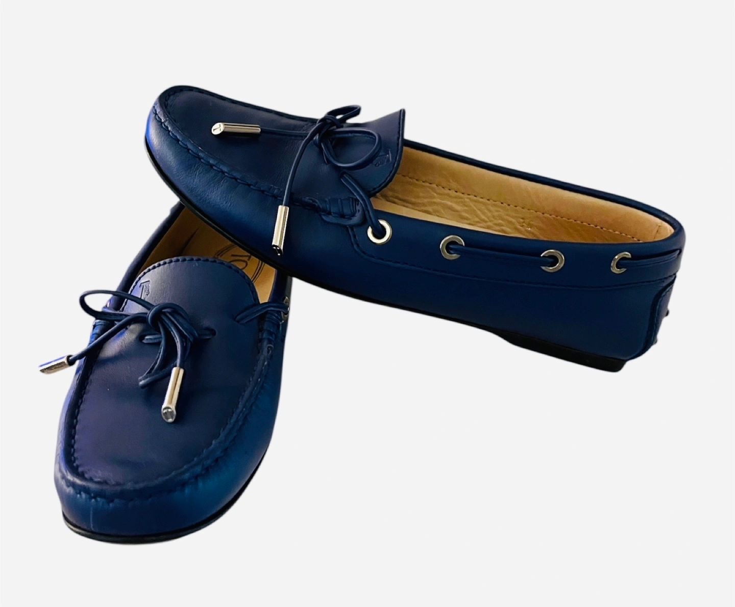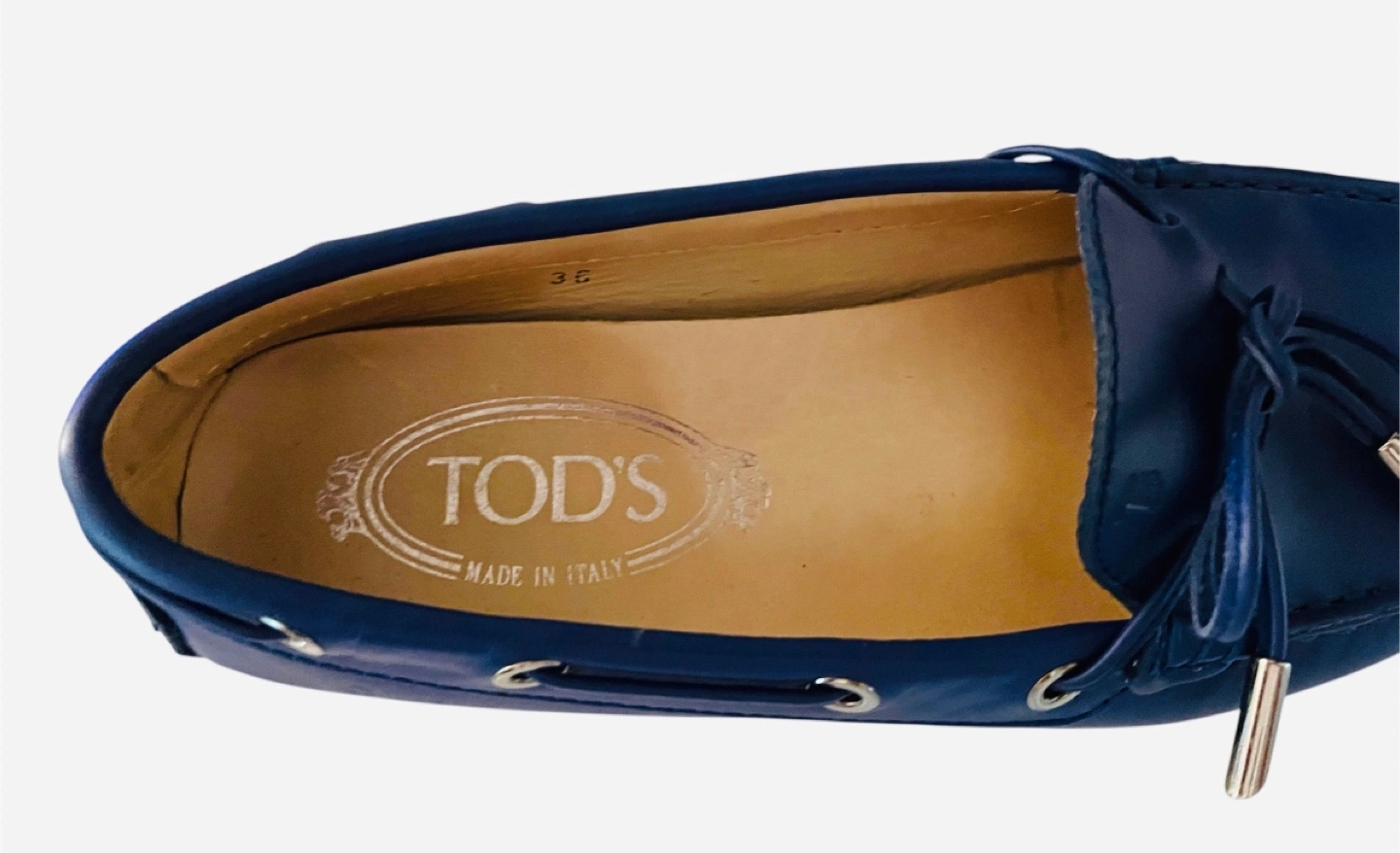 Italian craftsmanship meets effortless style in these stunning driving moccasins. Imagine slipping your feet into the supple leather, the rich blue hue adding a touch of sophistication to any ensemble. The iconic design, complete with delicate tie detailing and silver-tone accents, exudes understated luxury. The meticulously crafted sole provides exceptional comfort and grip, making them perfect for navigating city streets or relaxing on a coastal getaway. These Tod's loafers are the perfect choice for a casual brunch, a weekend road trip, or adding a touch of elegance to your everyday errands. Style: Moccasin Color: Blue Department: Women Upper Material: Leather Features: Comfort, Cushioned, Driving Shoes, Slip On, Lightweight Occasion: Casual, Travel Lining Material: Leather Insole Material: Leather EU Shoe Size: 36 Model: Gommino Driving Moccasins Type: Flat Like New Length of sole 10" Width of sole at ball of foot 3" $500 original price Keywords: Tod's, driving moccasins, boat shoes, leather loafers, Italian shoes, blue shoes, women's shoes, designer shoes, casual shoes, comfortable shoes, size 36, driving shoes women, moccasins, slip on shoes