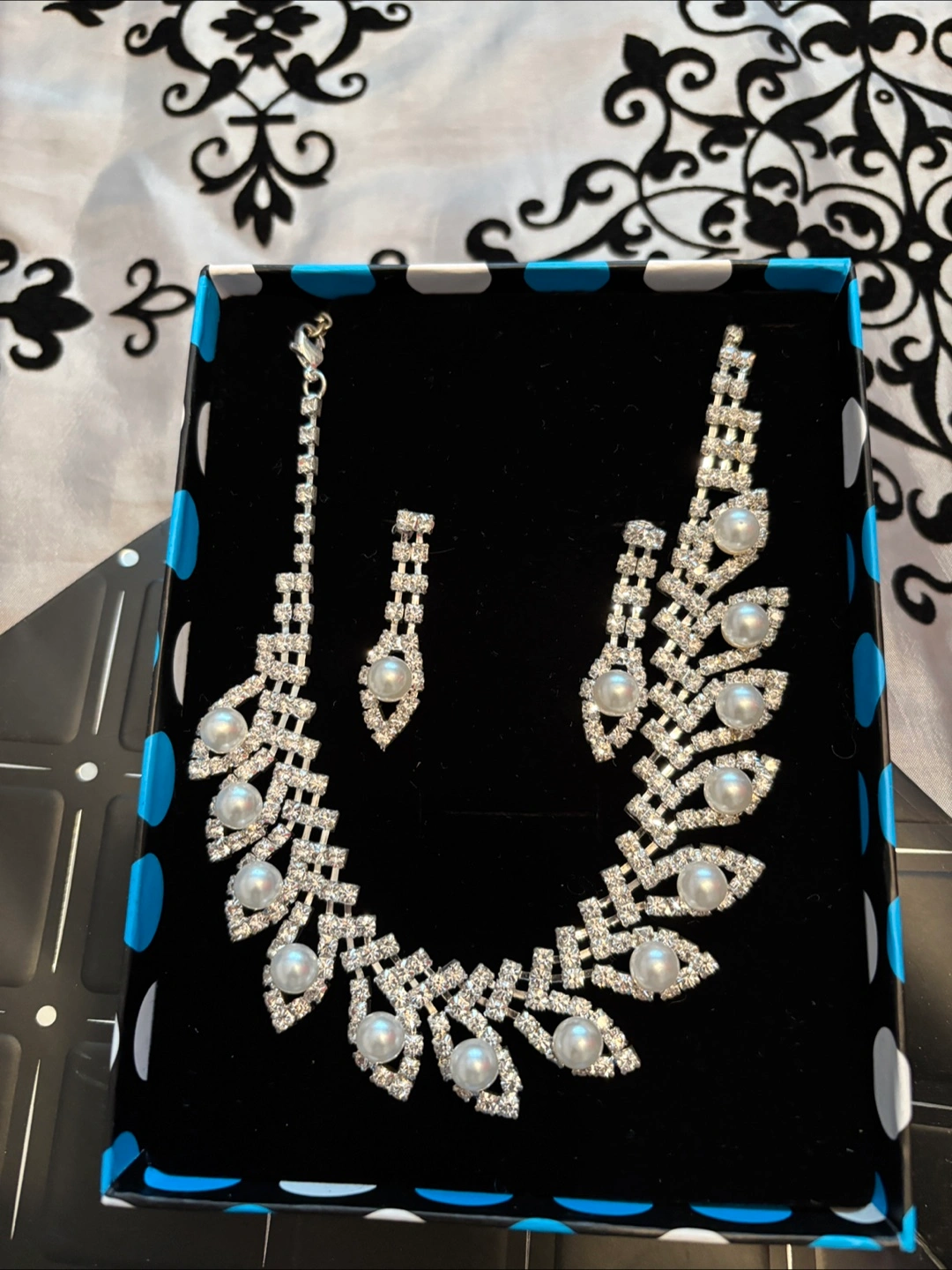Matching necklace and earring set. Features faux pearls and rhinestones. Would look lovely at a wedding or any special occasion.