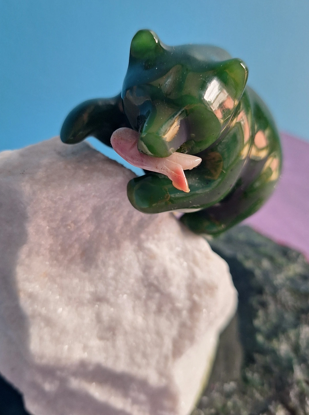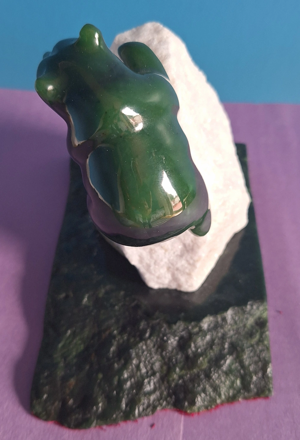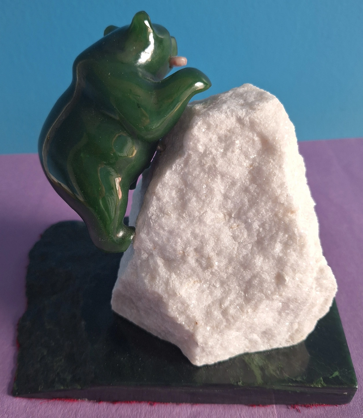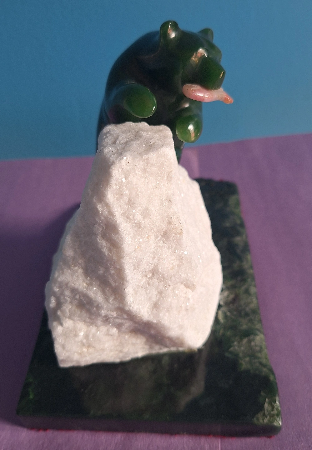 Features a green jade bear statue with salmon in a mouth. The bear appears to be climbing up an iceberg (marble) that mounted on a jade slab. 7x4.5 inch, 6 inch tall, bear itself about 3x1.5 inch. Unique Canadian carved art.
