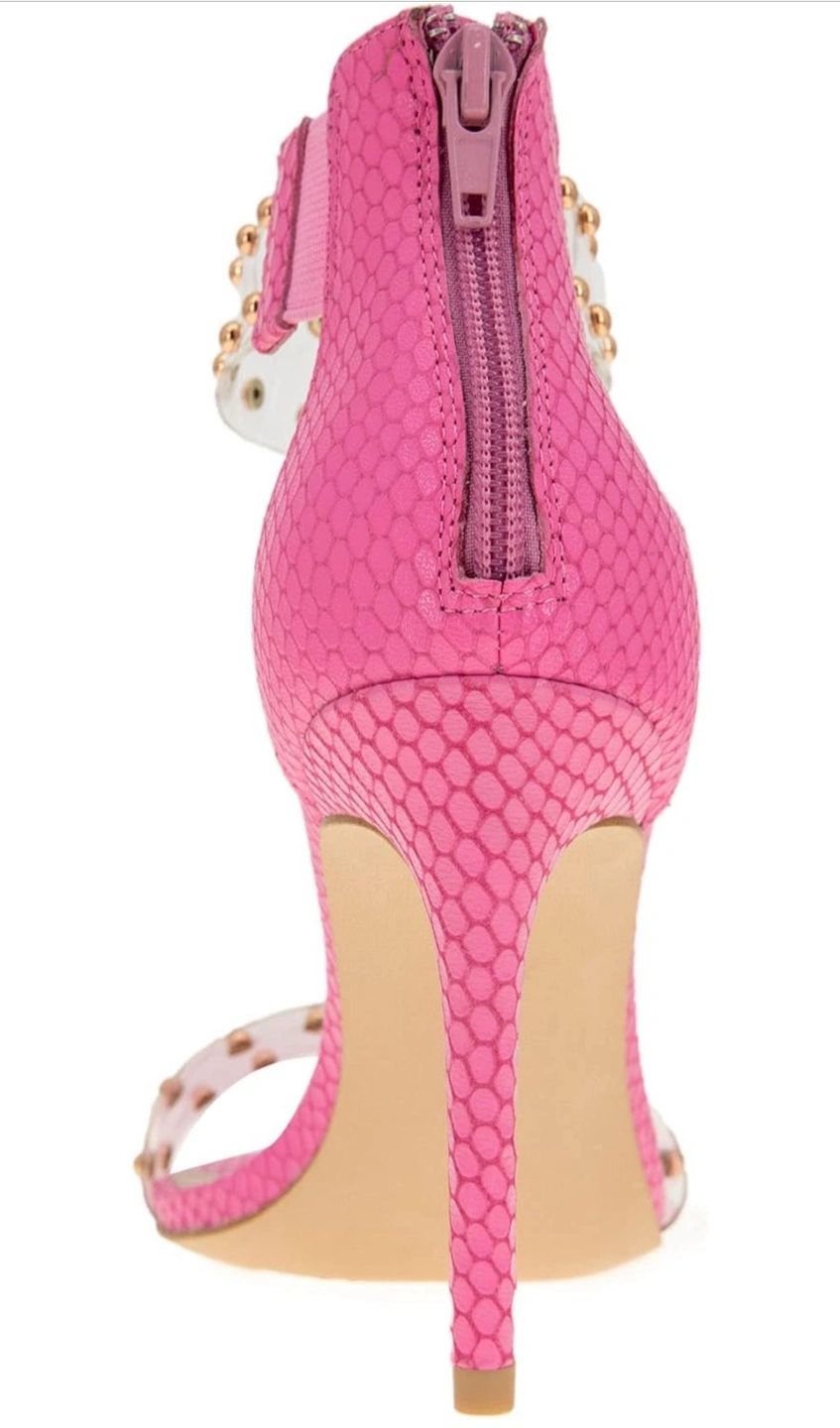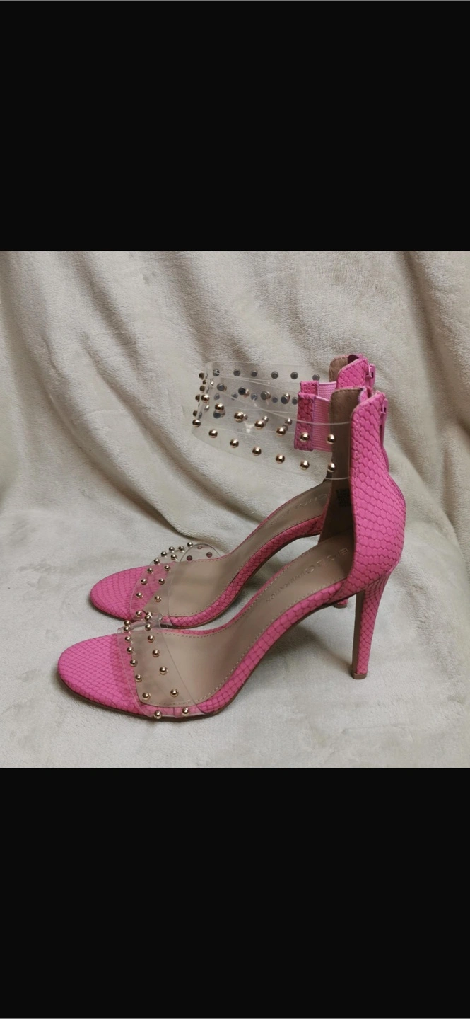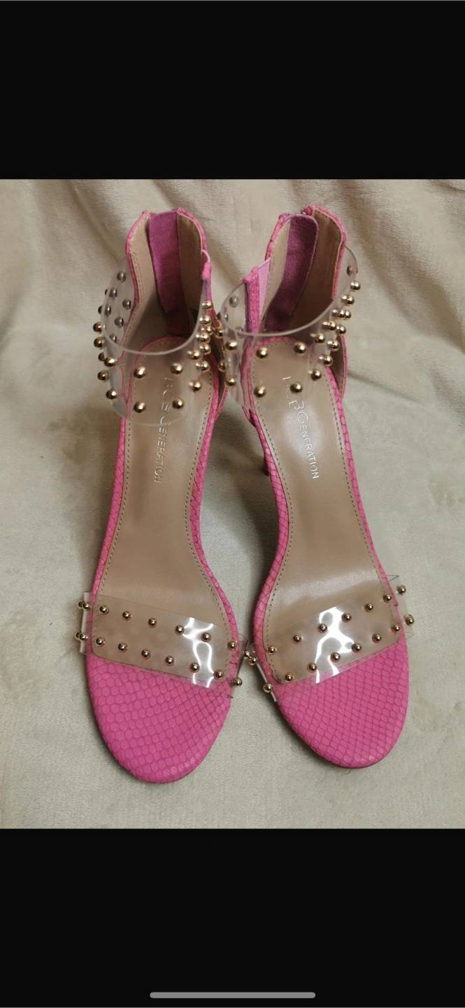 New! Retails for $160 BCBGeneration Jixa Sandal Set some serious fashion standards with the BCBGeneration Jixa sandal. Transparent straps with metallic studs keep this ankle strap sandal in vogue. Back zipper ensures easy entry, while the stiletto heel gives that dramatic lift. Pink heels with an open toe. Transparent strap features metallic studs. Zipper at the back. These shoes are perfect for a night out.