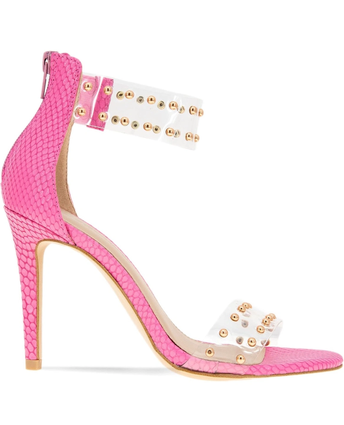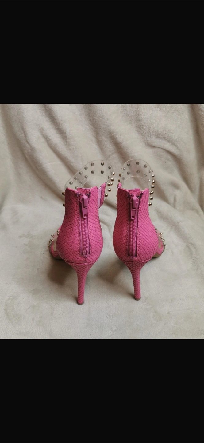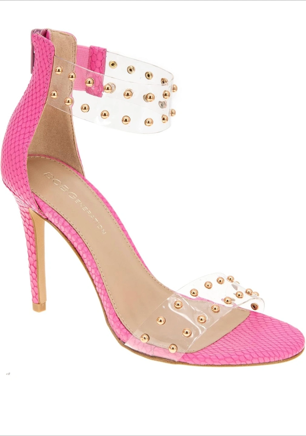 New! Retails for $160 BCBGeneration Jixa Sandal Set some serious fashion standards with the BCBGeneration Jixa sandal. Transparent straps with metallic studs keep this ankle strap sandal in vogue. Back zipper ensures easy entry, while the stiletto heel gives that dramatic lift. Pink heels with an open toe. Transparent strap features metallic studs. Zipper at the back. These shoes are perfect for a night out.