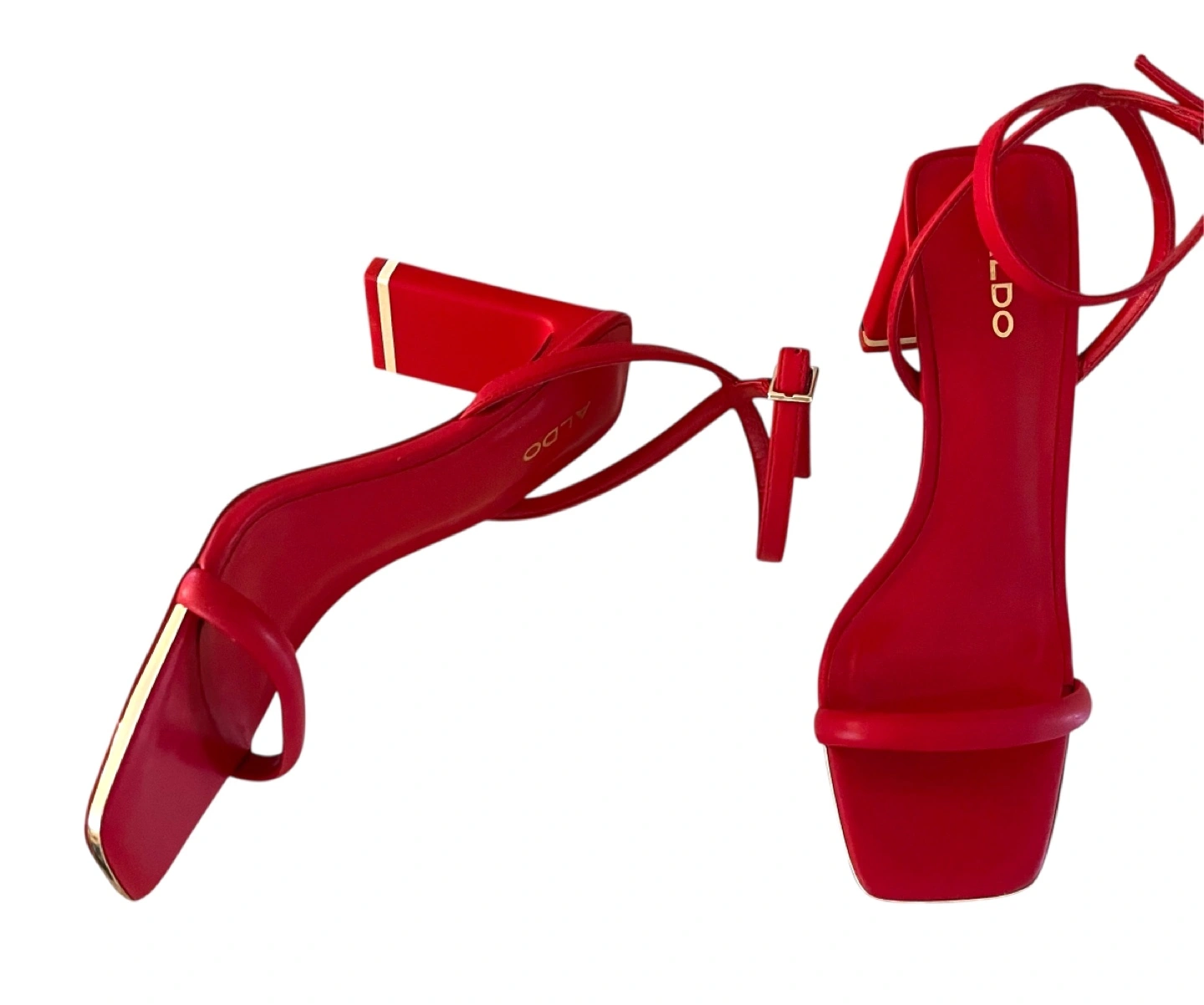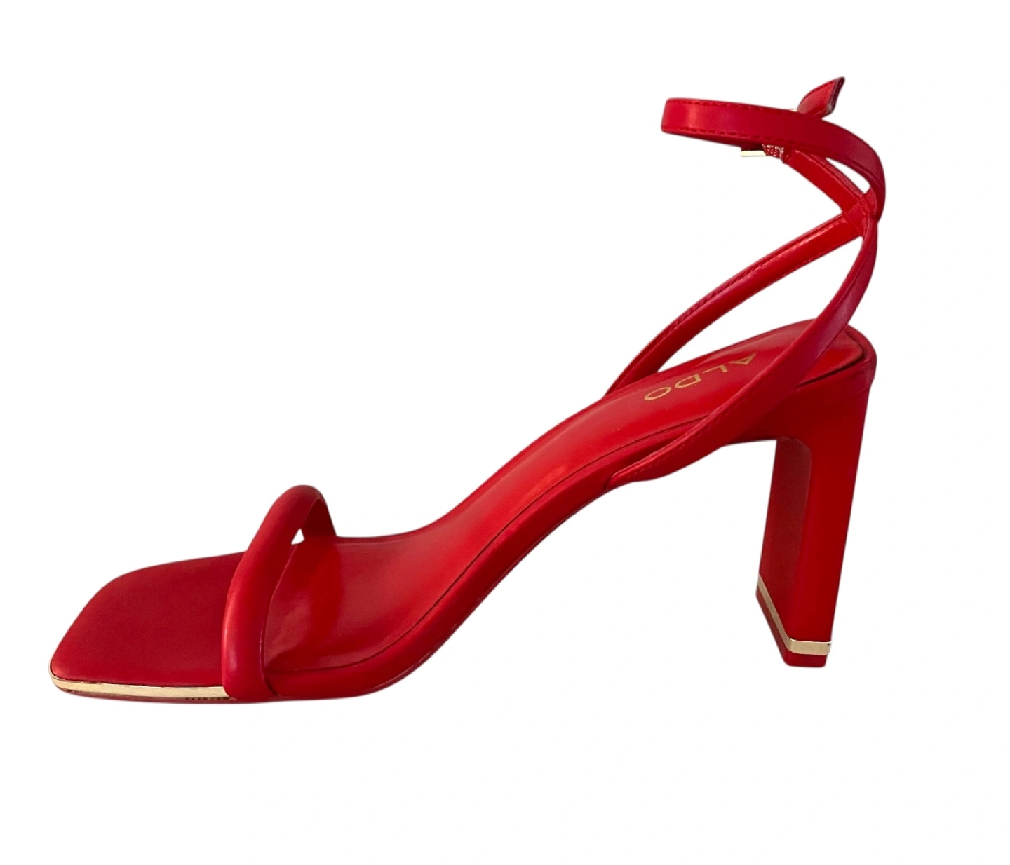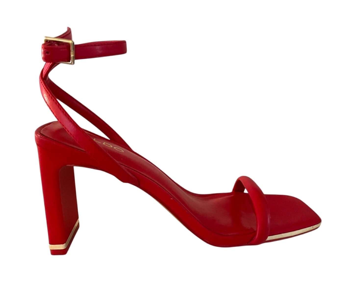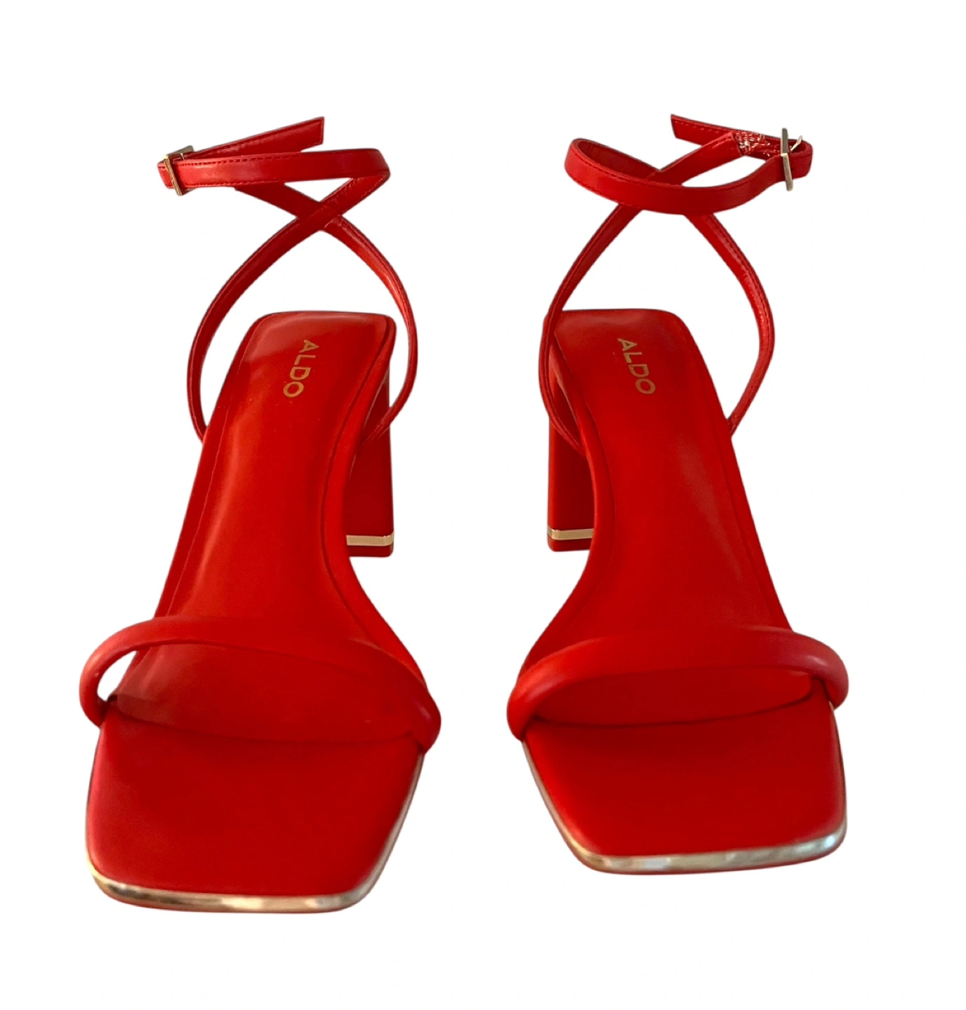 Command attention with these vibrant red ALDO heels. A sleek ankle strap delicately wraps around the ankle, ensuring a secure and flattering fit, while the modern square toe adds a contemporary edge. The sturdy block heel provides stability and elevates your look with confidence. The minimalist design makes them incredibly versatile, easily transitioning from day to night. Imagine yourself stepping out in these heels for a chic cocktail party, a stylish date night, or even adding a pop of color to a sophisticated office ensemble. Color: Red Style: Strappy Department: Women Upper Material: Faux Leather Type: Heel UK Shoe Size: 5.5 Heel Style: Block Toe Shape: Square Toe Pattern: Solid Heel Height: High (3-3.9 in) Closure: Buckle EU Shoe Size: 38.5 Model: Ankle Strap Block Heel Like New Length of sole 10" Width of sole at ball of foot 3.5" PU Ottawa & Strasburg, Kitchener Keywords: ALDO, red heels, ankle strap heels, square toe heels, block heel sandals, women's heels, red sandals, party heels, dressy heels, size 8, contemporary heels, stylish heels, fashion heels, evening heels
