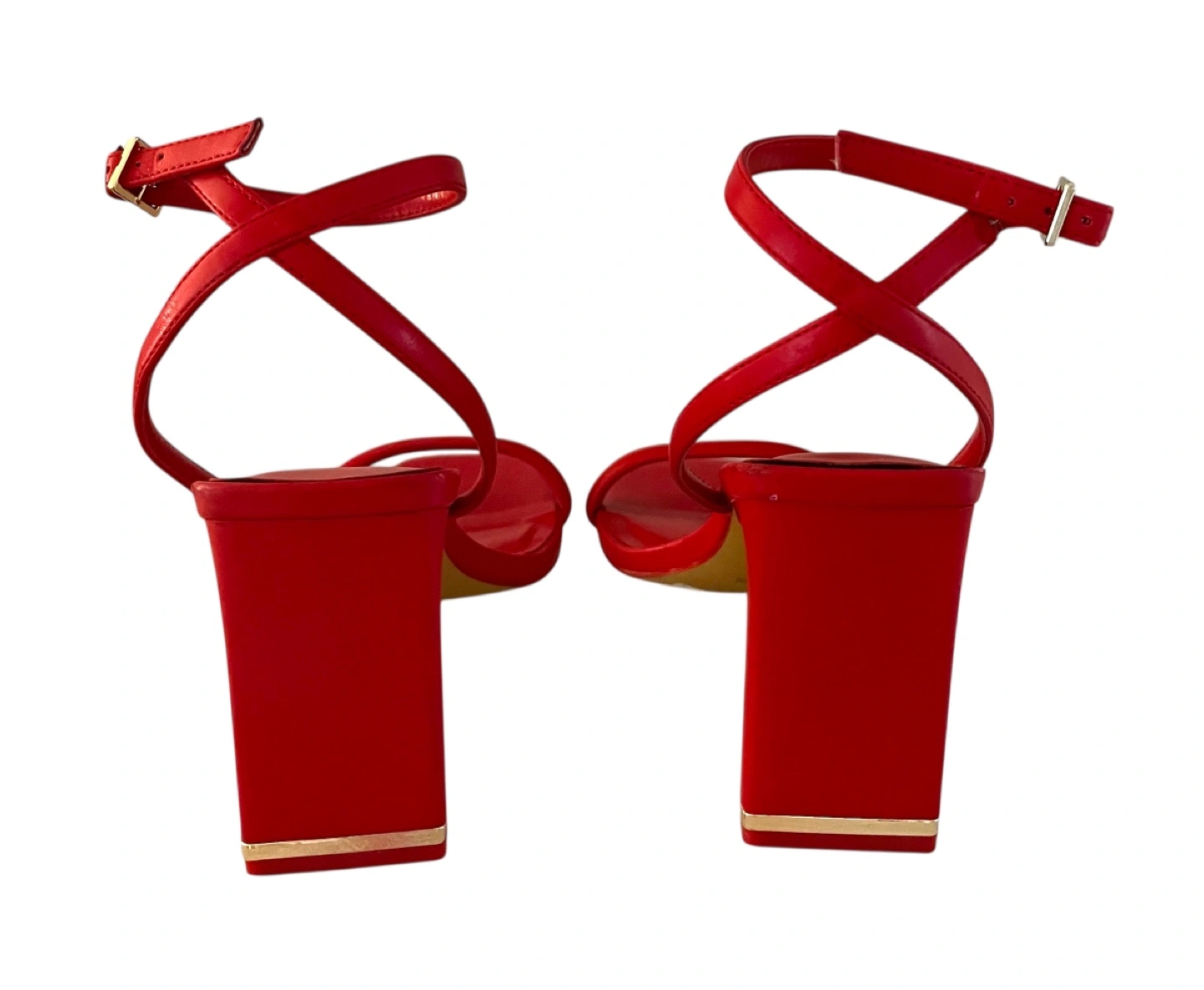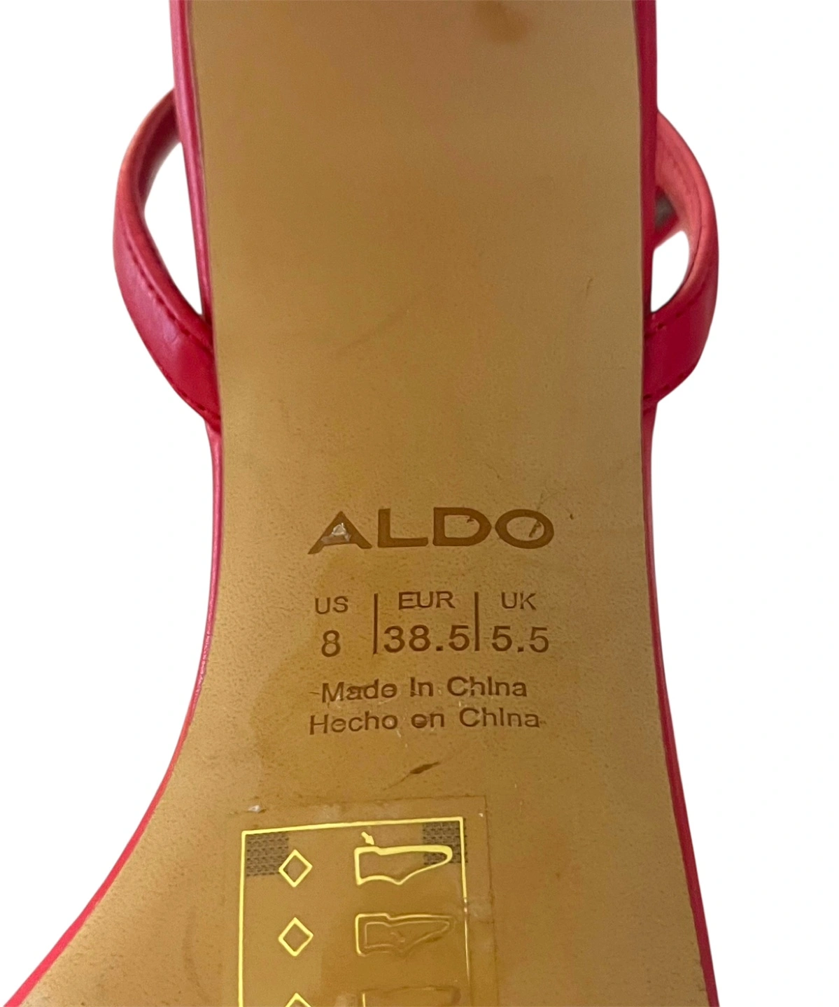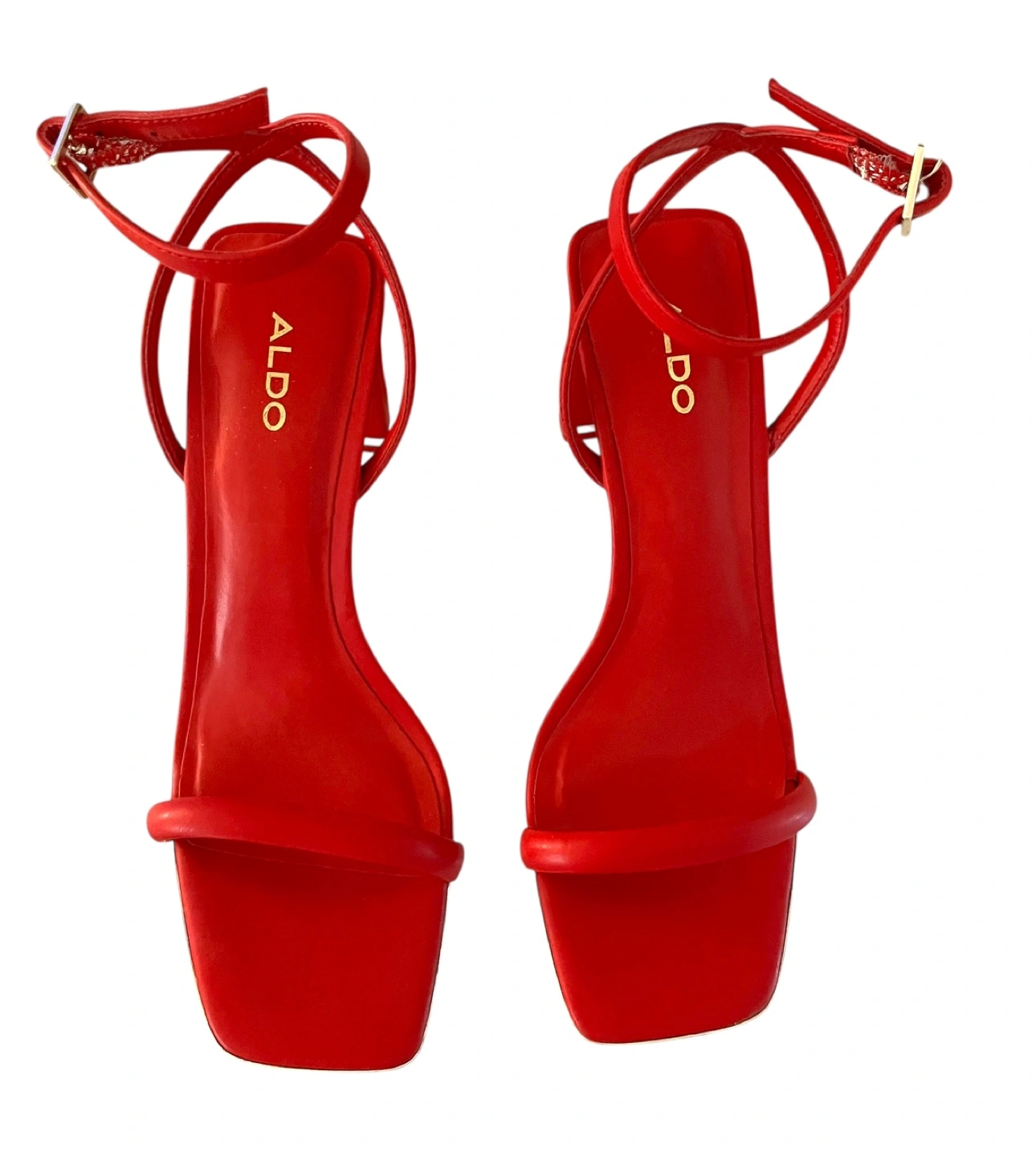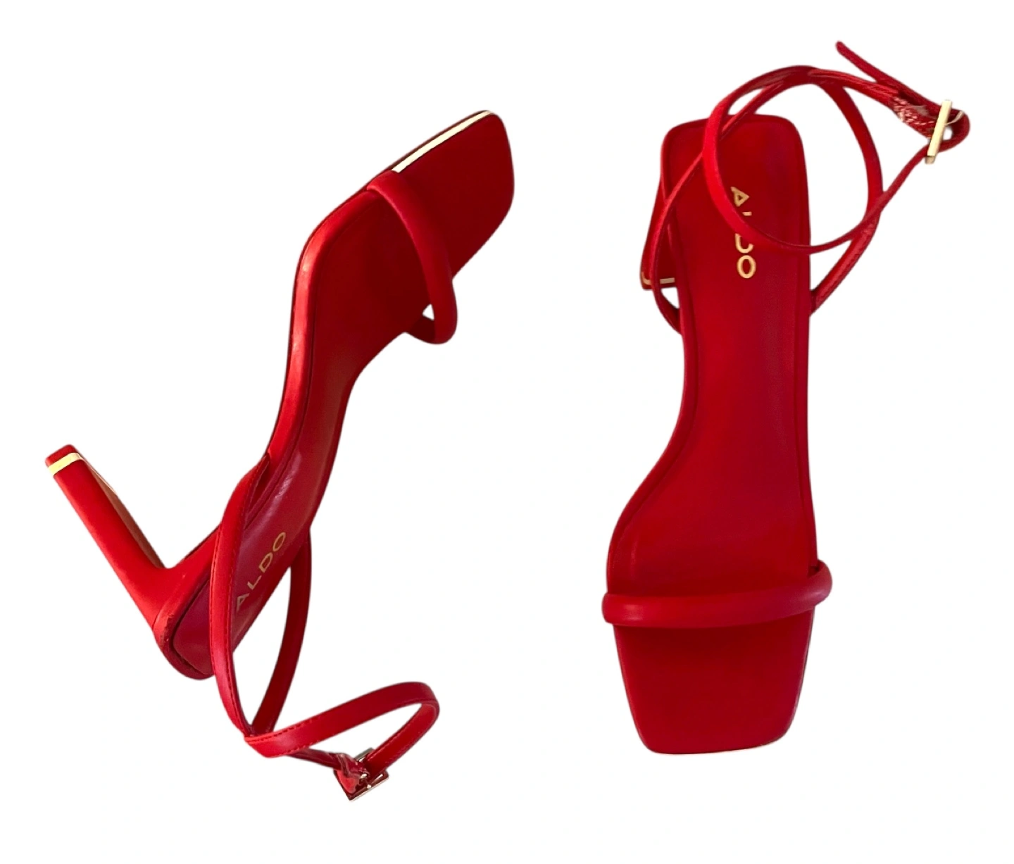 Command attention with these vibrant red ALDO heels. A sleek ankle strap delicately wraps around the ankle, ensuring a secure and flattering fit, while the modern square toe adds a contemporary edge. The sturdy block heel provides stability and elevates your look with confidence. The minimalist design makes them incredibly versatile, easily transitioning from day to night. Imagine yourself stepping out in these heels for a chic cocktail party, a stylish date night, or even adding a pop of color to a sophisticated office ensemble. Color: Red Style: Strappy Department: Women Upper Material: Faux Leather Type: Heel UK Shoe Size: 5.5 Heel Style: Block Toe Shape: Square Toe Pattern: Solid Heel Height: High (3-3.9 in) Closure: Buckle EU Shoe Size: 38.5 Model: Ankle Strap Block Heel Like New Length of sole 10" Width of sole at ball of foot 3.5" PU Ottawa & Strasburg, Kitchener Keywords: ALDO, red heels, ankle strap heels, square toe heels, block heel sandals, women's heels, red sandals, party heels, dressy heels, size 8, contemporary heels, stylish heels, fashion heels, evening heels