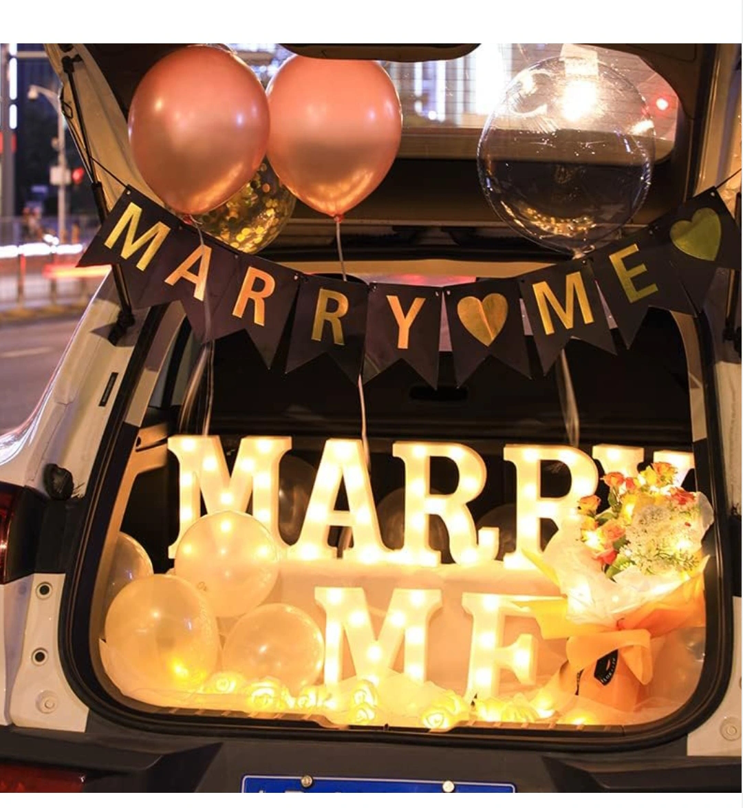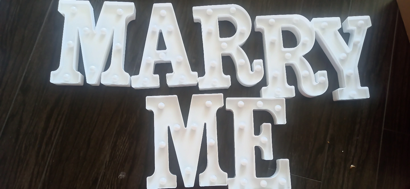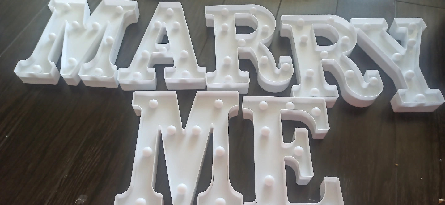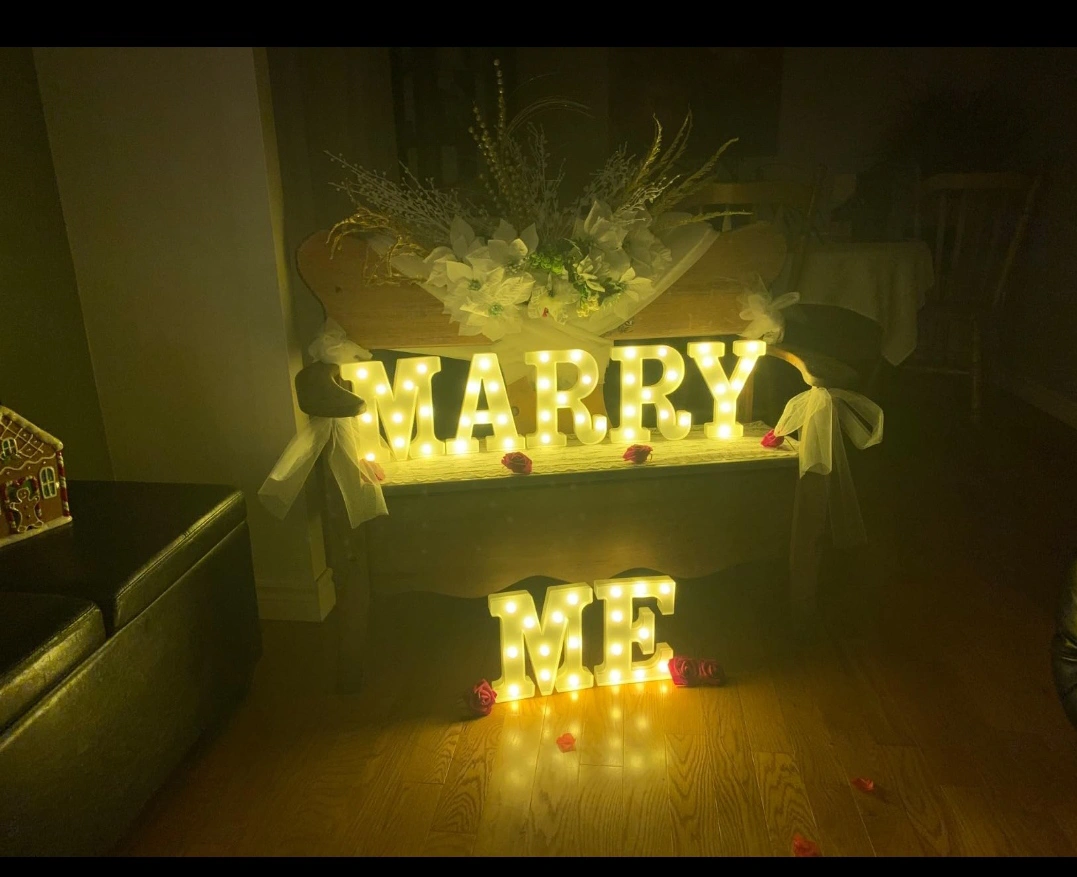 Letters light up. Spelling out the words 'MARRY ME'. Makes a charming statement. You can use these to add light to your home decor.