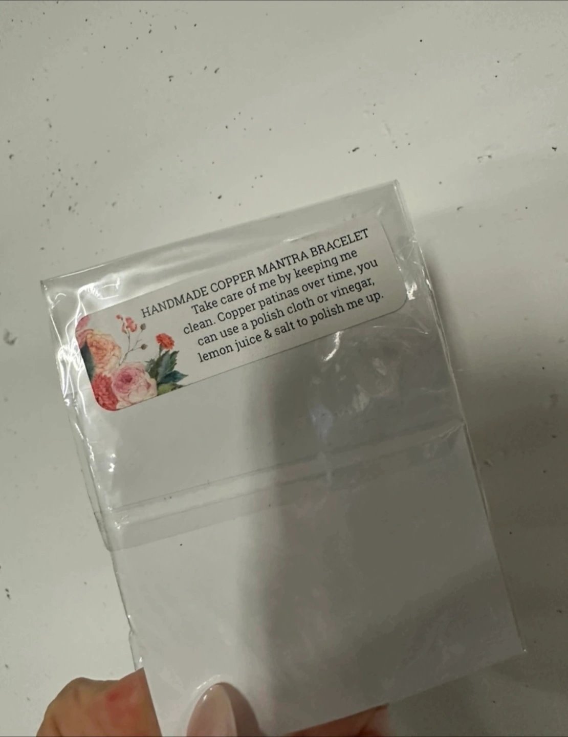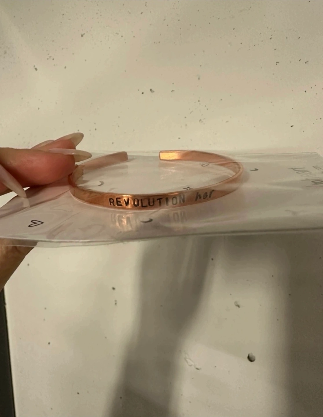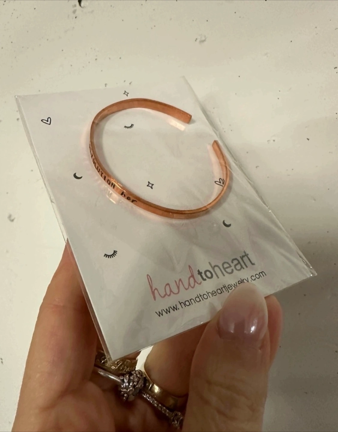 A copper-coloured bracelet. It is in its original packaging. A great way to add a small, meaningful piece to your collection.