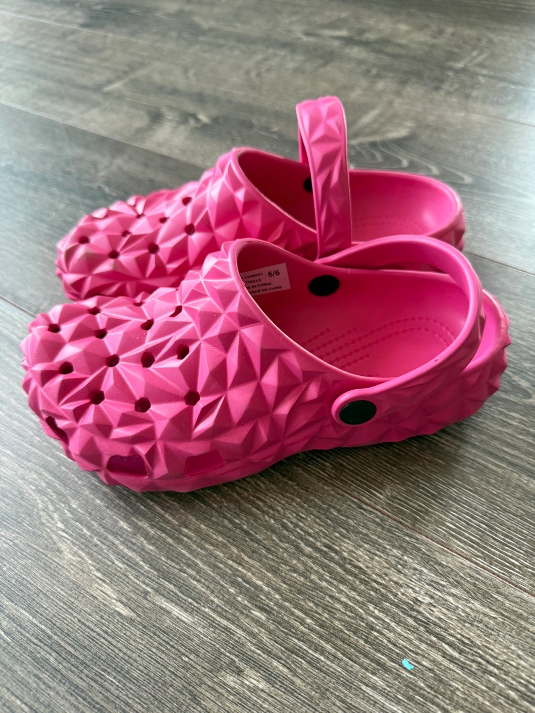 Bright pink clogs. Textured material with holes throughout the shoe. Great for relaxing on a warm day.