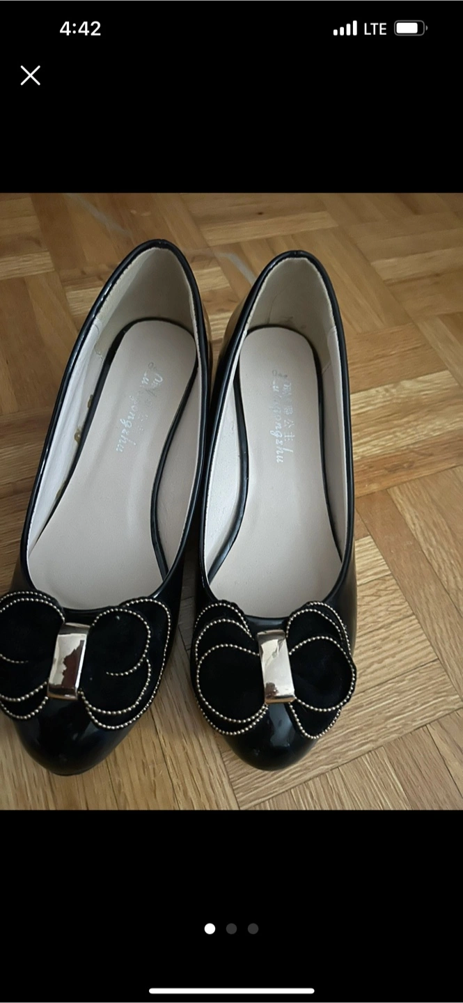 Black flats with a shiny finish. Features decorative bows with gold accents. These shoes are perfect for a walk in the park.