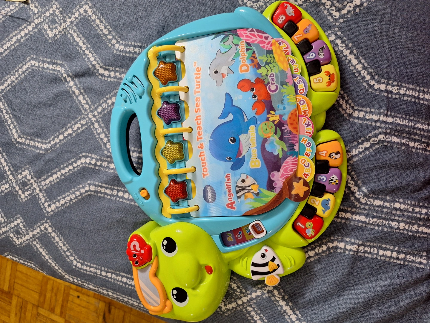 A fun, interactive toy. Shaped like a sea turtle. Contains various buttons and a book with colourful images. A great item to keep kids entertained while learning.