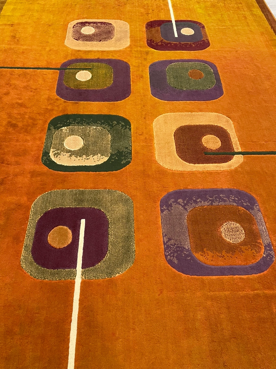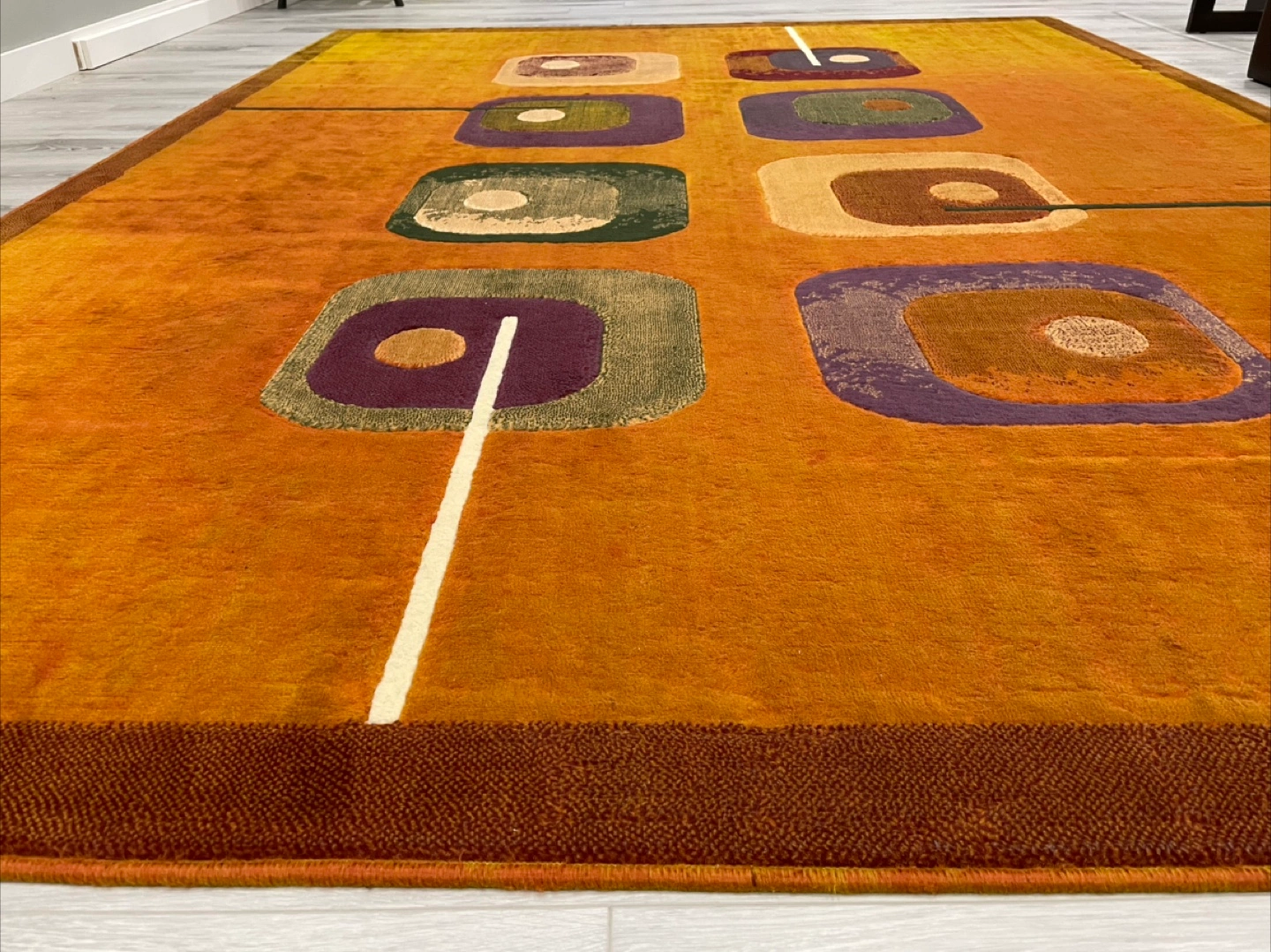 Area rug with geometric design. Features a repeating pattern of squares and circles in multiple colours. A great rug for cozying up in any living space. The rug is in great condition and has been cleaned with a wet vacuum.