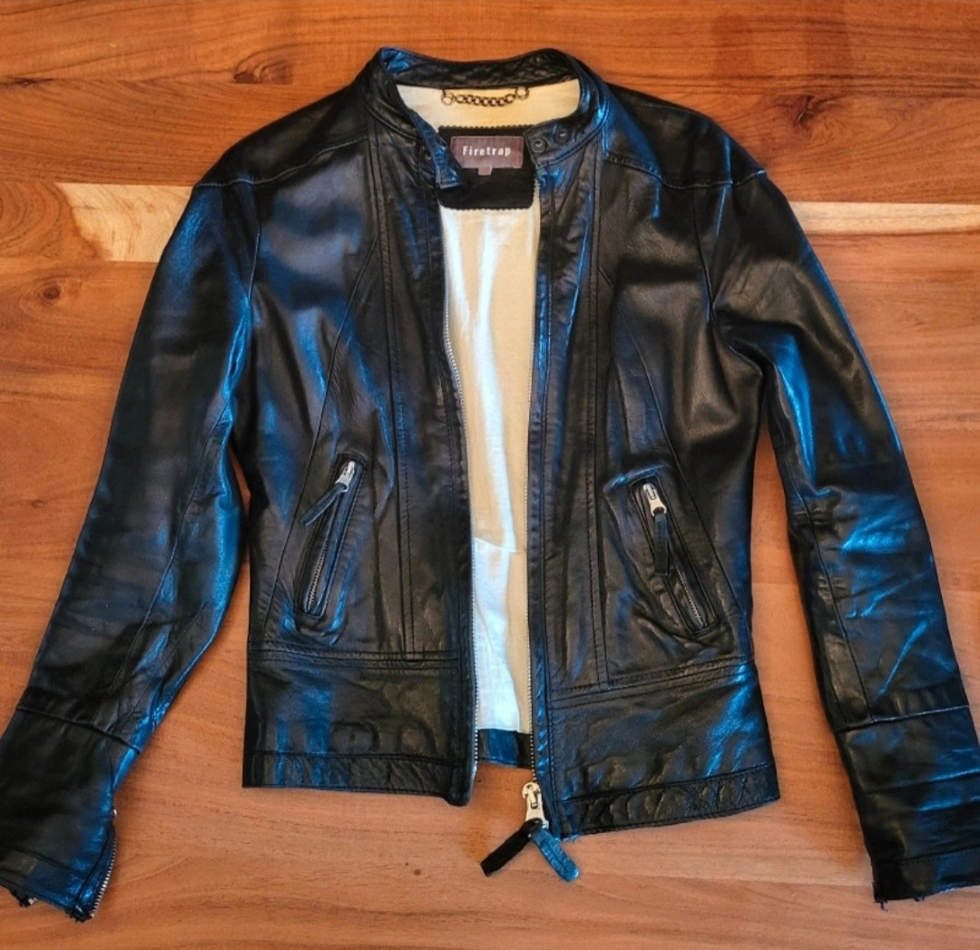 Original Firetrap 100% leather women's black vintage motorcycle jacket bought in London, UK. Design: Stand collar leather jacket, classic fit and windproof. Biker style. Perfect coat to wear in spring and fall. Warm, stylish and timeless. Front smooth zip-up closure. Solid hardware. Two side zip pockets. Occasion: Daily casual wear, holidays, travel outfit, party wear, outdoor activities. All seasons, suitable for autumn, winter, spring, and cool summer nights. Great condition, no damage. A few marks on the inner lining, could use a dry clean. See photos for accurate description. Pick up at College and Shaw. Check out my other listings that might be of interest.