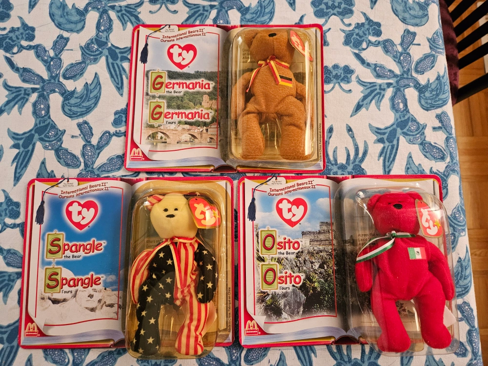 Oh, fashioned, mcdonald's co branded beanie babies toys still sealed in their original packaging. Some of the packaging have yellowed due to age, but all are in near perfect condition. This was part of a collaboration with mcdonald's 25 years ago! Nice piece of nostalgia $5 for each and $12 for all 3!