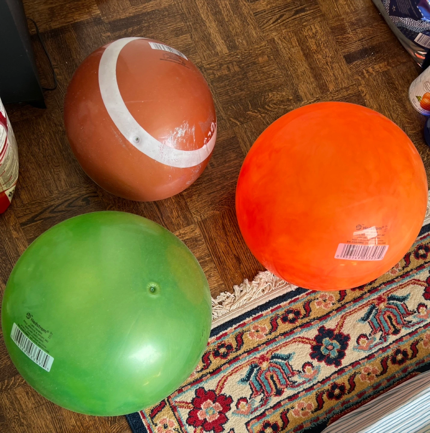 Various brightly coloured balls. One ball in orange. One ball in green. One ball in brown with white stripe. These balls can provide a great, low impact workout.