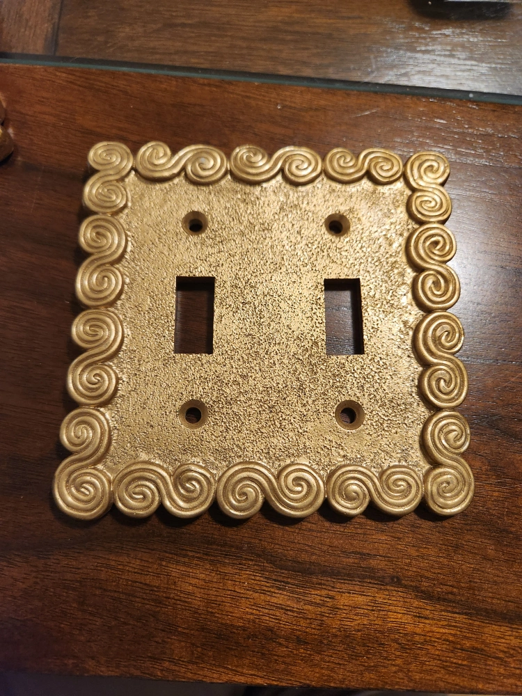 A light switch cover. Features a gold finish. Decorated with an elegant swirled design. It will definitely give your home a touch of class.