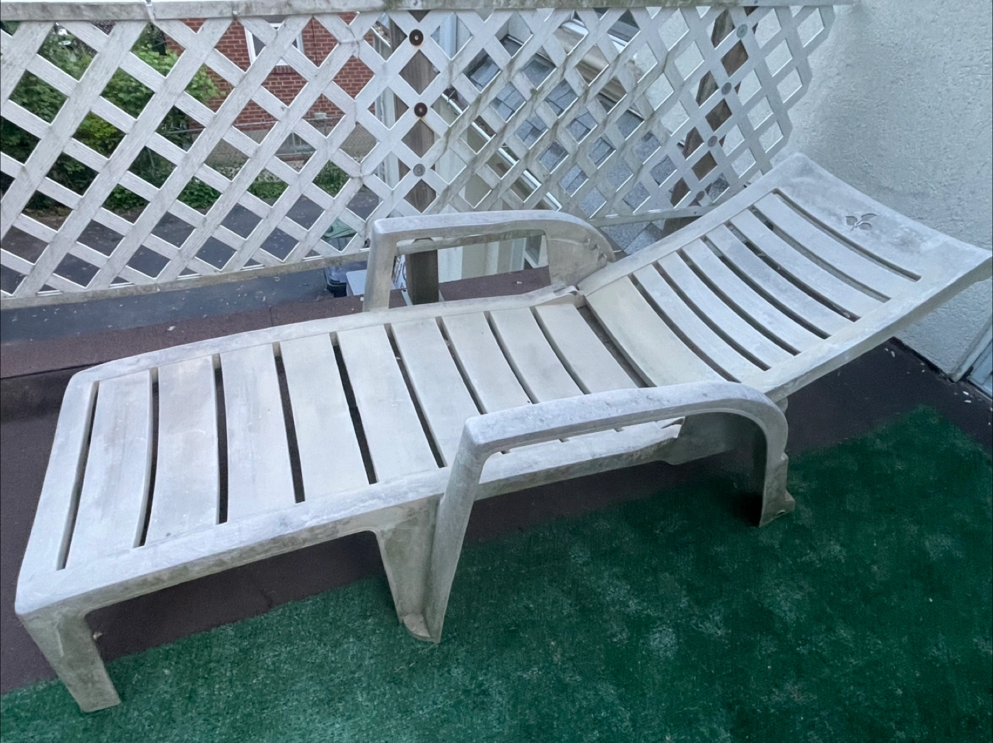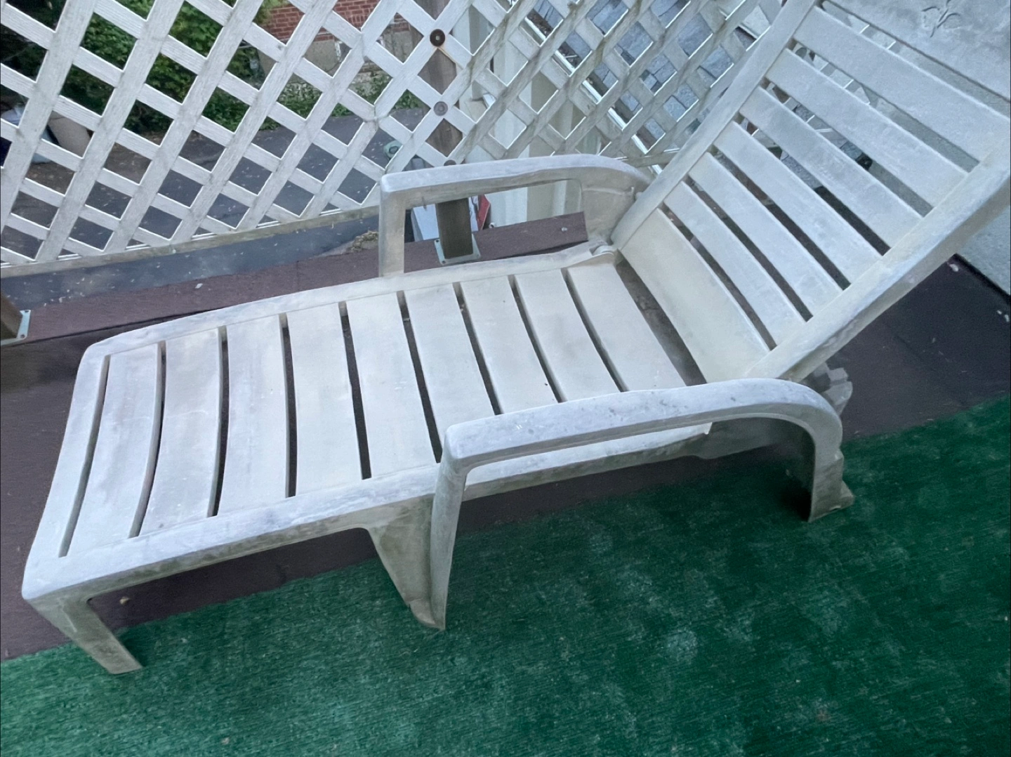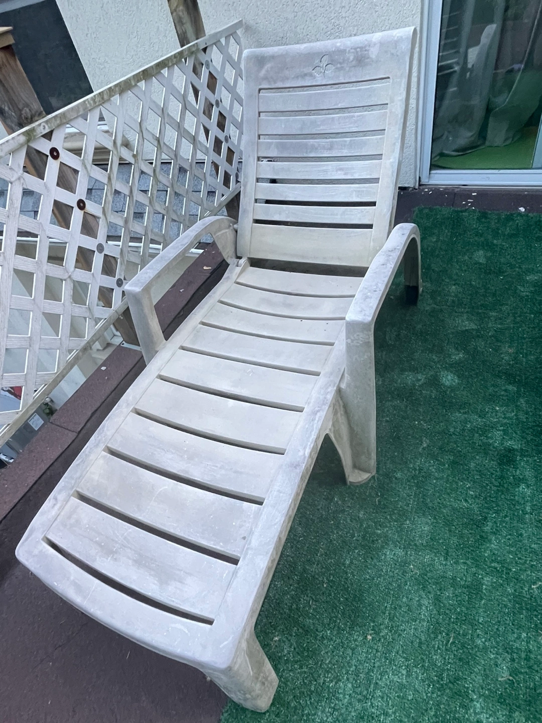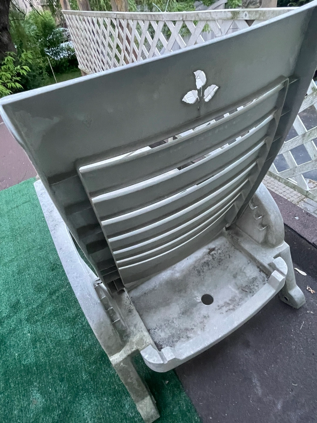 A lounging chair with an arched design. The back of the chair has a decorative floral design. It is made from a light-coloured, durable material. Consider enjoying the outdoors from the comfort of this chair.