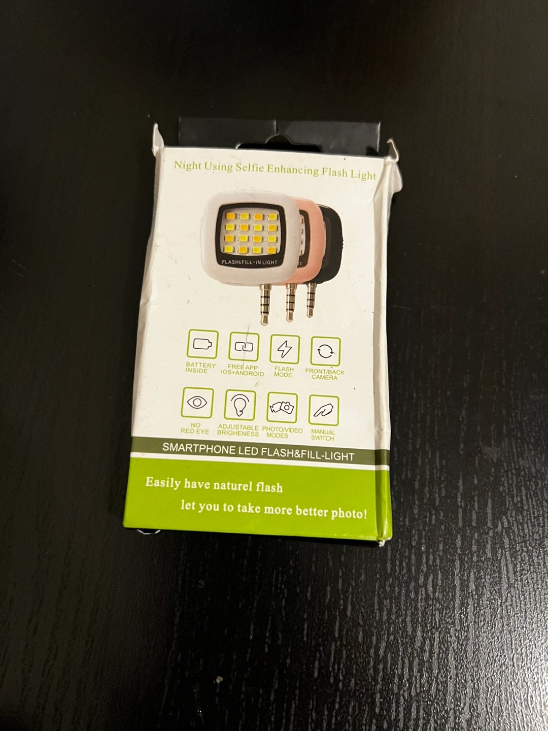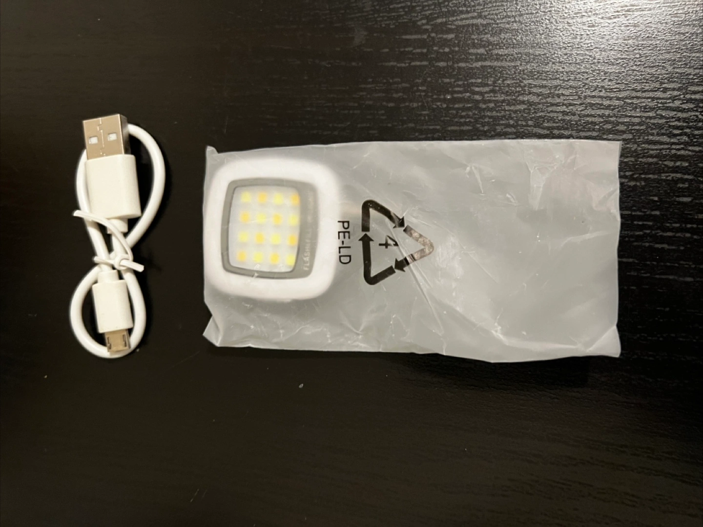Small, white smartphone flash light. It includes a USB cable. Comes with the original packaging. Perfect for enhancing your photos with ease.